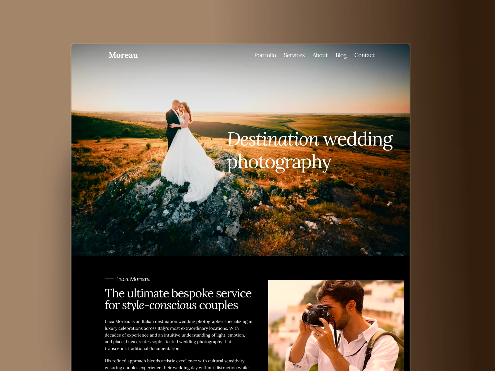 Project Overview Luca Moreau needed a digital experience that could translate the breathtaking beauty of Tuscan vineyards and Amalfi Coast sunsets into immediate emotional impact. The challenge was making couples fall in love with the service before they even know the price, while maintaining fast loading speeds despite stunning high-quality imagery.
