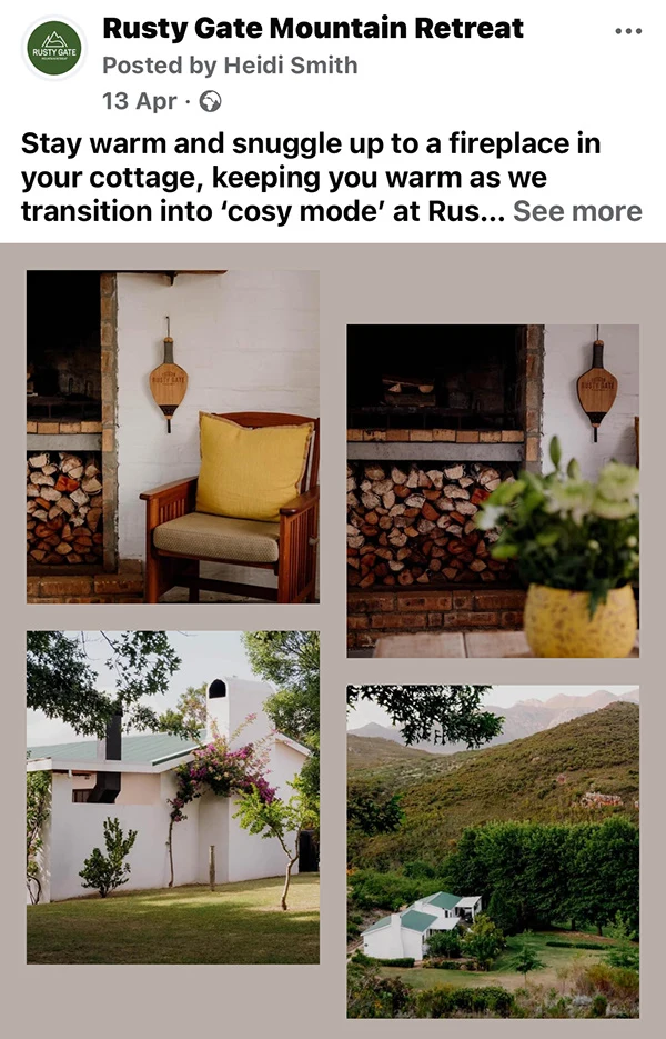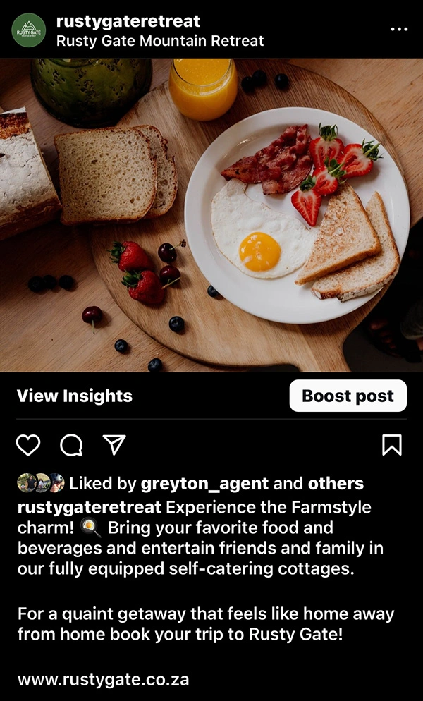 Created nature-focused content and visuals for Rusty Gate, highlighting its wildlife, serenity, and charm—boosting visibility and attracting niche audiences.