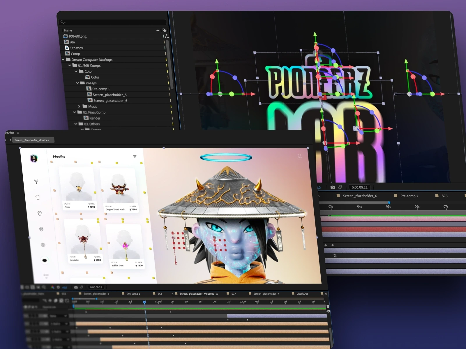 For some of the UI demonstrations each scene was composed and animated within Ae. This included UI element transitions, interaction simulations, and camera movements to enhance visual storytelling and bring the interface to life.