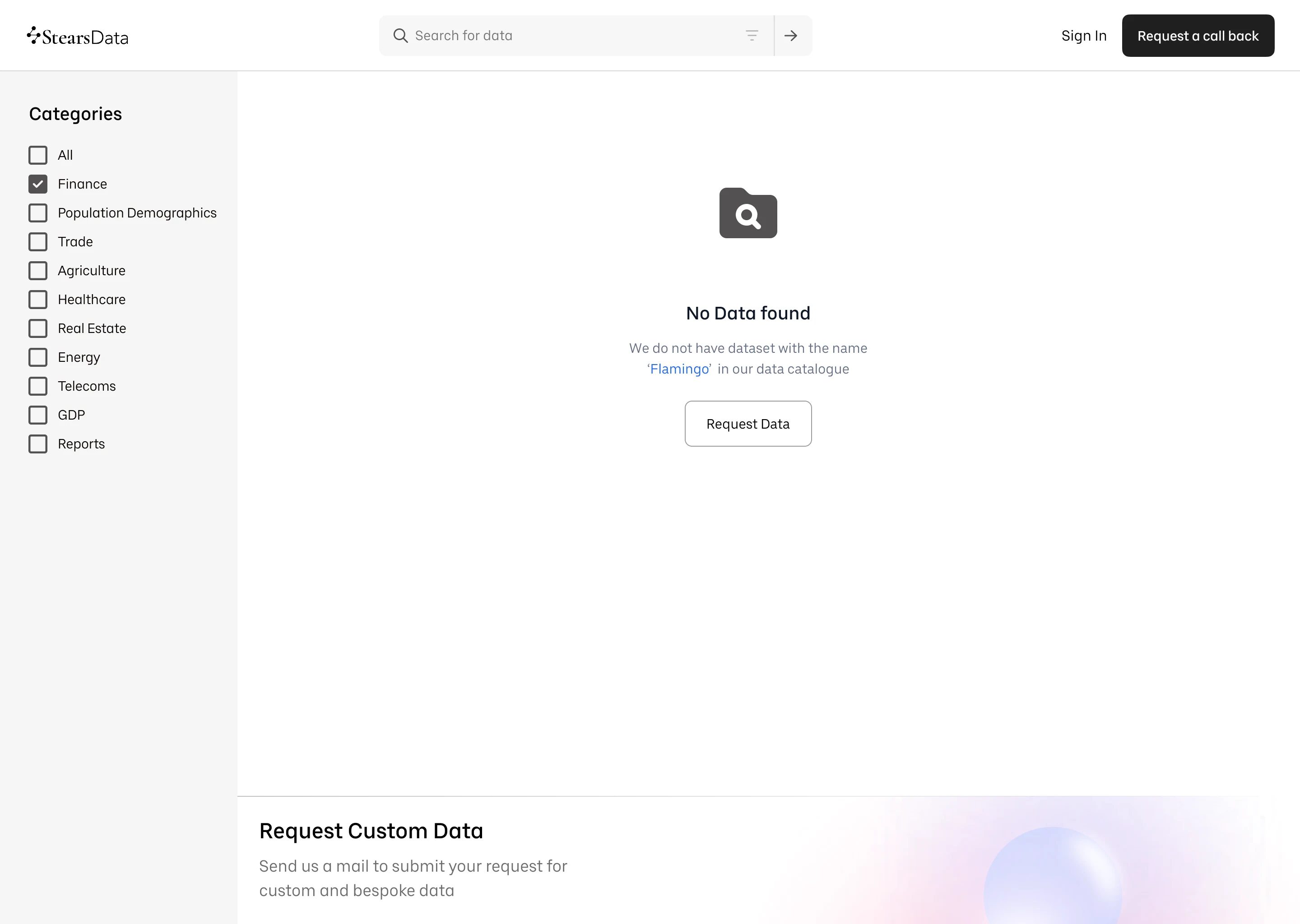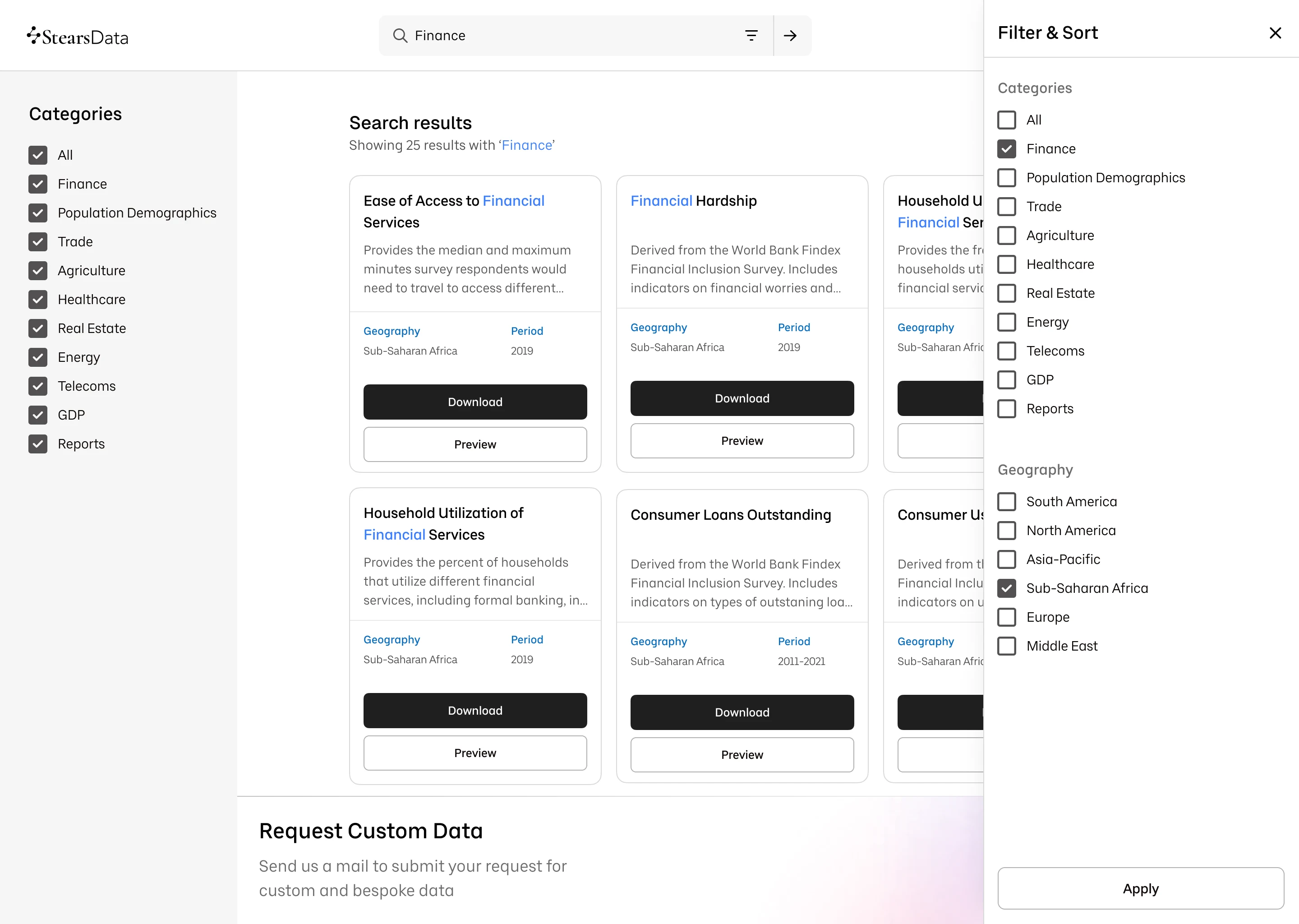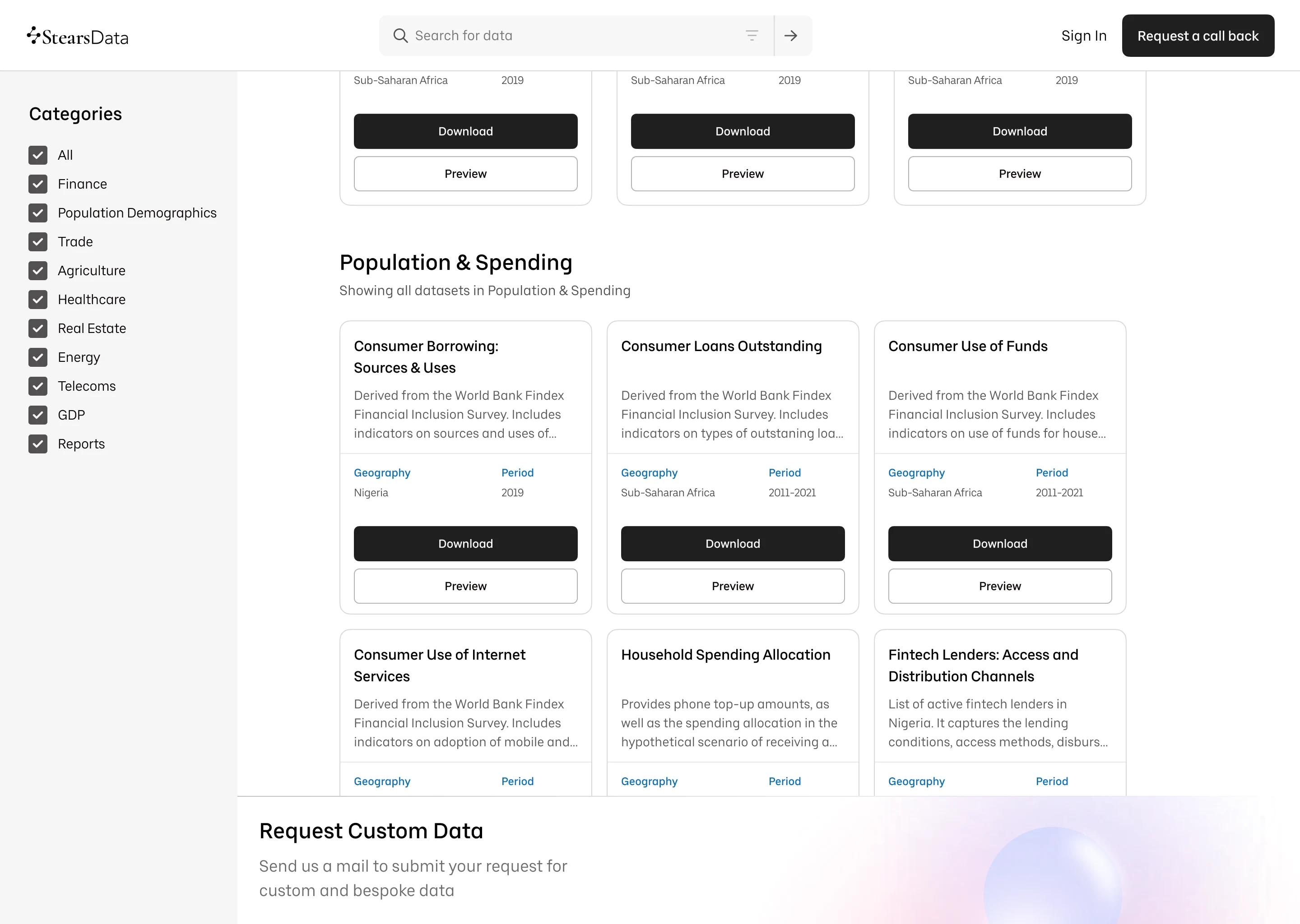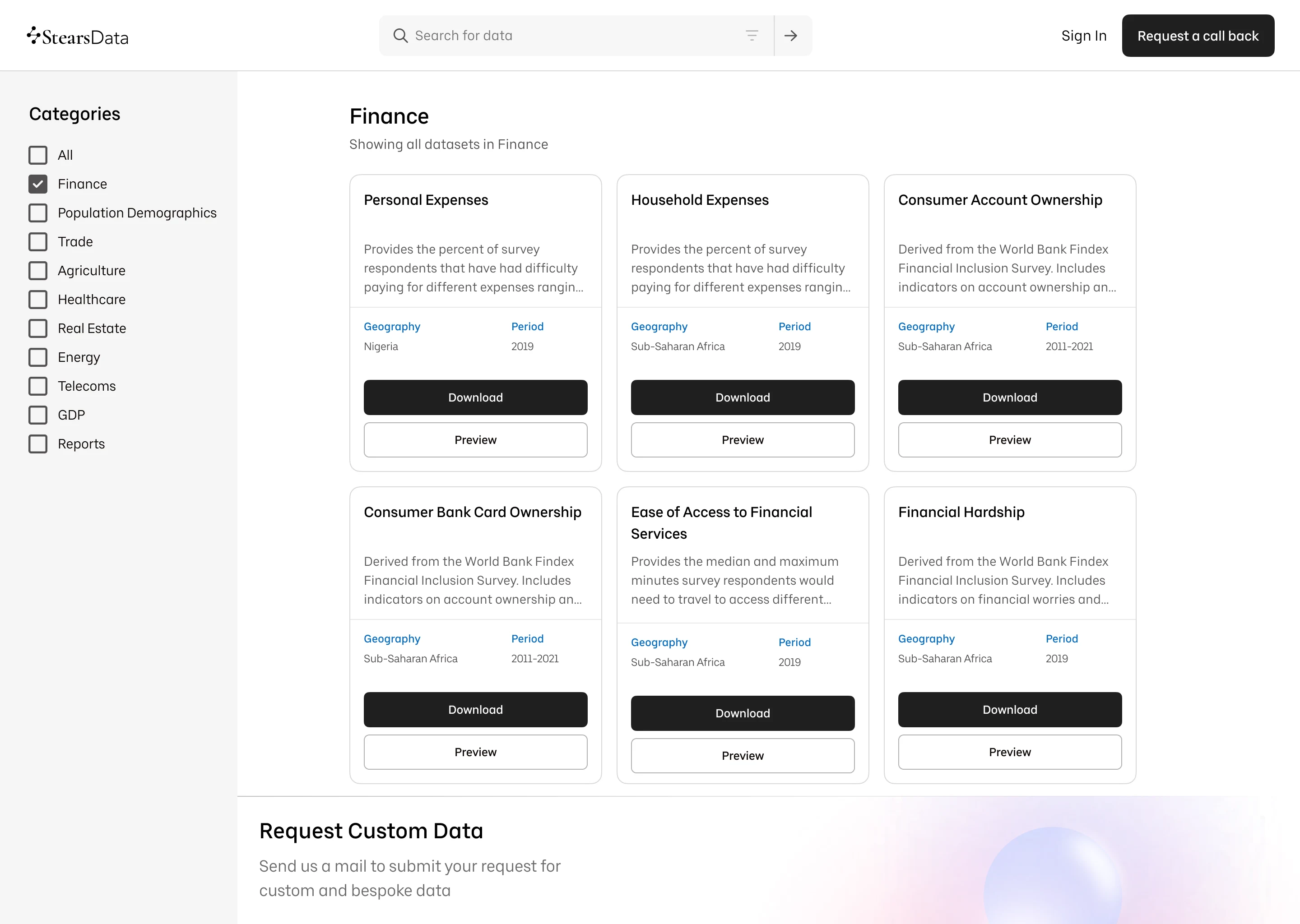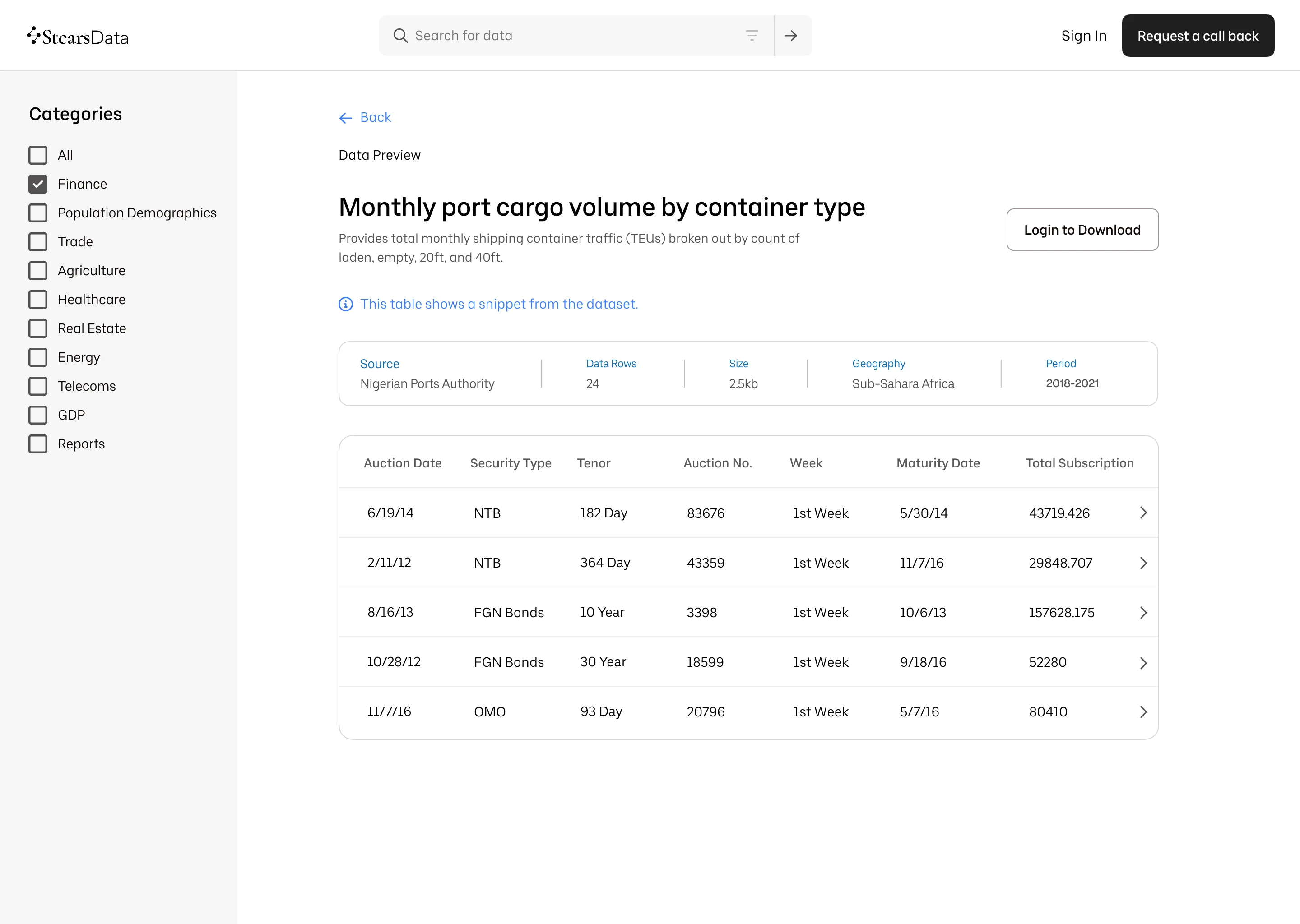 Stears had economic data for investors/bankers but no sales platform. I designed SaaS for access to datasets. Tiered access, data preview, flexible exports