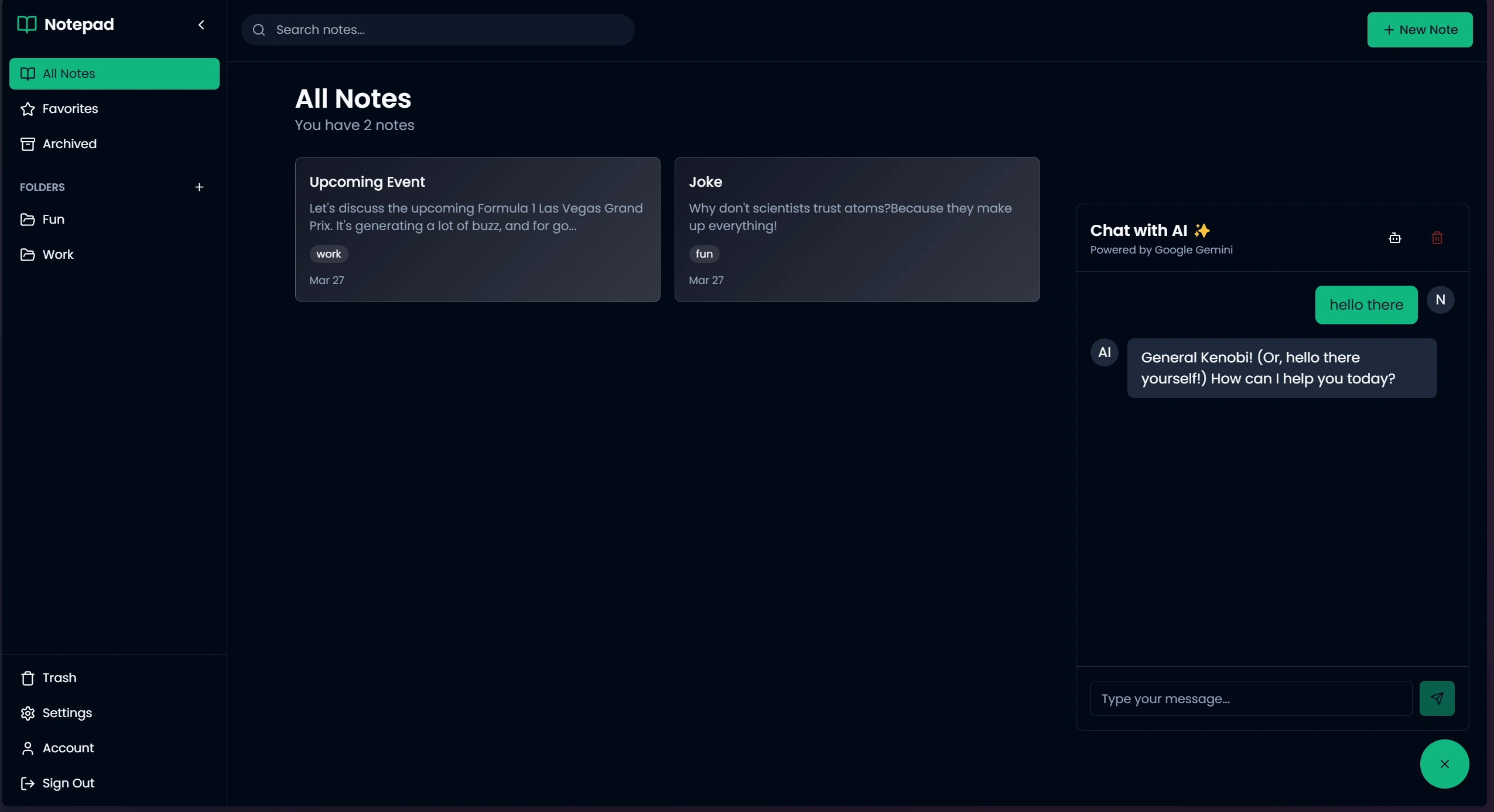 A note taking platform made using Lovable.dev with the following features: - Text editor - AI Assistant - Folder creation - Appearance and theme color control