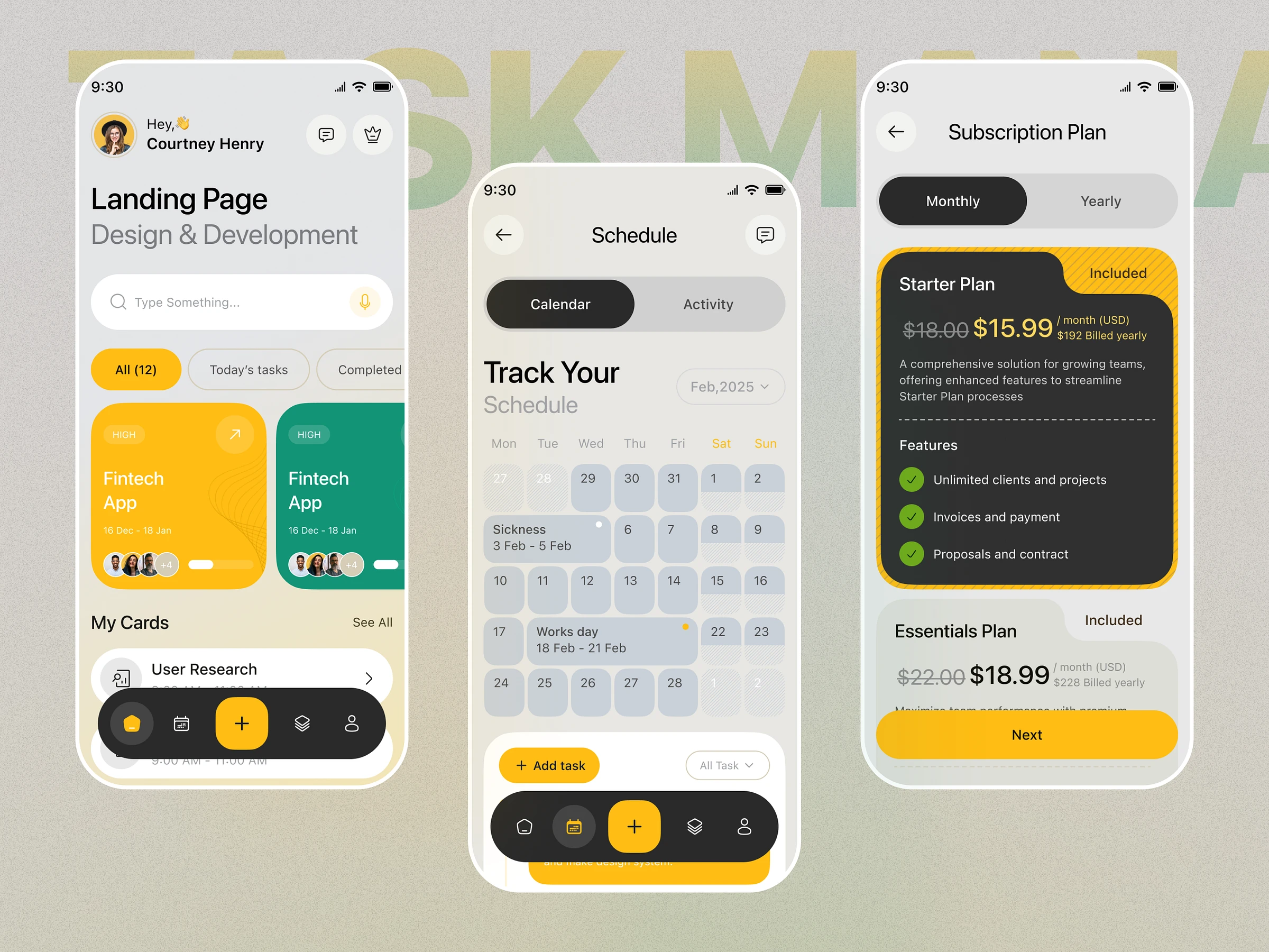 The design includes a task dashboard, calendar scheduling, and a subscription plan screen, creating a complete and practical to-do list experience for personal and work use.