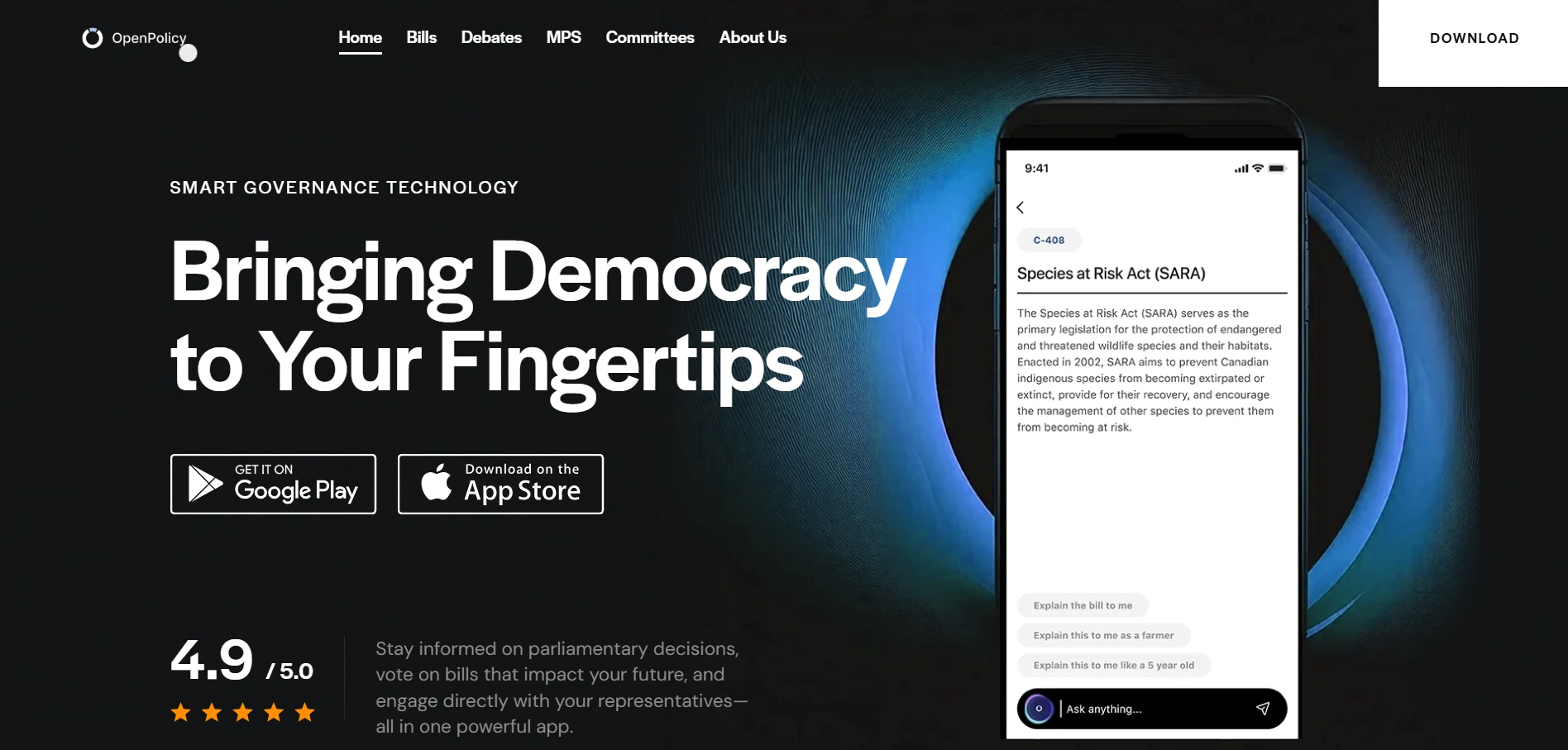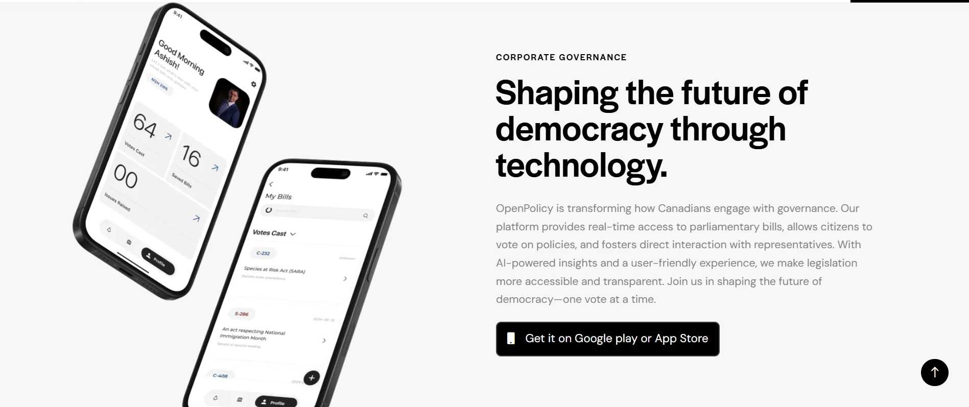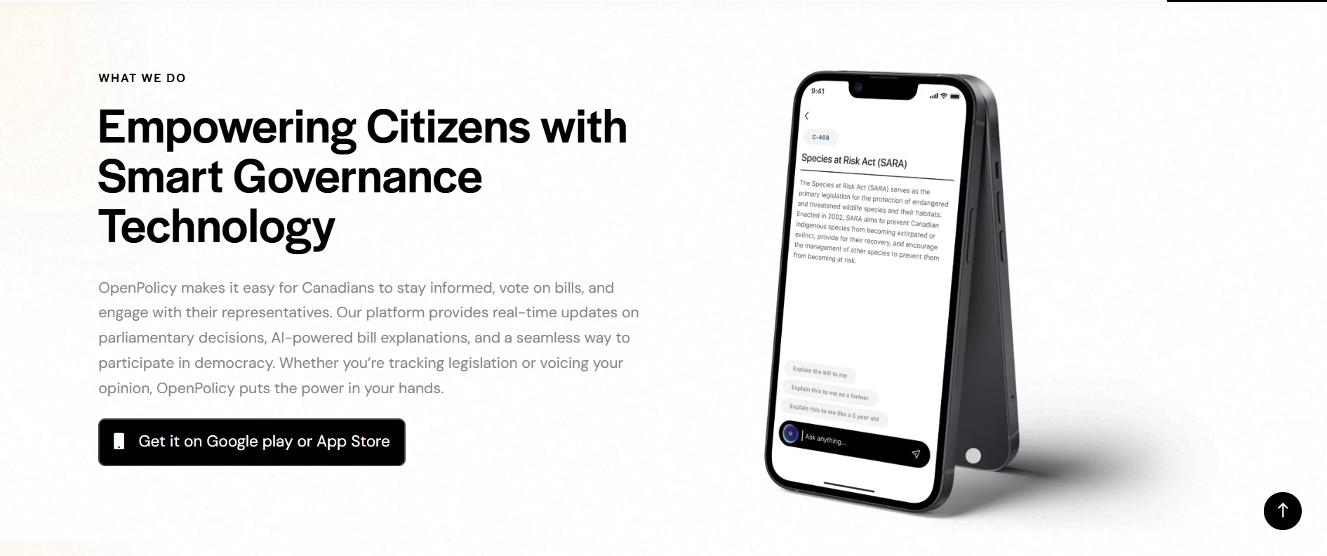 OpenPolicy is transforming how Canadians engage with governance. Our platform provides real-time access to parliamentary bills, allows citizens to vote on policies, and fosters direct interaction with representatives. With AI-powered insights and a user-friendly experience, we make legislation more accessible and transparent. Join us in shaping the future of democracy—one vote at a time.