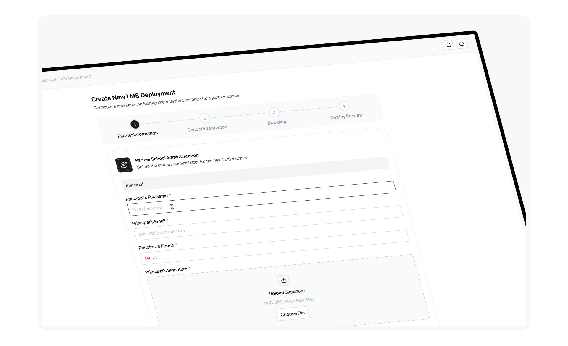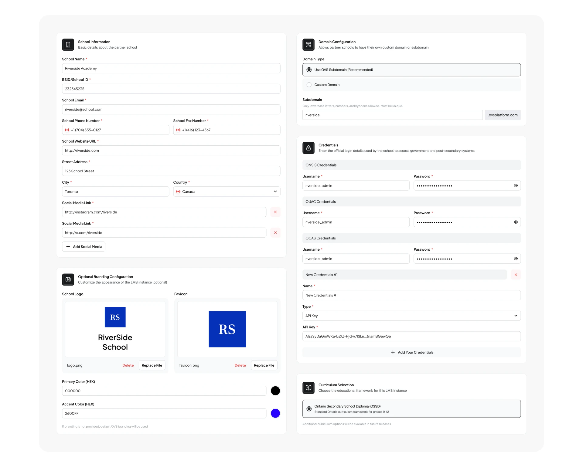 Rapid Instance Deployment: Ontario Super Admins must create fully-functional school LMS instances with minimal setup friction—configuring super admin users, school details, branding assets, and curriculum in one streamlined flow