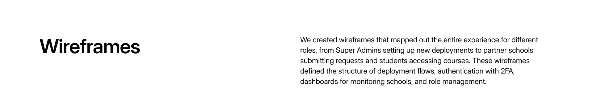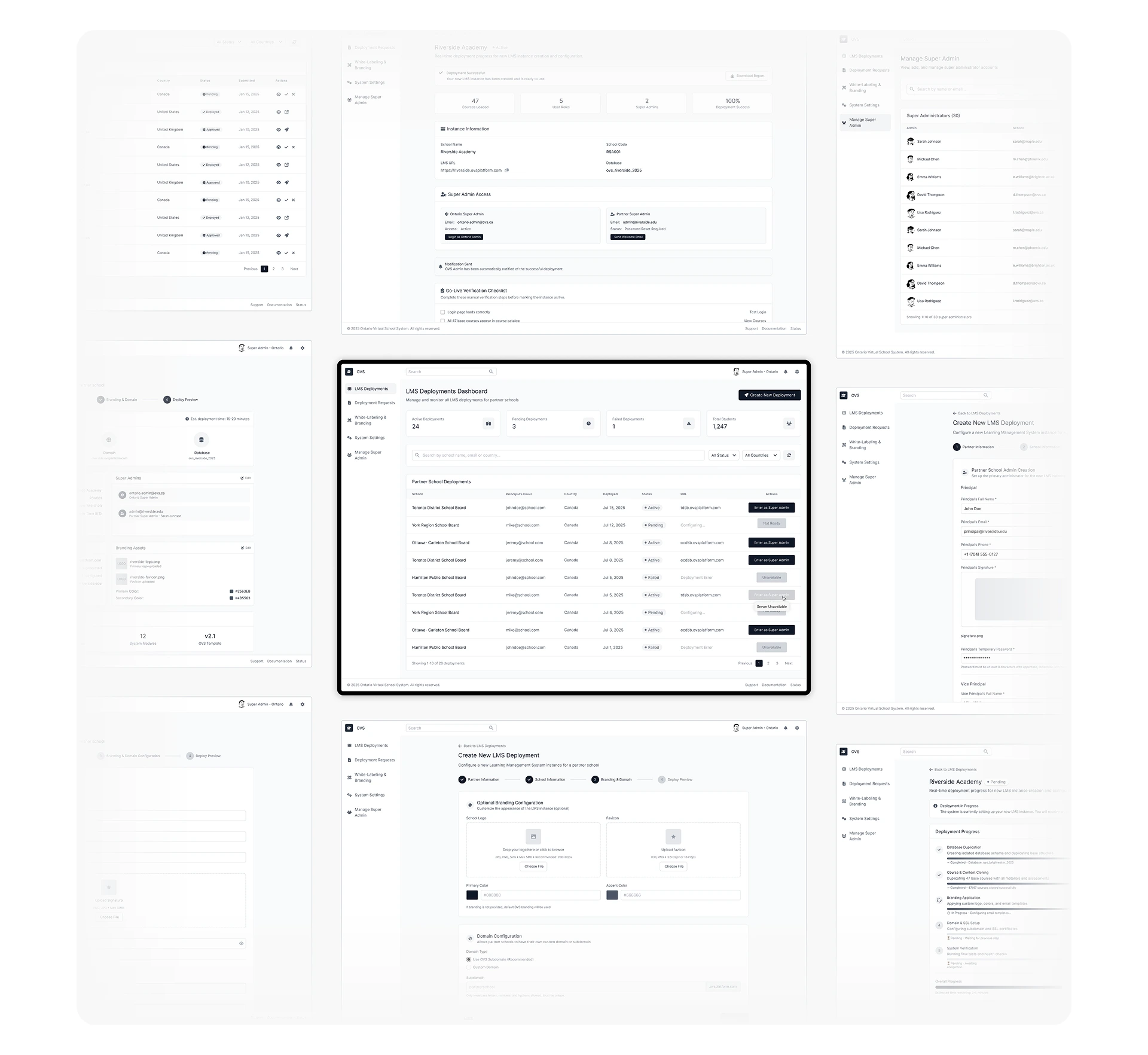 Through interviews with Ontario Virtual School team, education administrators from partner institutions, teachers managing hybrid classrooms, and parents tracking student progress, I mapped the complete school lifecycle—from deployment request to student course completion to report generation.