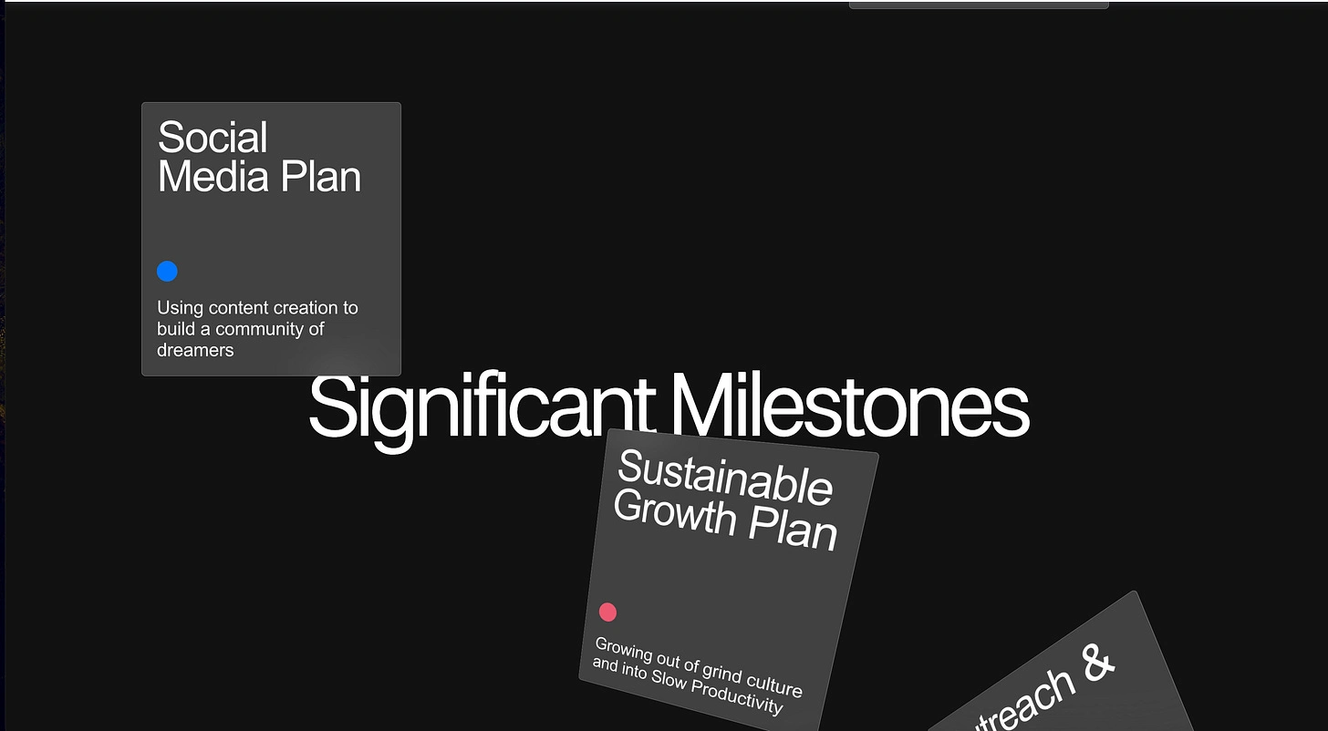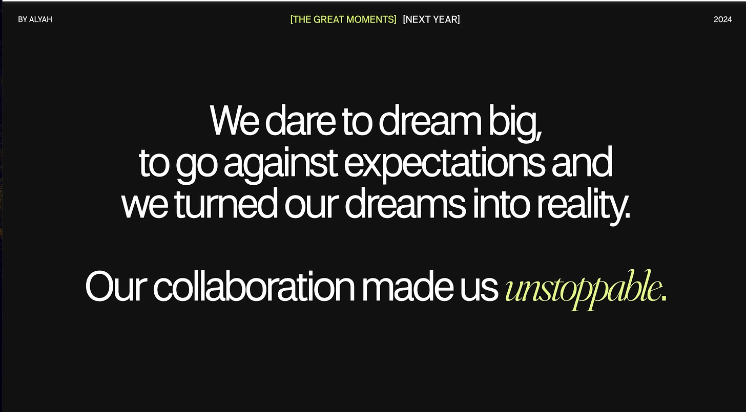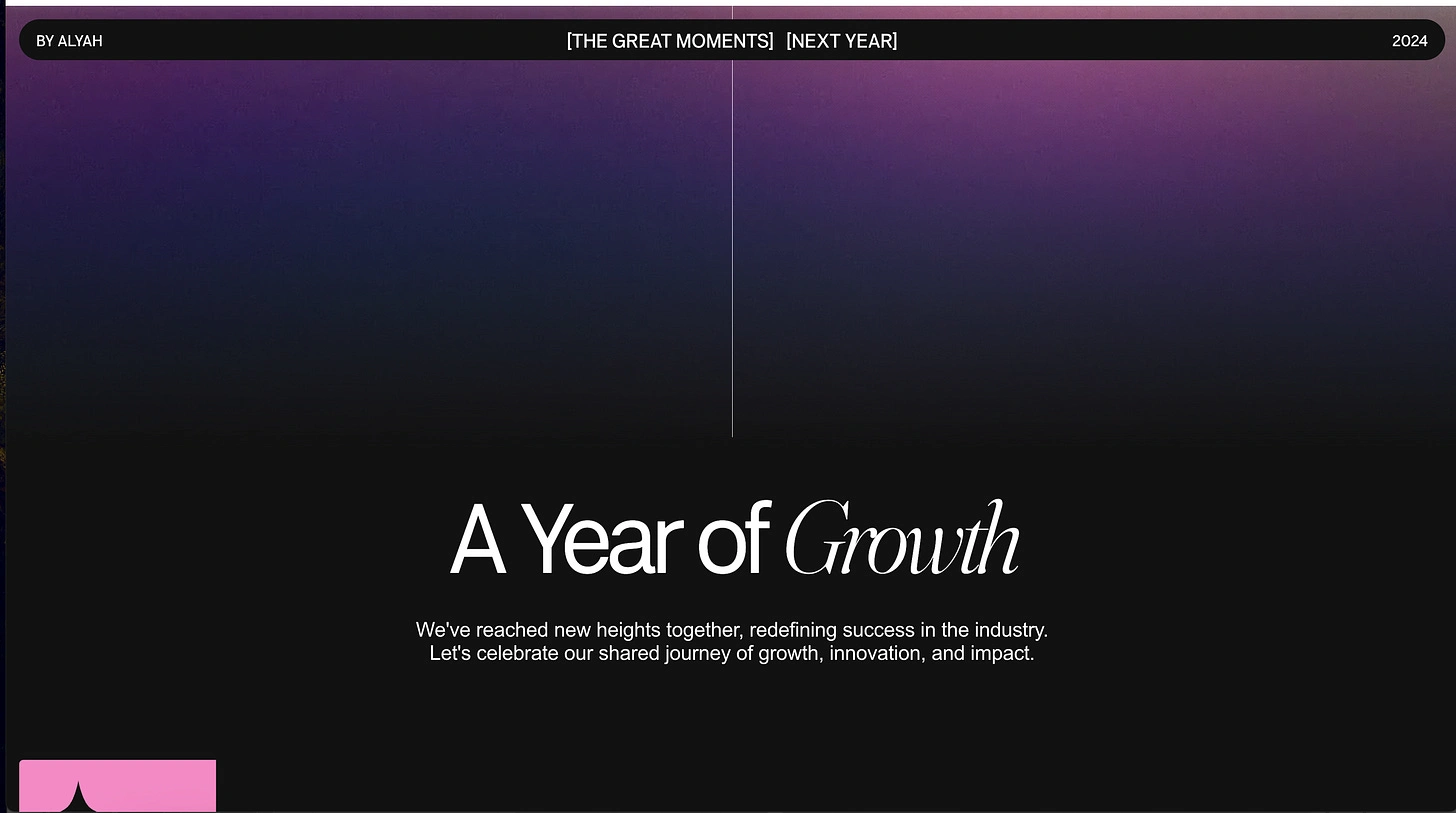 One day, I opened my laptop, looking for inspiration again, and then I found a sleek template, originally built to showcase a company’s yearly wins with its partners. It was really cool scrolling through it, seeing the imaginary company’s wins, and then I thought,