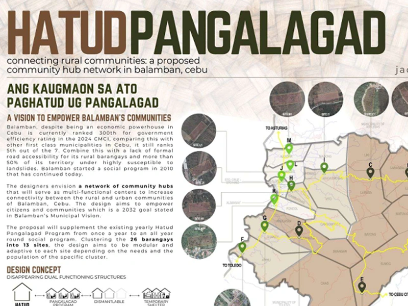 The designers envision a network of community hubs that will serve as multi-functional centers to increase connectivity between the rural and urban communities of Balamban, Cebu. The design aims to empower citizens and communities which is a 2032 goal stated in Balamban’s Municipal Vision.