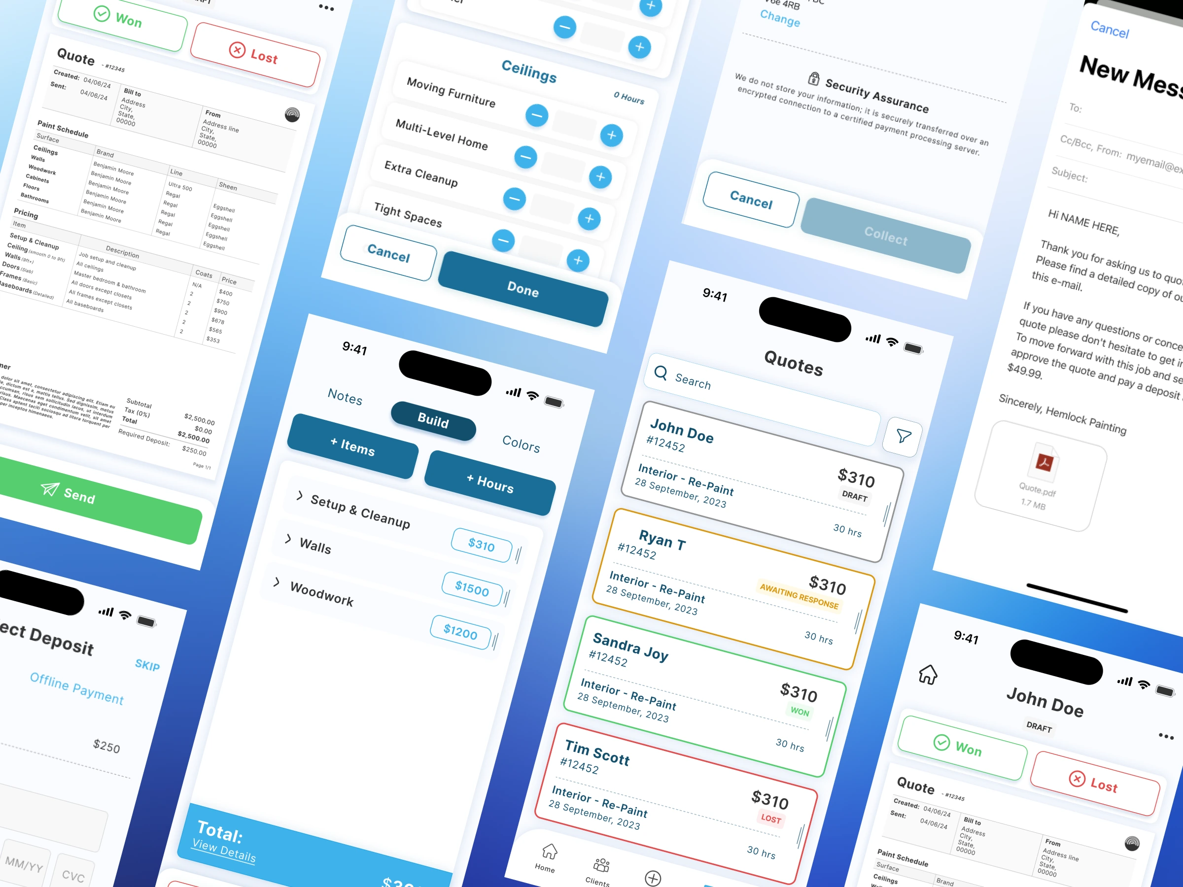 Quick Estimates: Enter rooms/surfaces, dimensions, coats, prep tasks; auto‑calculates labor and materials.