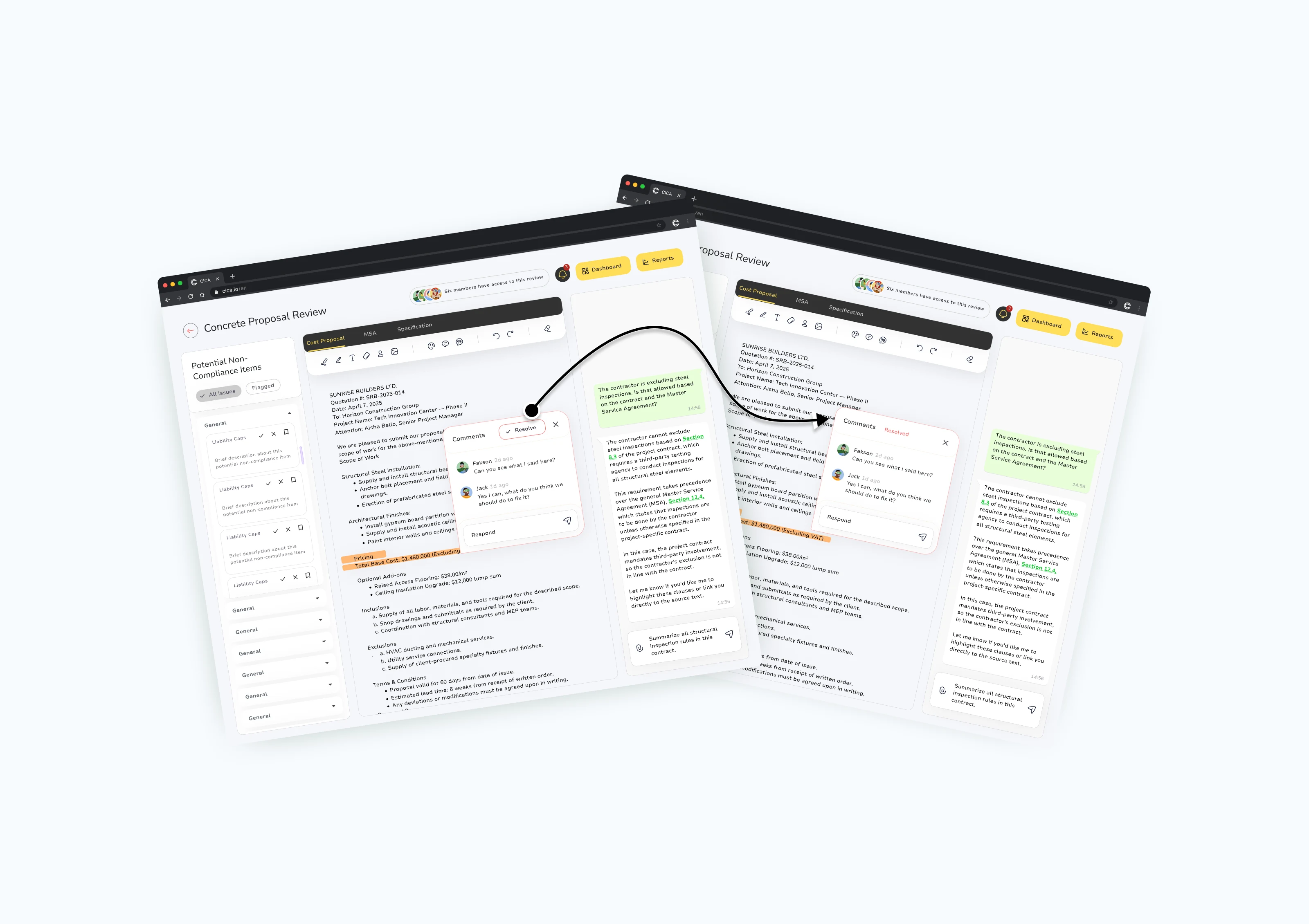 Resolution Threading: I designed a deep comment system with "Resolved" and "Pending" states. This transforms the review from a static document check into a living, collaborative negotiation space for stakeholders.