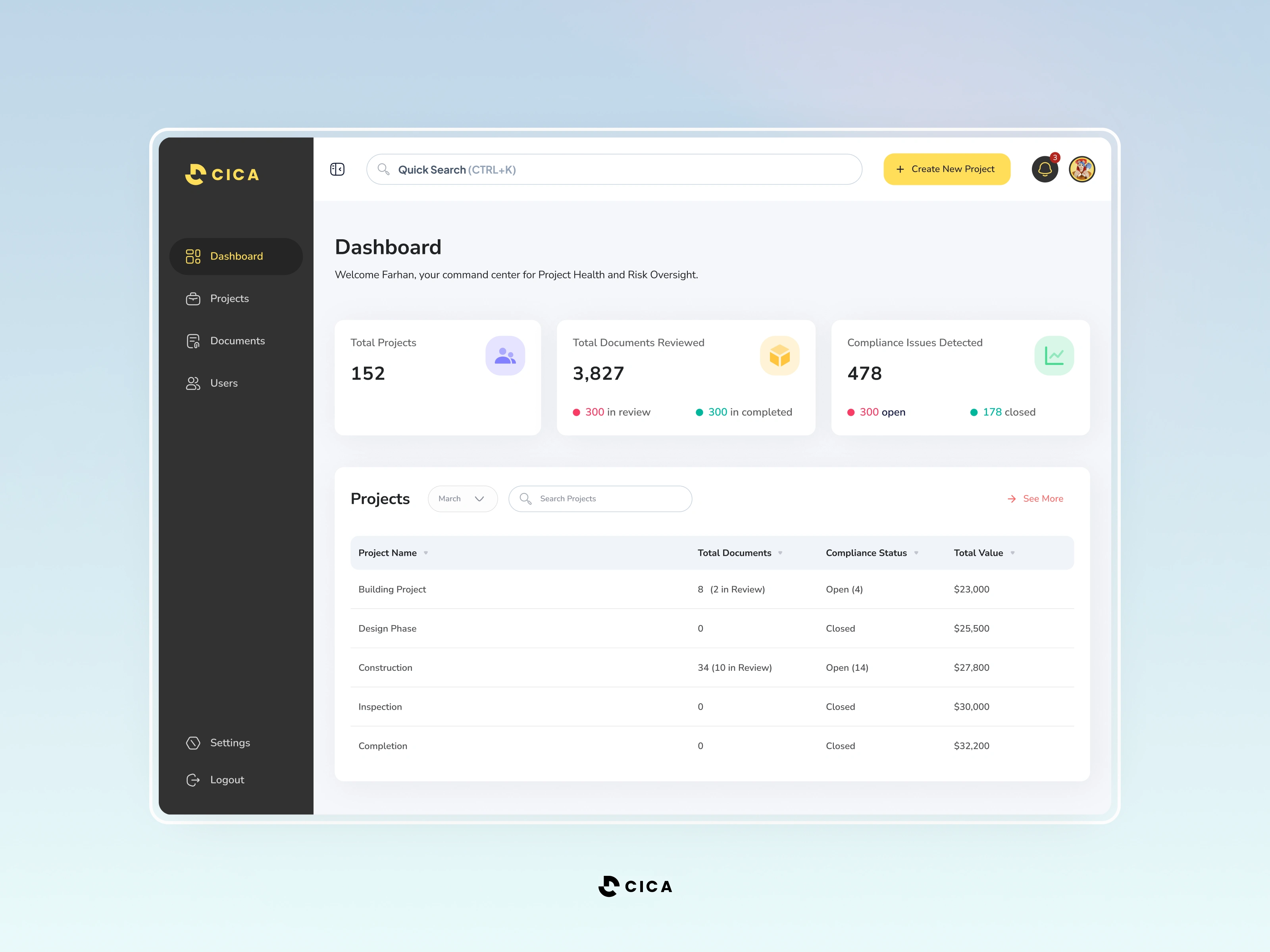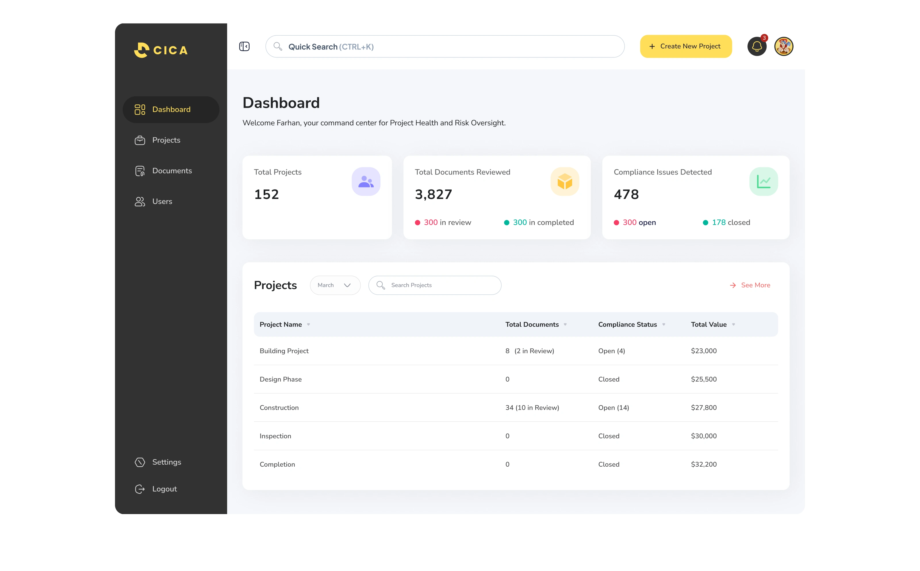 The Command Center: The main dashboard was designed for an instant "Health Check." By prioritizing high-level metrics—like the 478 compliance issues detected—we gave project managers a roadmap for their day, ensuring no critical risk goes unnoticed.