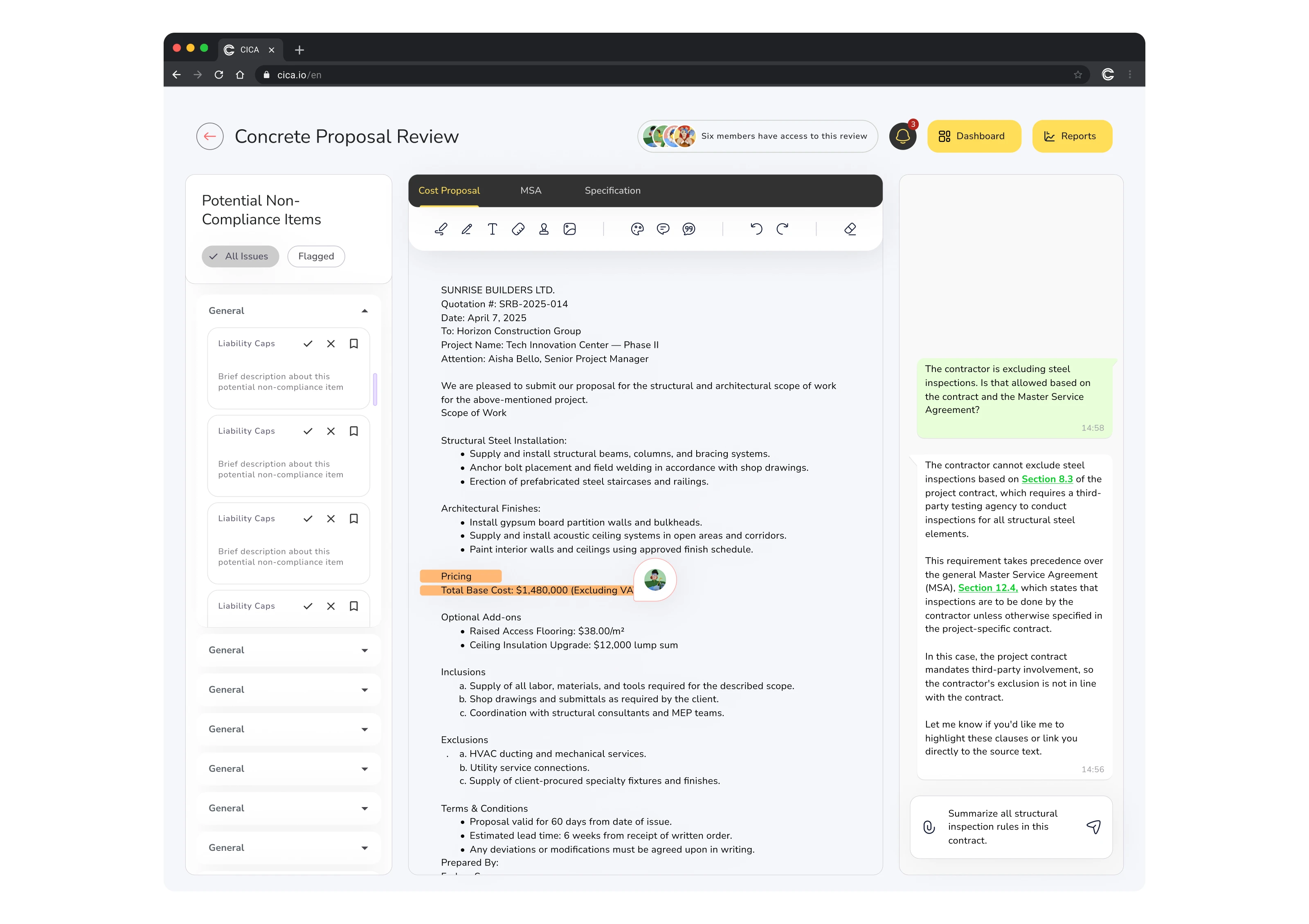 Split-Screen Comparison: A distinct dual-pane view allows users to cross-reference multiple documents (e.g., Cost Proposal vs. MSA) in real-time without switching tabs.