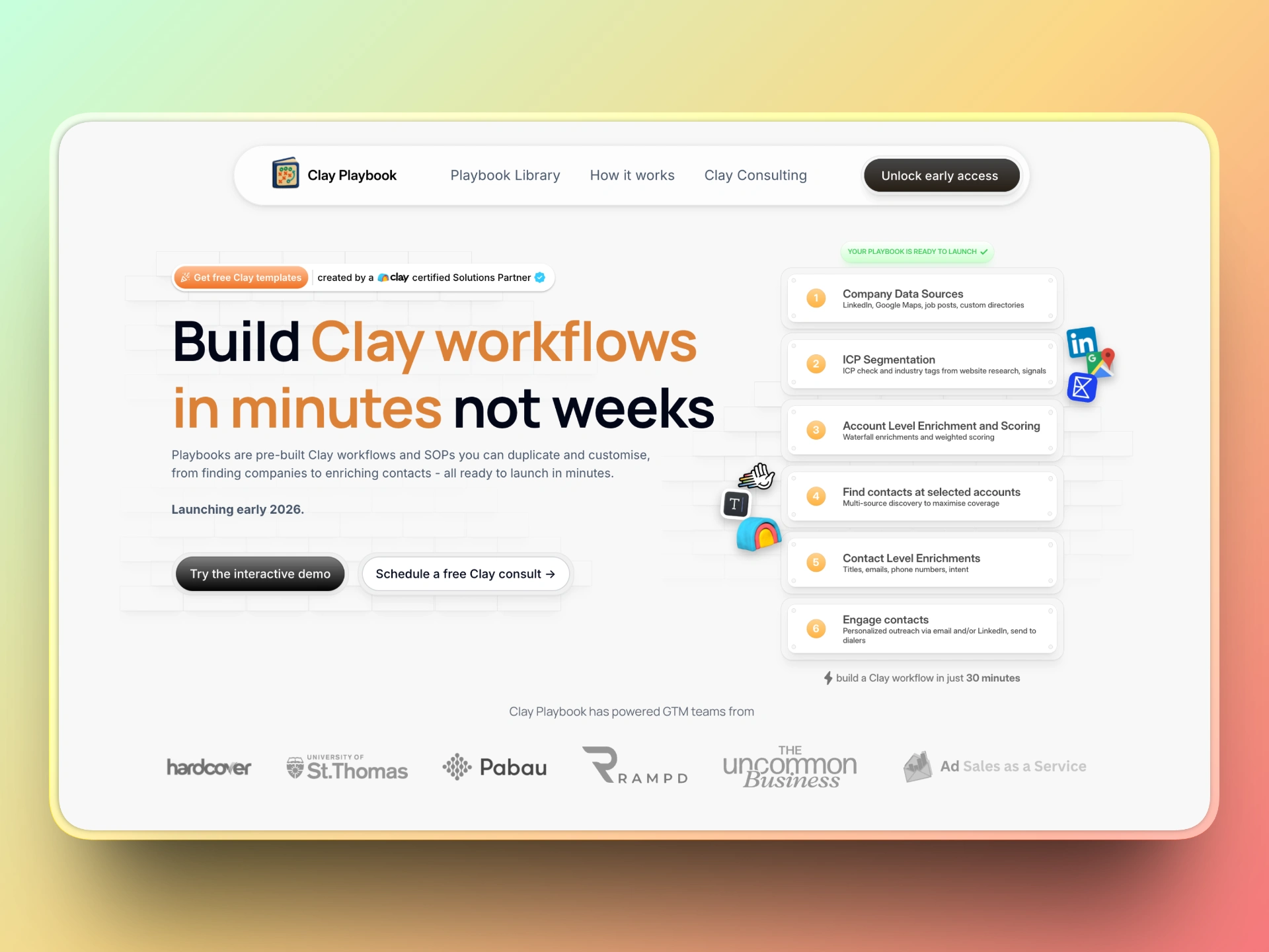 Framer website design and development for Clay certified solutions partner Clay Playbooks.