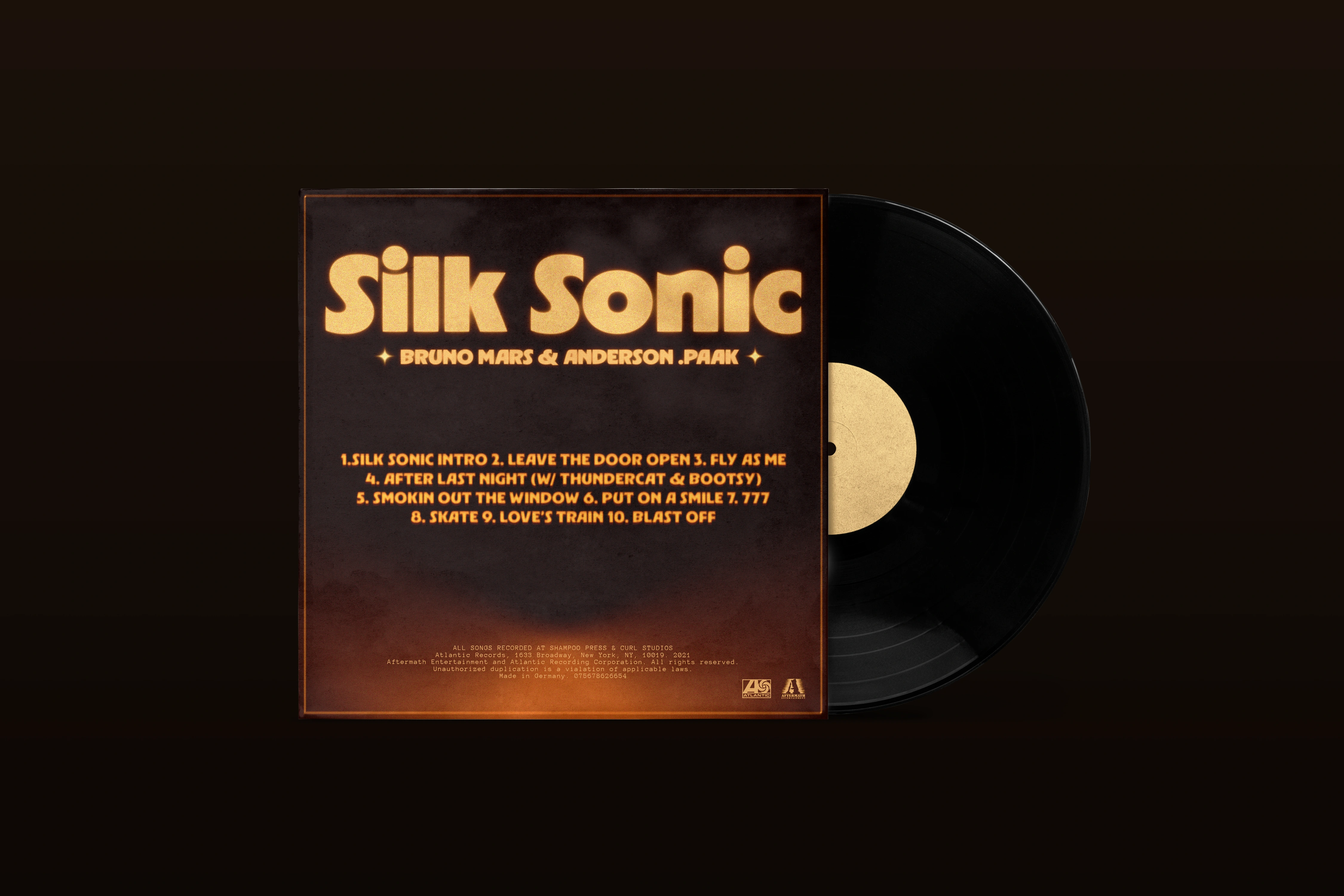 I created a retro-style LP cover using a single photograph I took myself. No artist portraits, just atmosphere. I imagined what a real evening with Silk Sonic might feel like: smooth, warm, and full of groove.