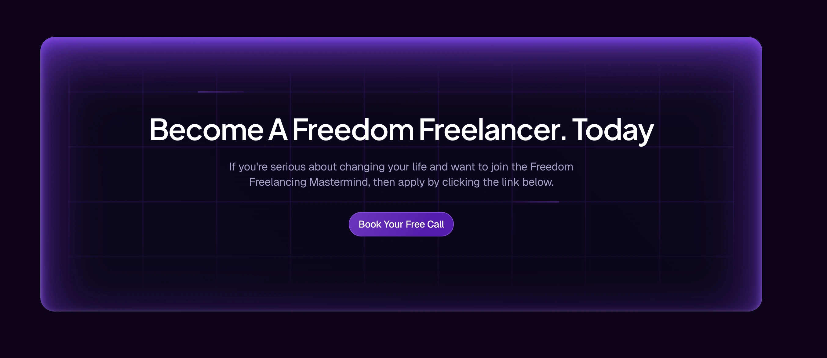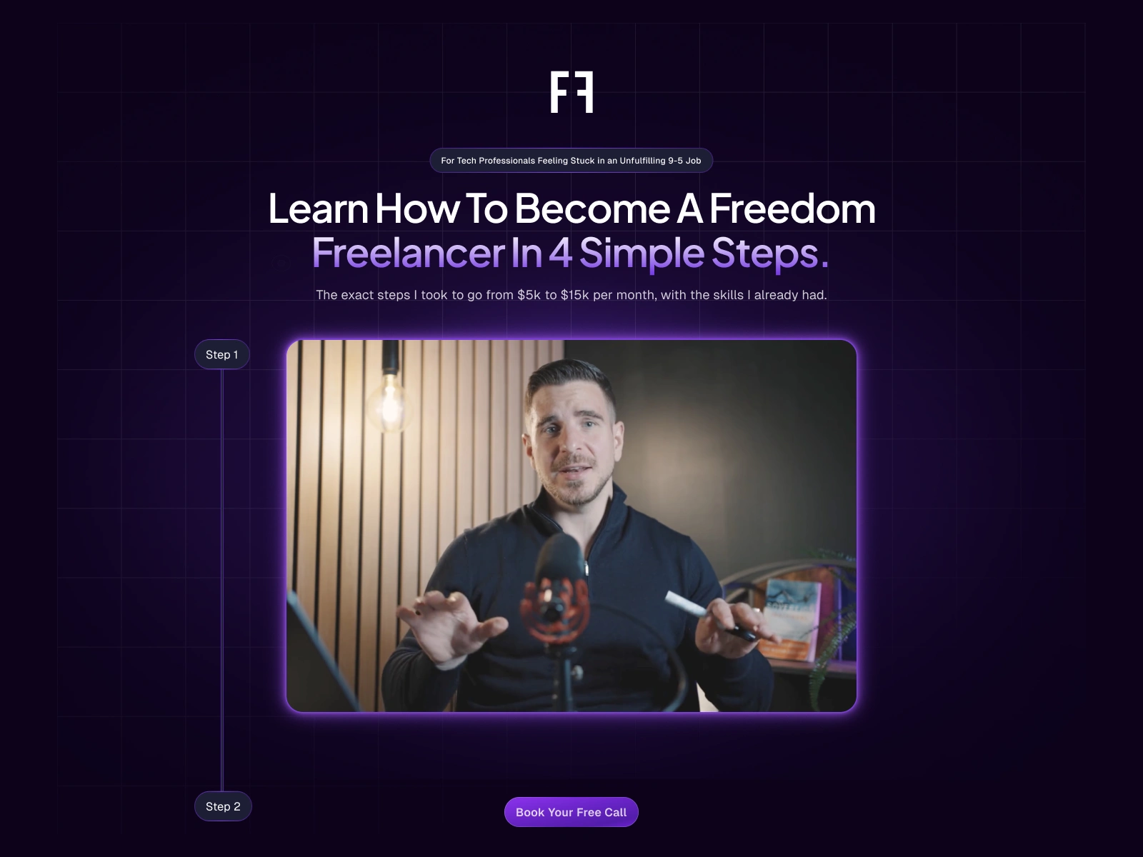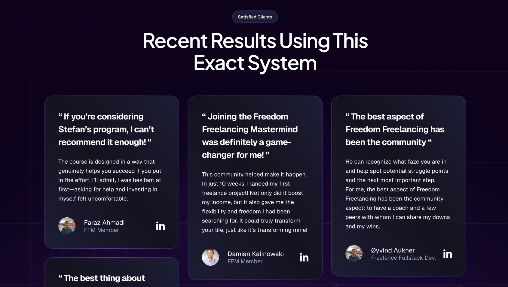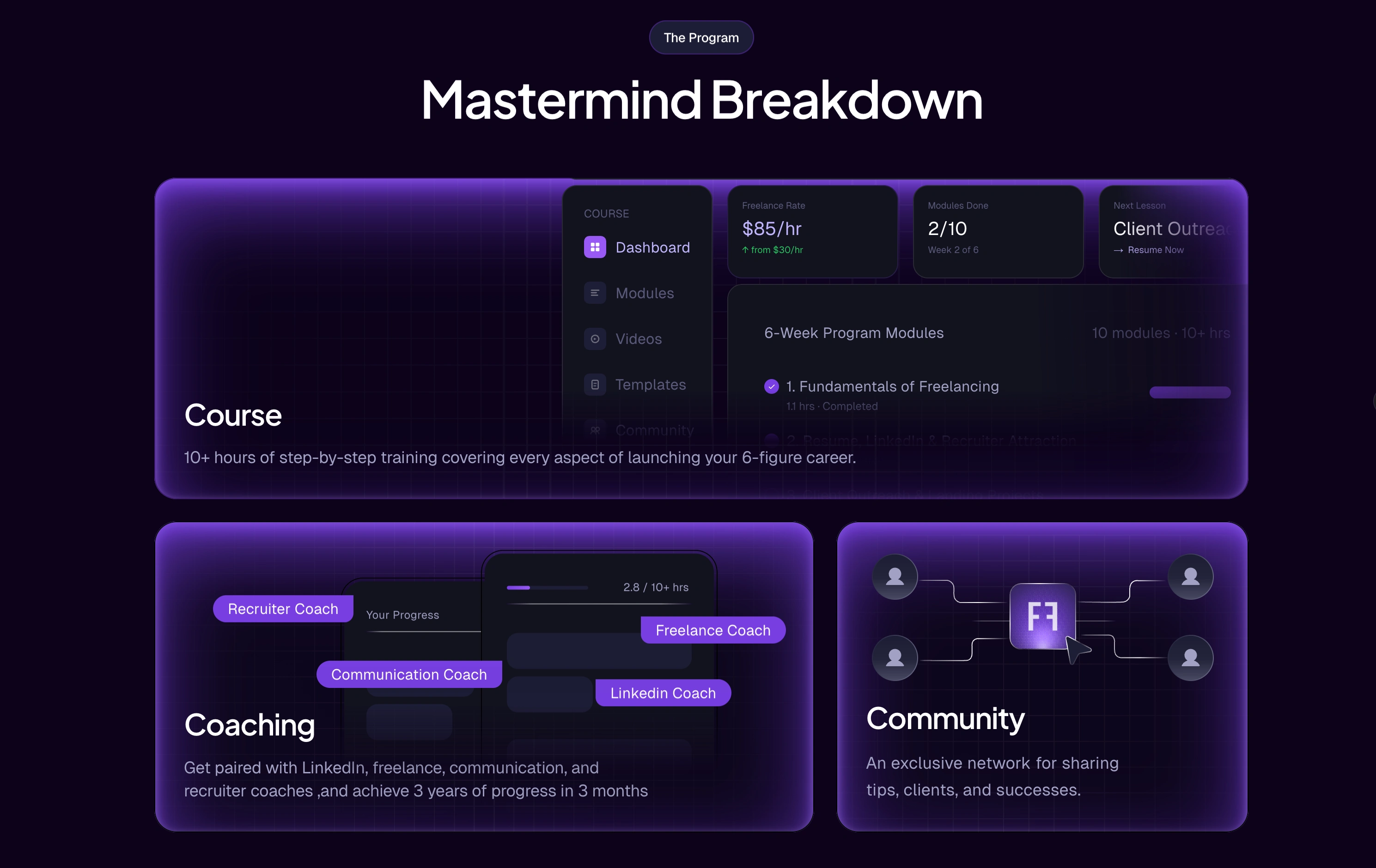 This is where we made the product feel real. Instead of just listing features, we designed this section to look like a SaaS dashboard, because that's the aesthetic this audience trusts. You can see the course interface, the module structure, the coaching roles. It communicates "this is built" without having to say it out loud.
