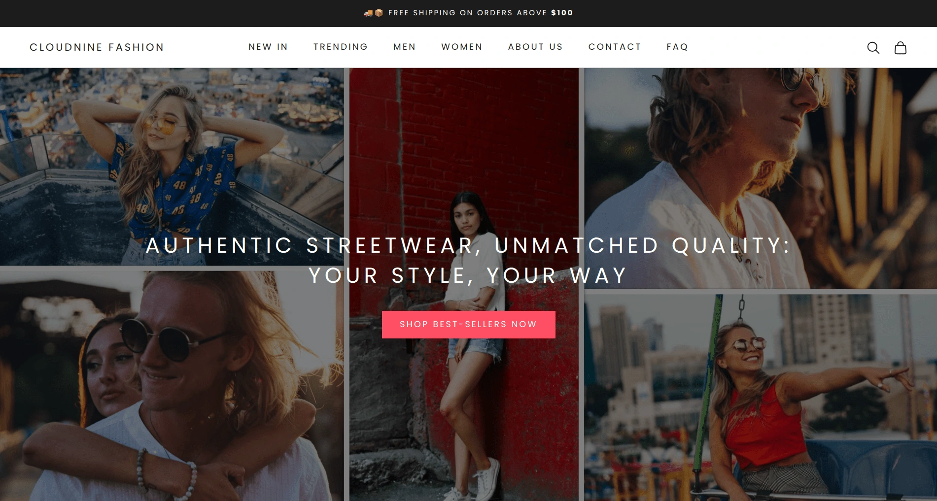 Designed this aesthetic home page for a streetwear brand using the Prestige theme. It includes a beautiful collage, a mega-menu, and a "shop the look" section.