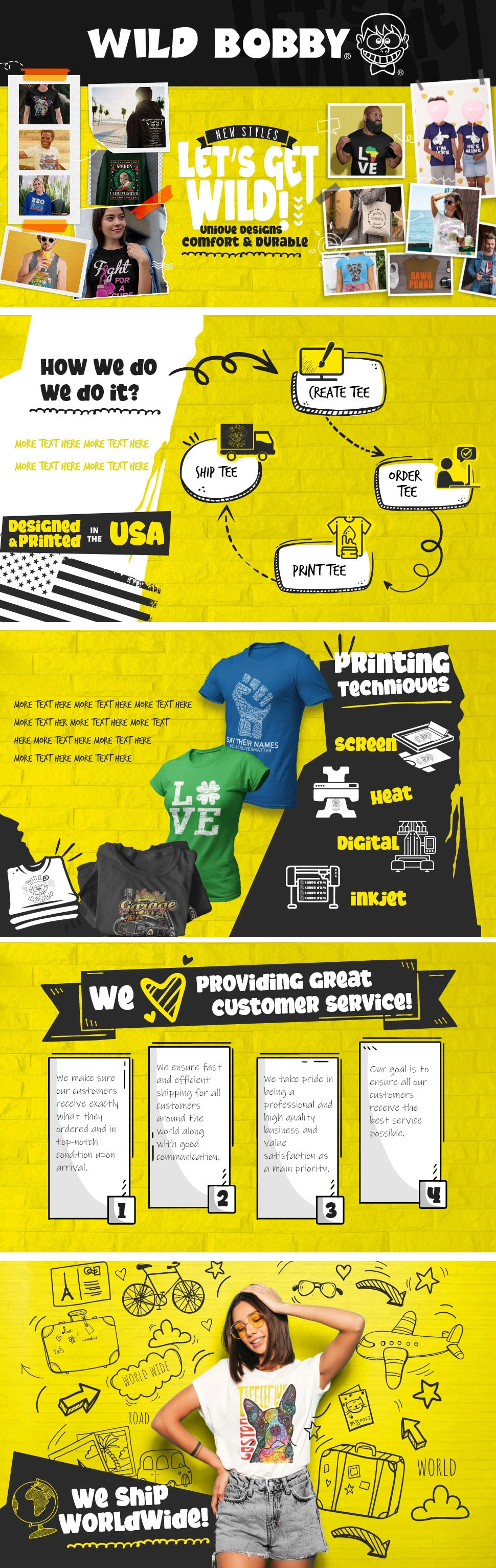 E-commerce Layout for print on demand company, Wild Bobby. Their marketing team needed A+ Content for Amazon Pages using Adobe Illustrator, Photoshop and XD.