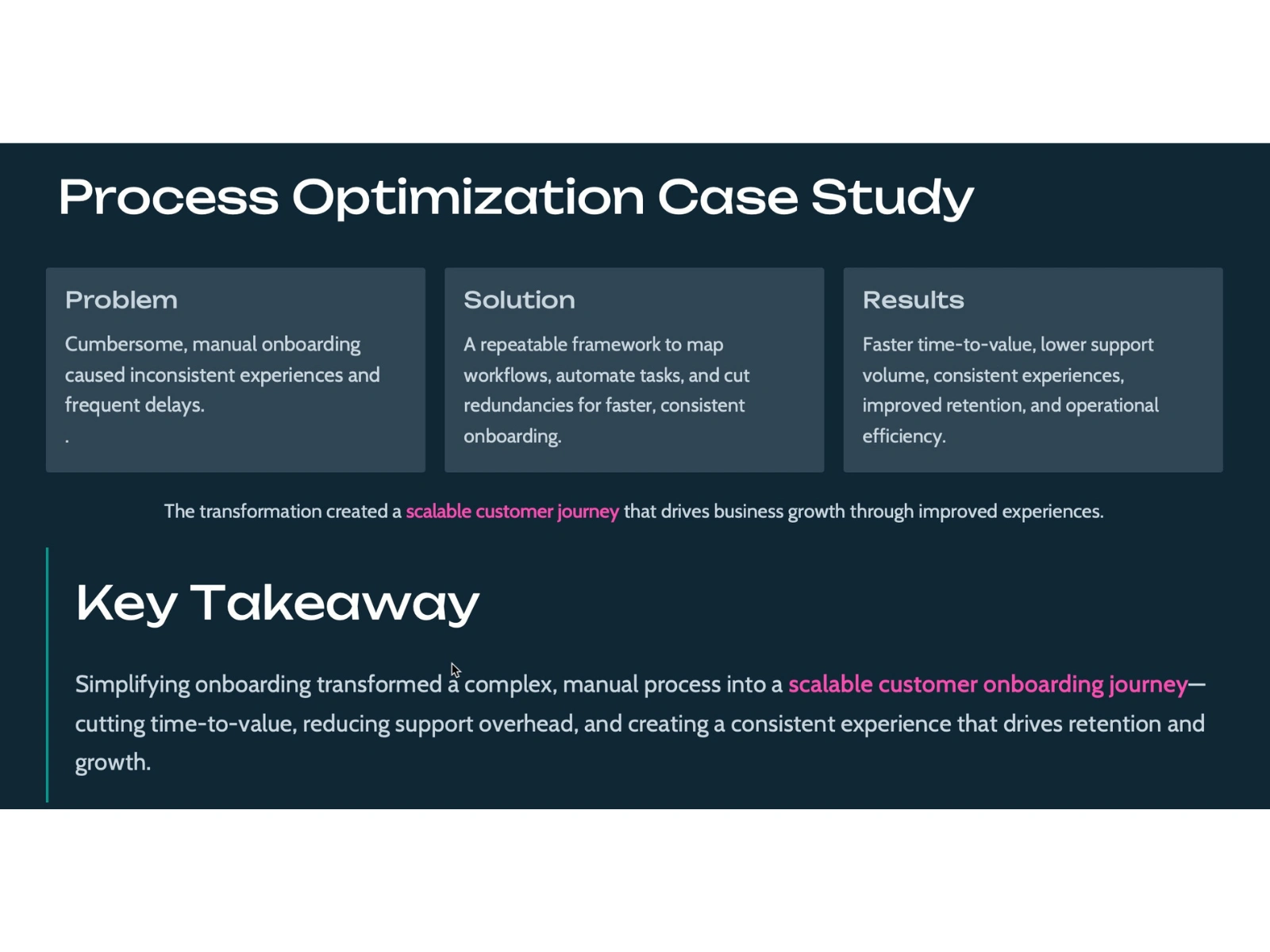 Streamlined customer onboarding with workflow mapping and automation—cutting time by 33%, reducing manual effort, and boosting consistency and satisfaction.