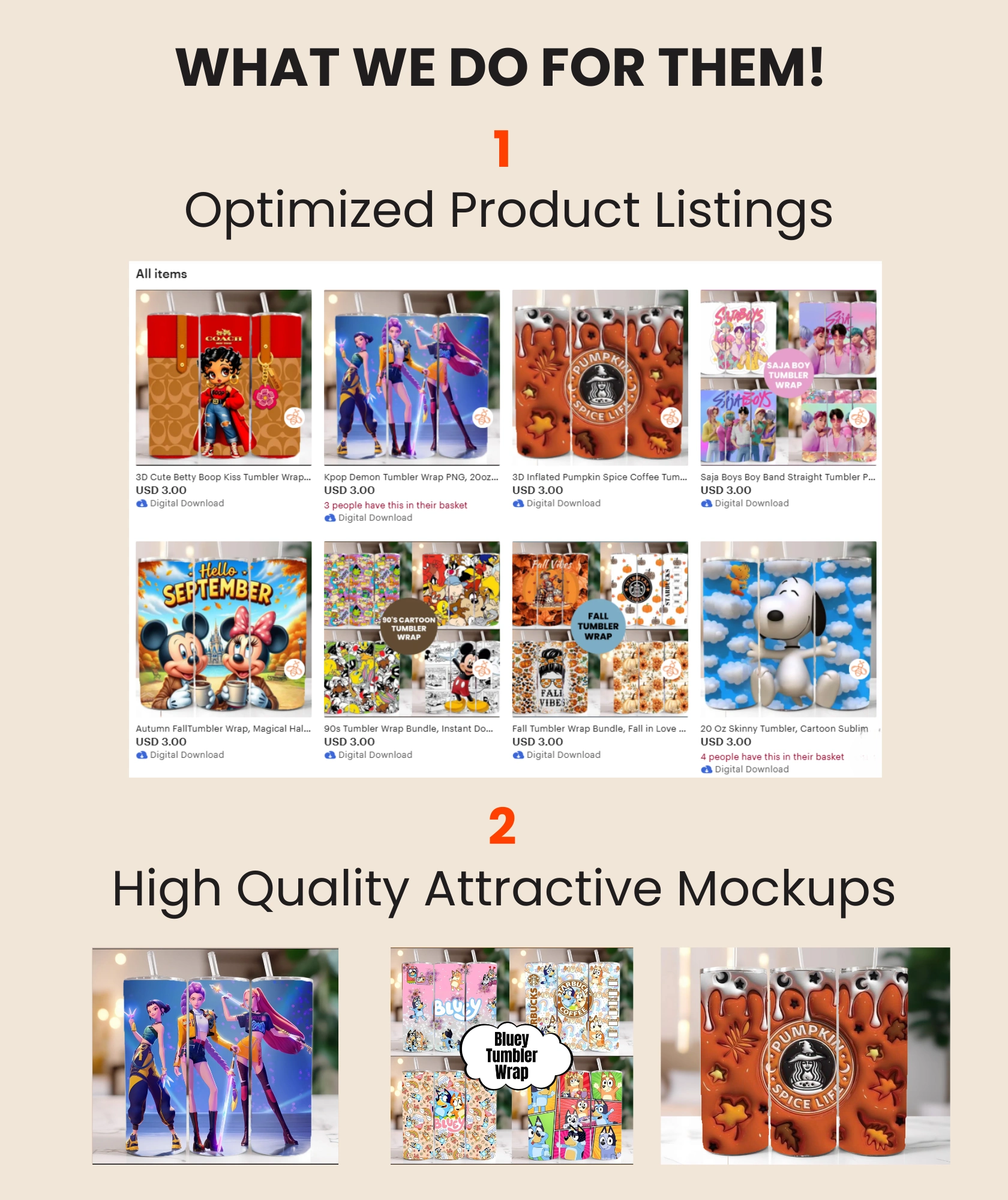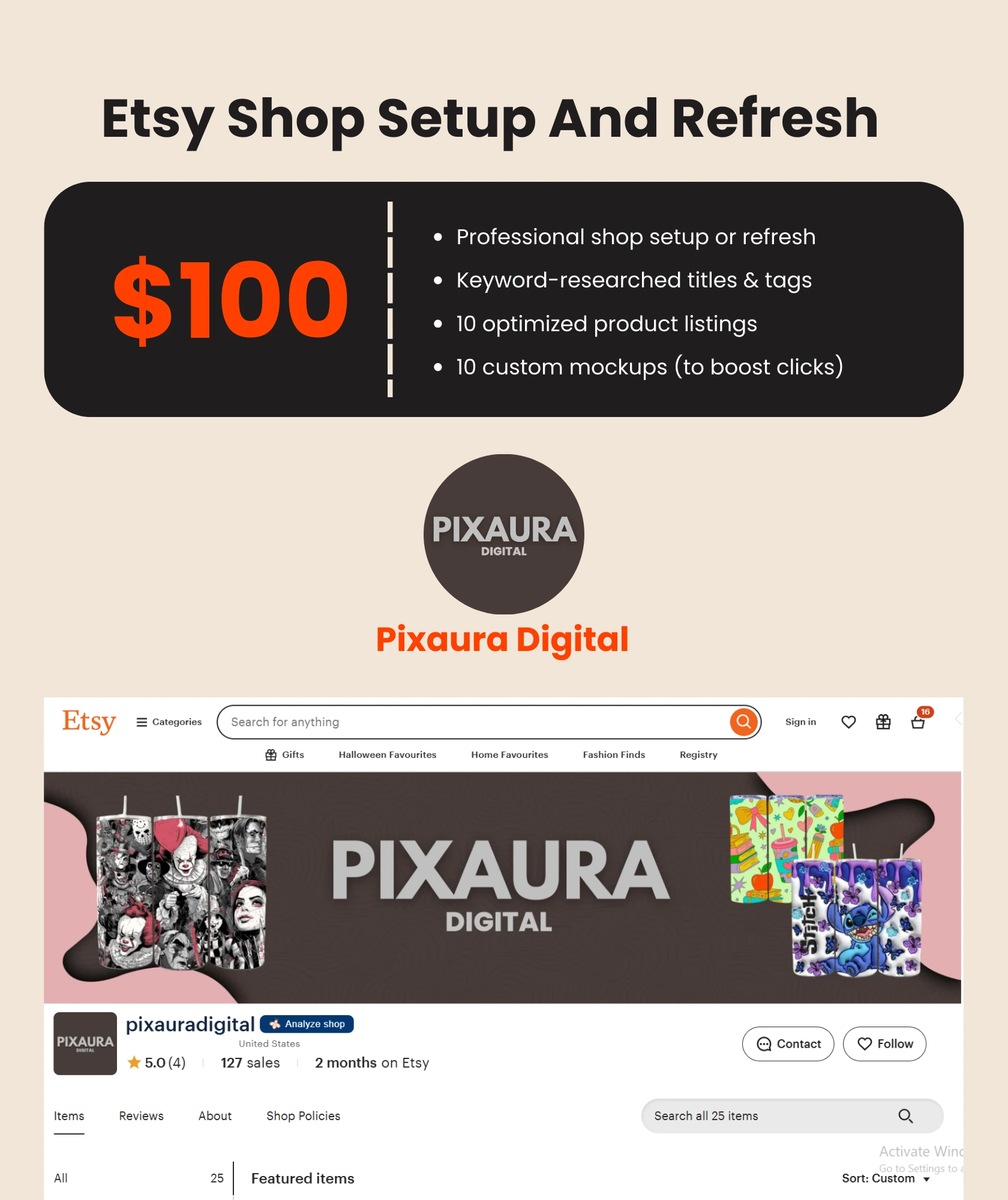 Professional shop setup or refresh Keyword-researched titles & tags 10 optimized product listings 10 custom mockups (to boost clicks)