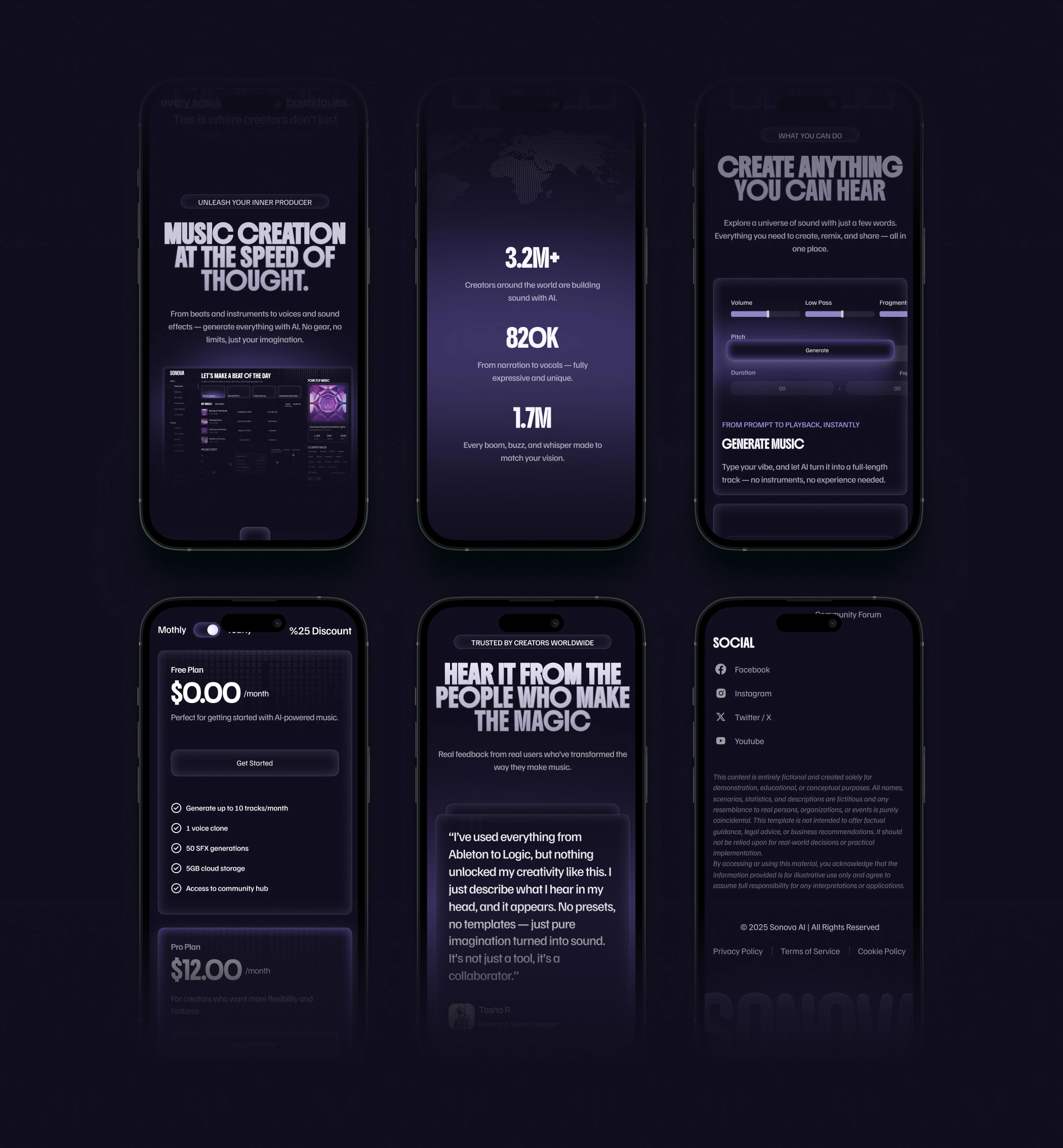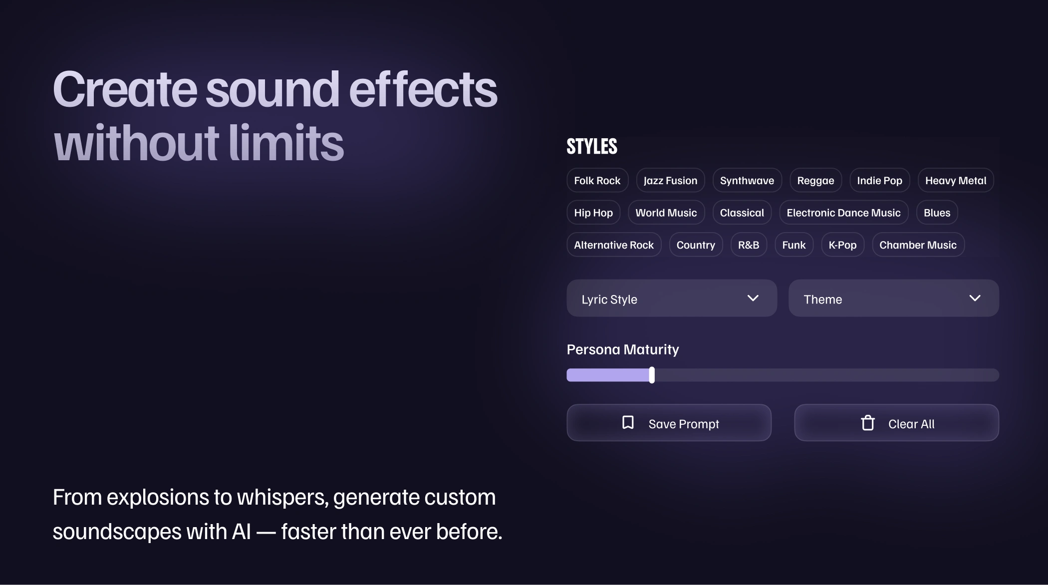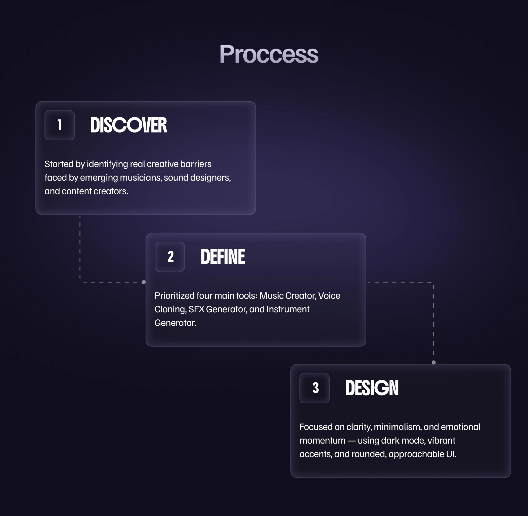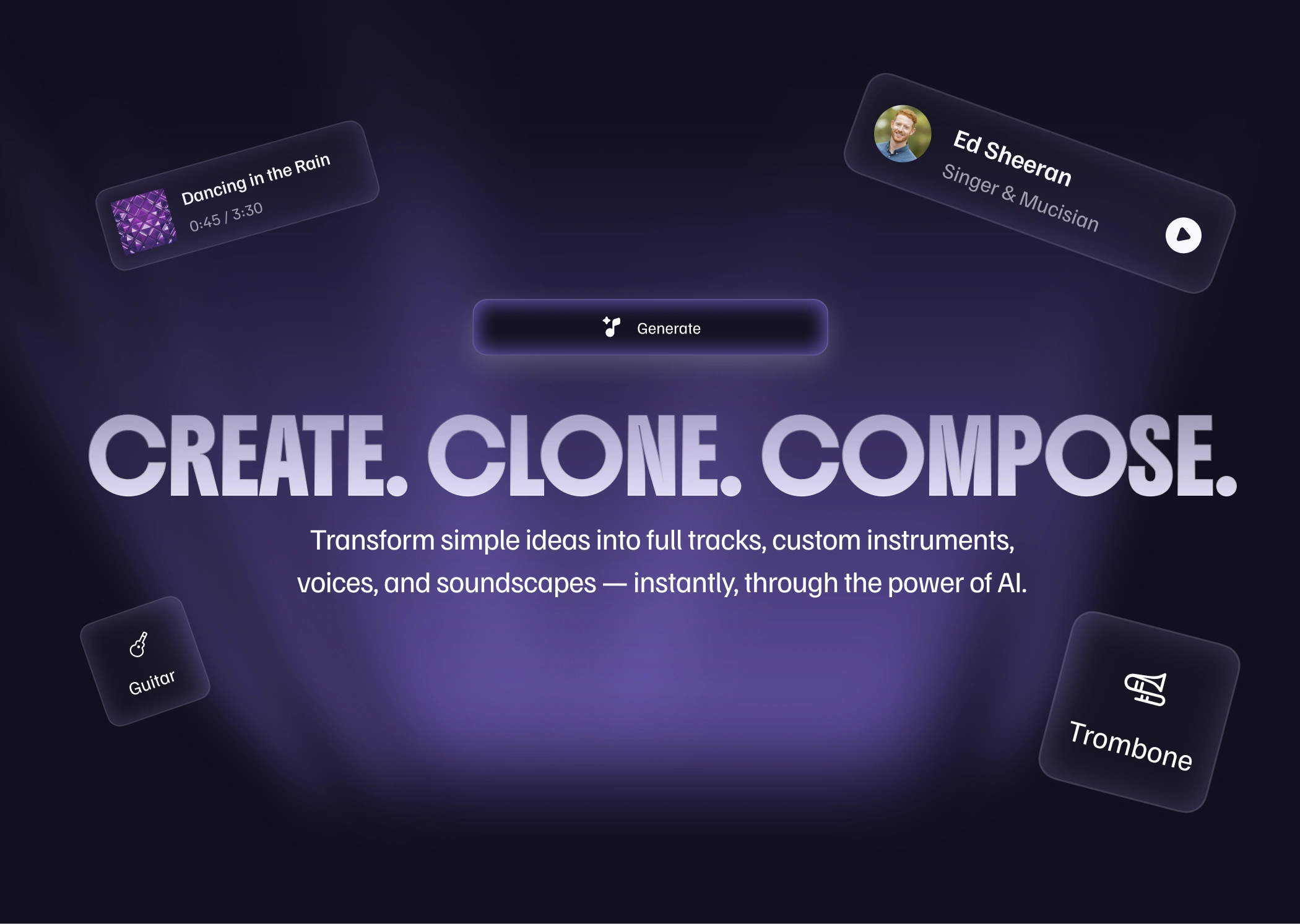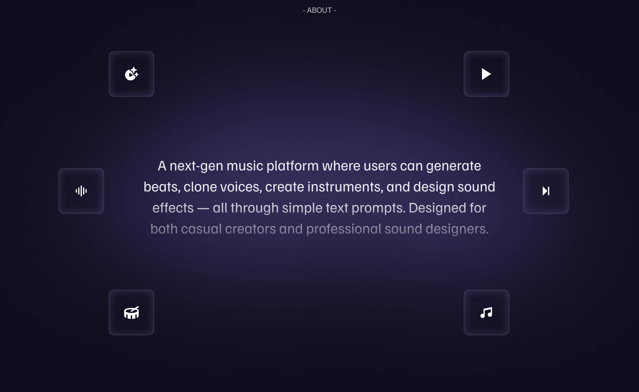 A next-gen music platform where users can generate beats, clone voices, create instruments, and design sound effects — all through simple text prompts. Designed for both casual creators and professional sound designers.