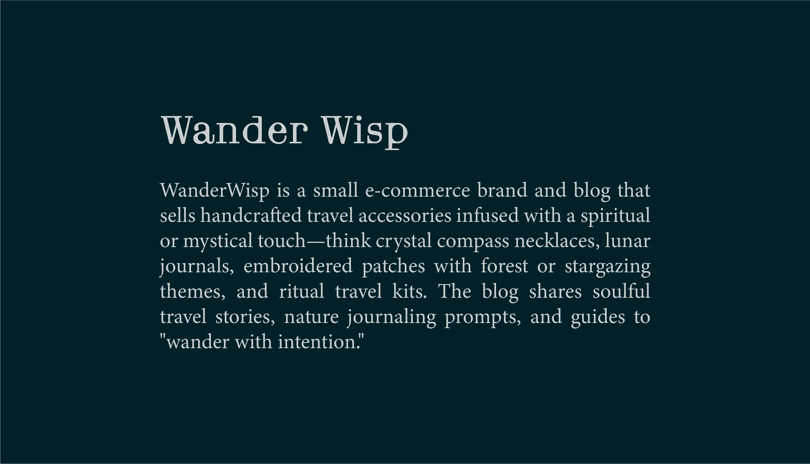 Wander Wisp is an e-commerce brand that sells mystically inspired travel accessories—like lunar journals, crystal compass necklaces, and ritual kits.