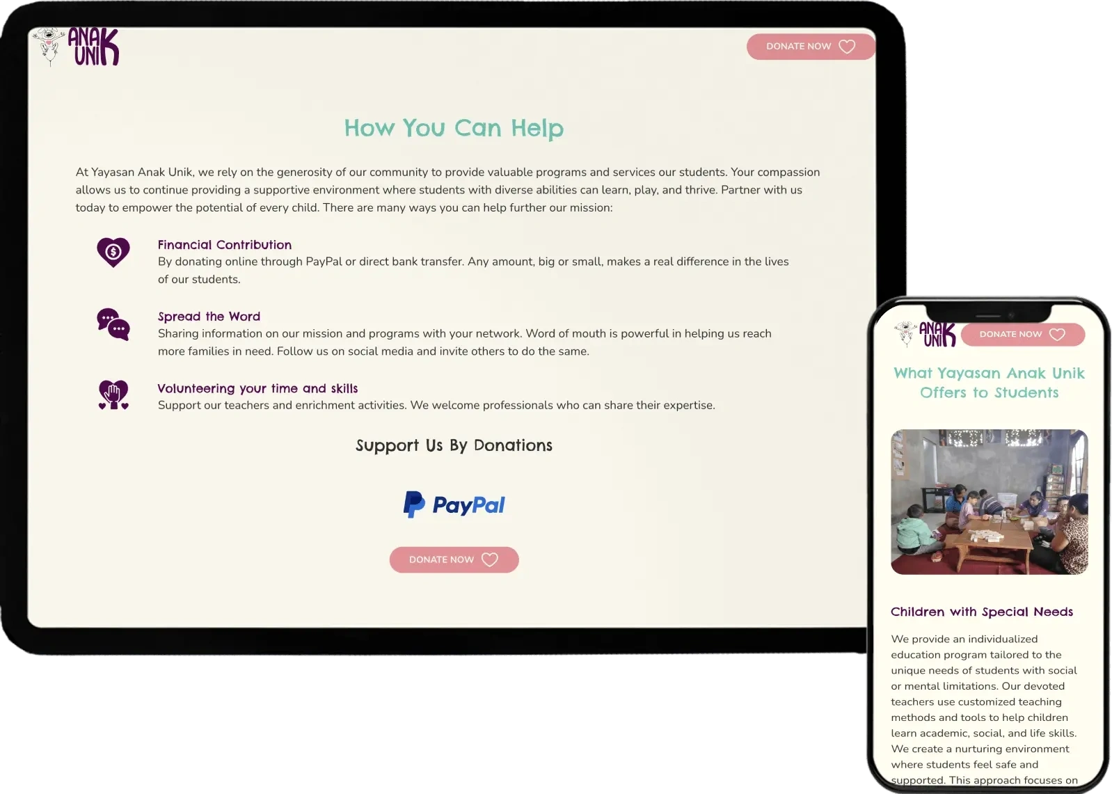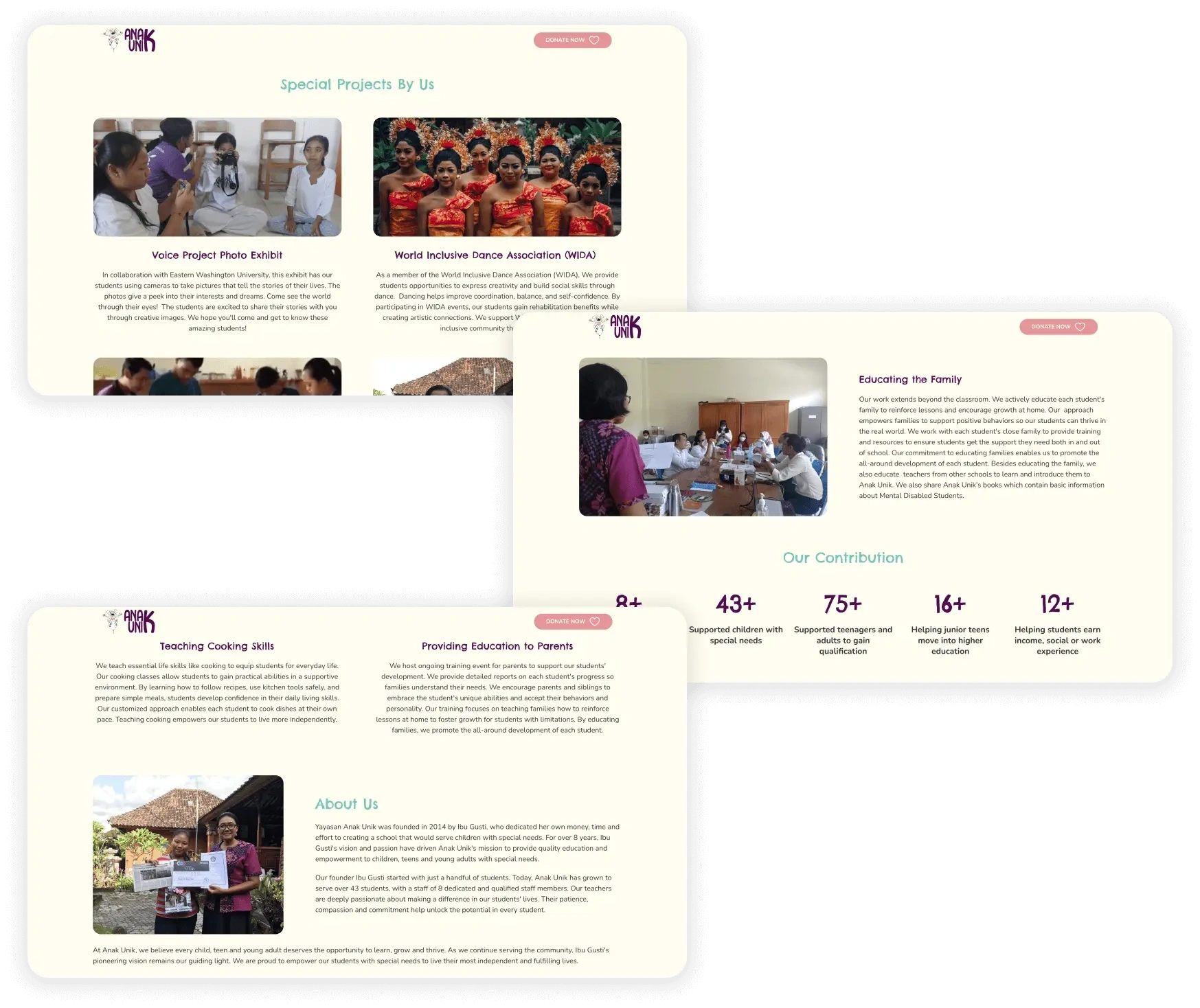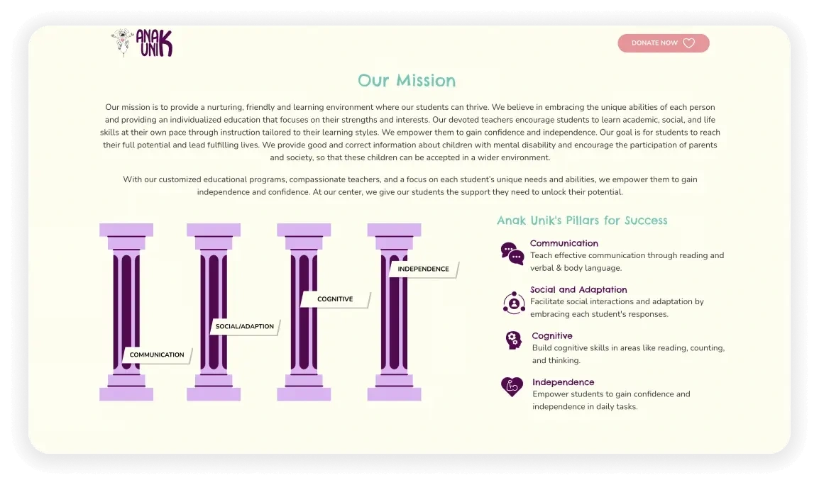 We focused on creating branding that embodies Anak Unik’s mission of inclusivity, empowerment, and compassion. By using colors and a particular playful design that resonate with the families and communities they serve, we ensured the website reflected their core values. The branding conveys a message of joy, hope and trust, making it clear that Anak Unik is a safe and nurturing environment for individuals with special needs.
