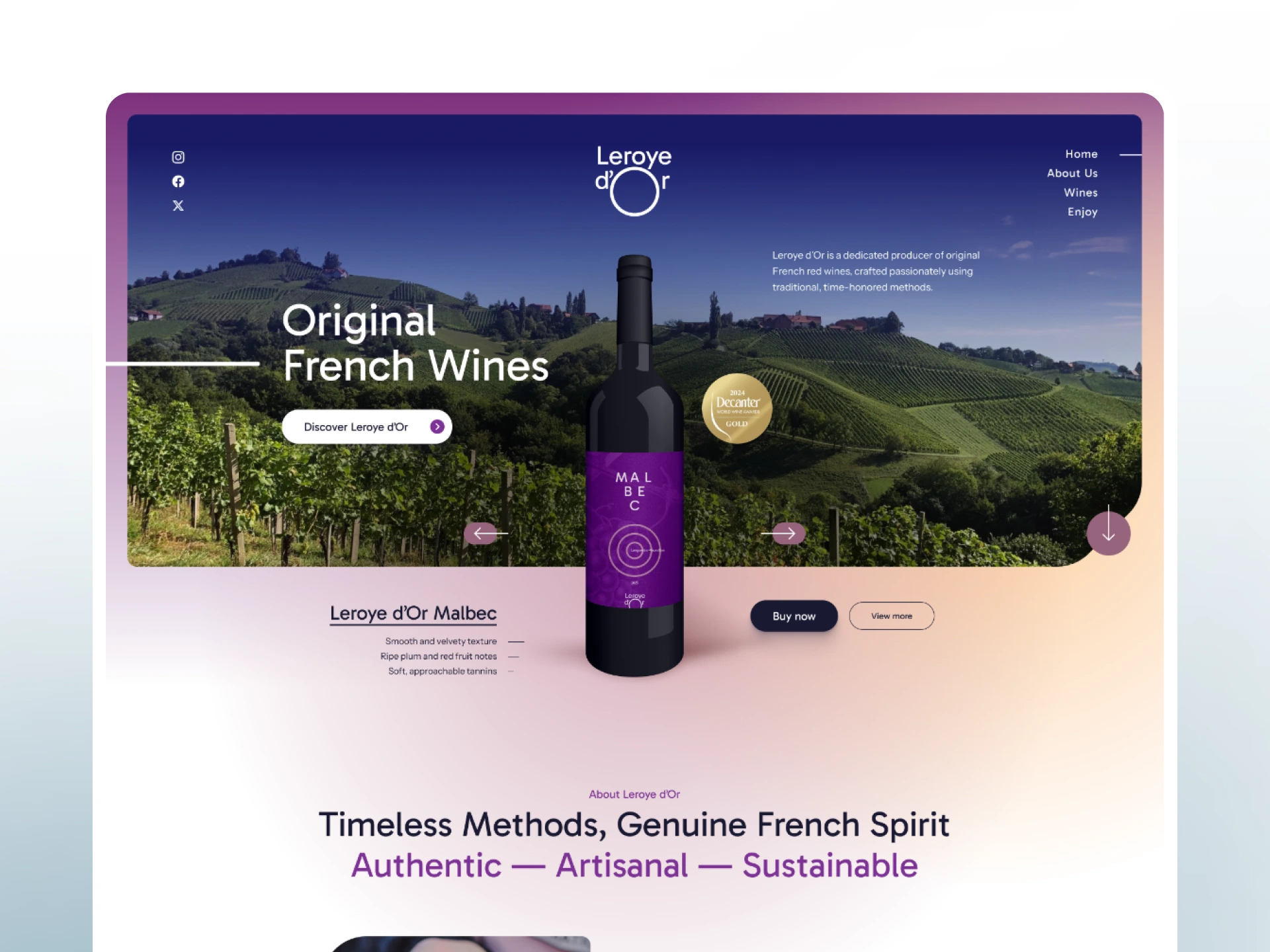 Explore an elegant web design prototype for a French winery. This one page concept features a wine catalog and seamless booking for vineyard experiences.