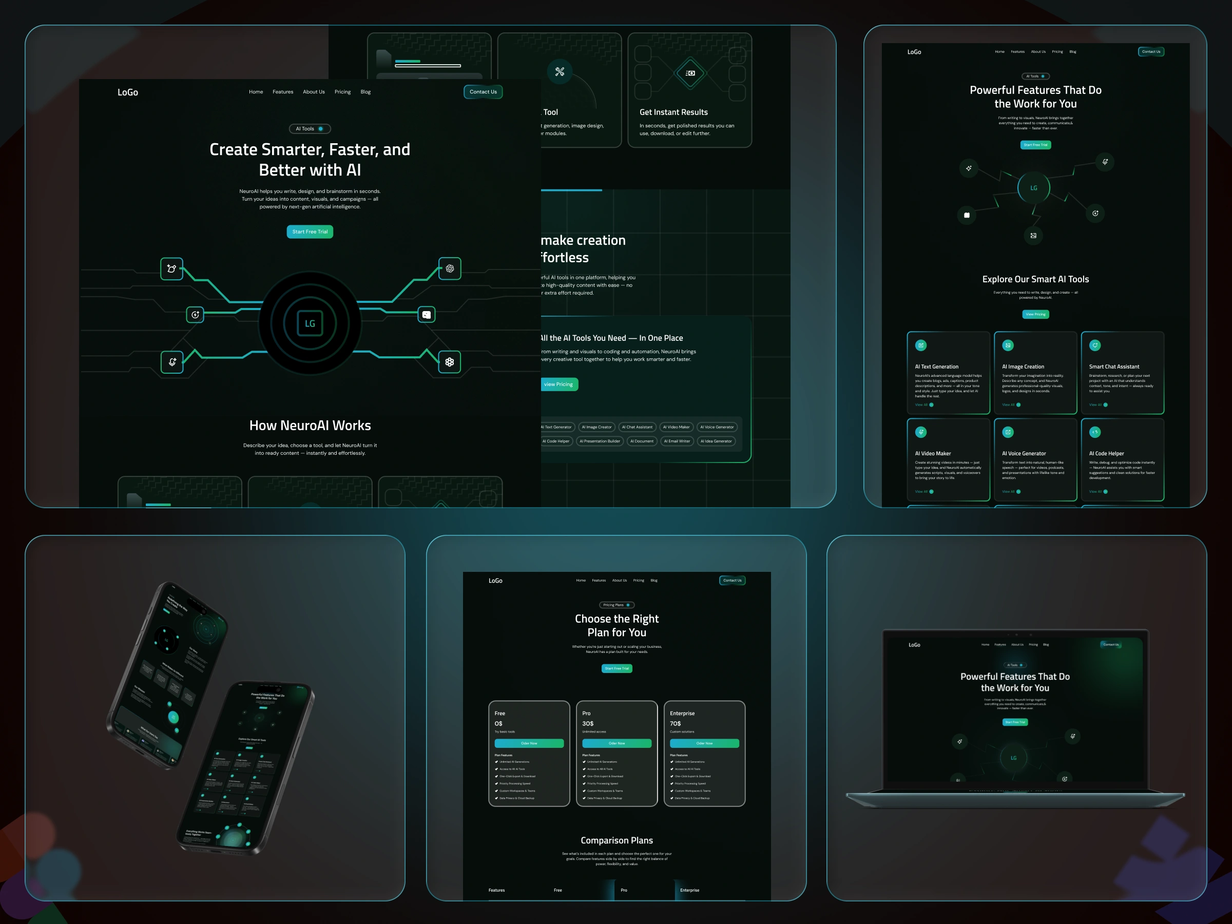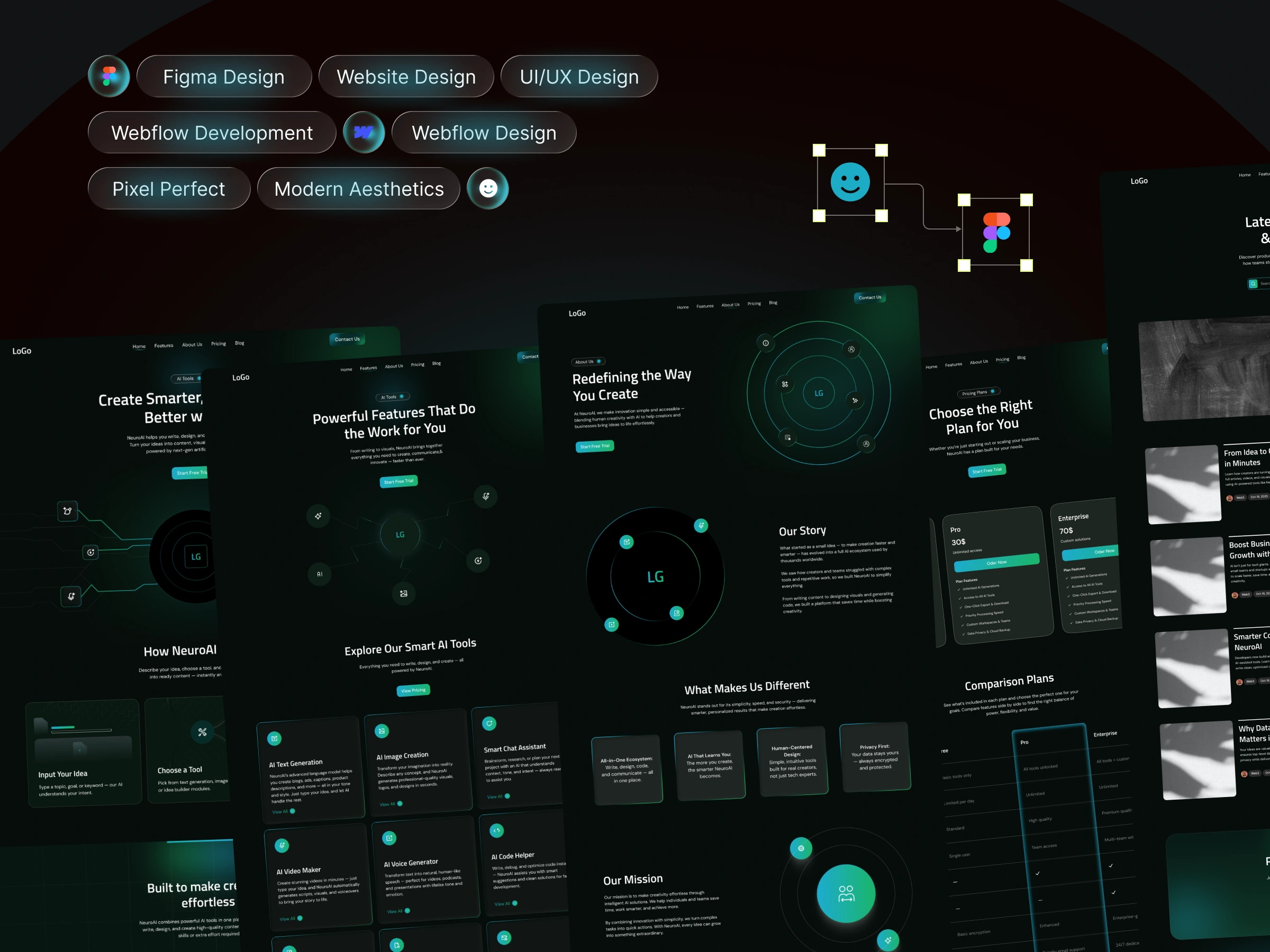 This project showcases a premium, futuristic-style AI tool website designed fully in Figma, and then developed from scratch in Webflow. The goal was to create an interface that feels modern, intelligent, and technology-driven, using dark-mode aesthetics, neon accents, dynamic cards, and interactive components. I built everything using a structured, scalable system so the site can easily grow with new features.