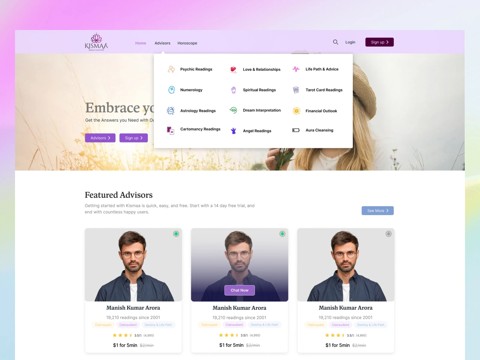 Launched Kismaa web, connecting 100k+ users with 500+ advisors in real-time, boosting engagement 70% and ensuring secure, seamless sessions.