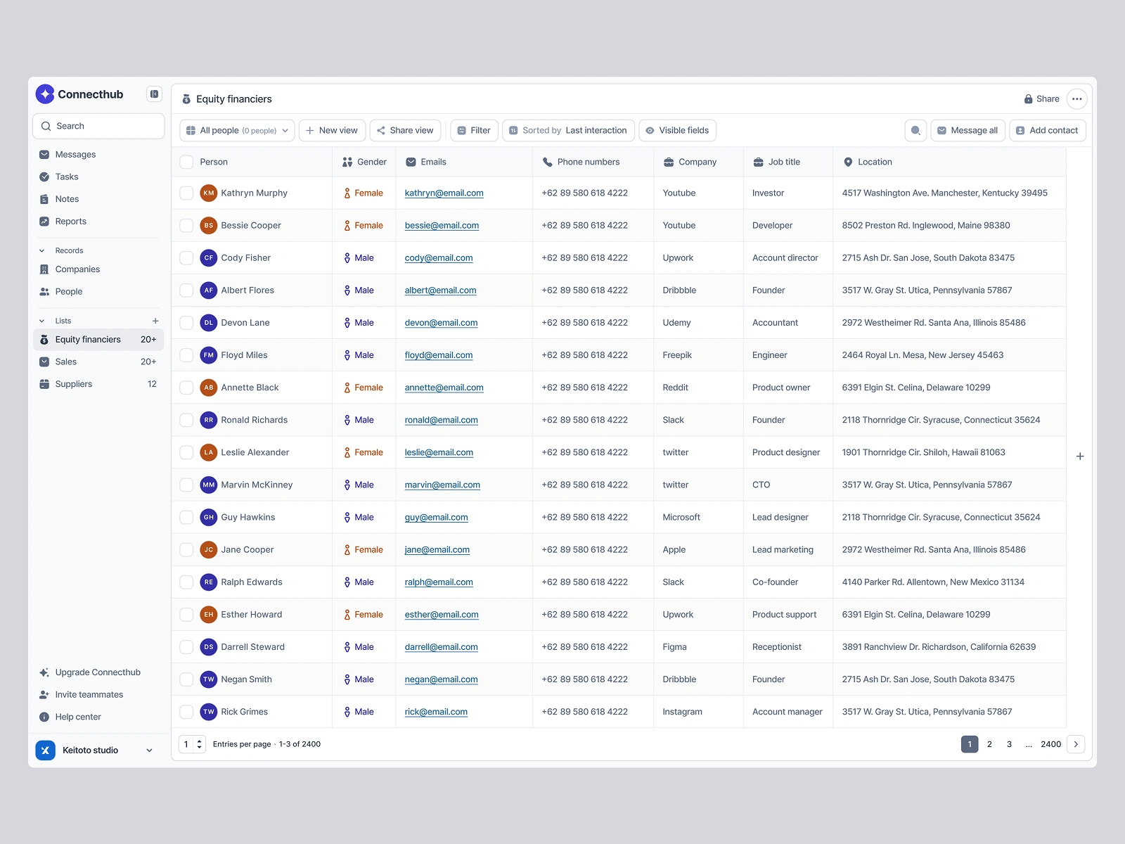 π₯ Import Contact Modal β Organized table view with checkboxes, gender, email, phone, company, and job title columns.