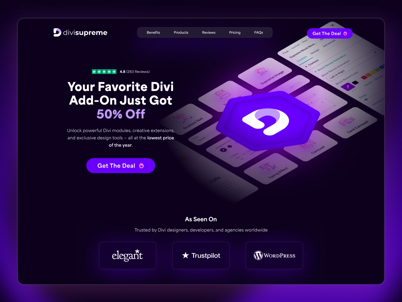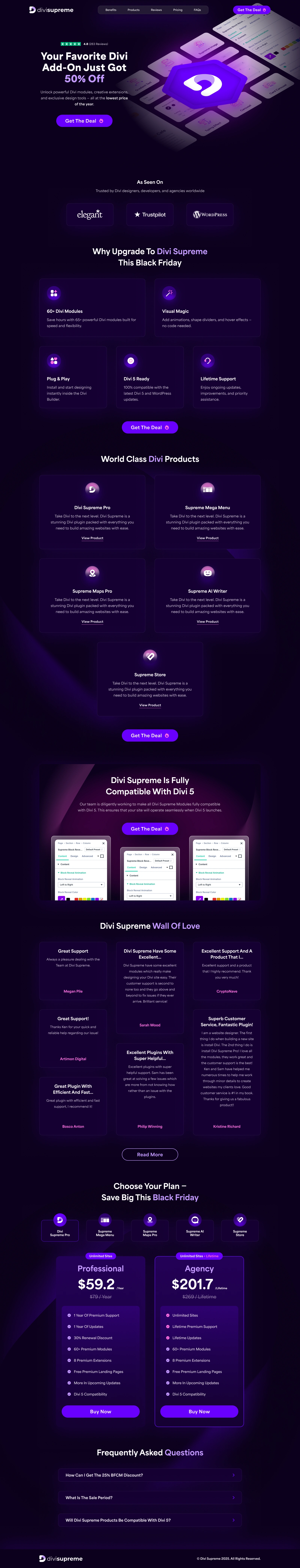 The design highlights Divi Supreme’s 65+ modules, Divi 5 compatibility, and limited time 50% offer, guiding users seamlessly from awareness to purchase. Emphasis was placed on visual hierarchy, urgency, and trust elements such as testimonials and partner badges to build credibility.