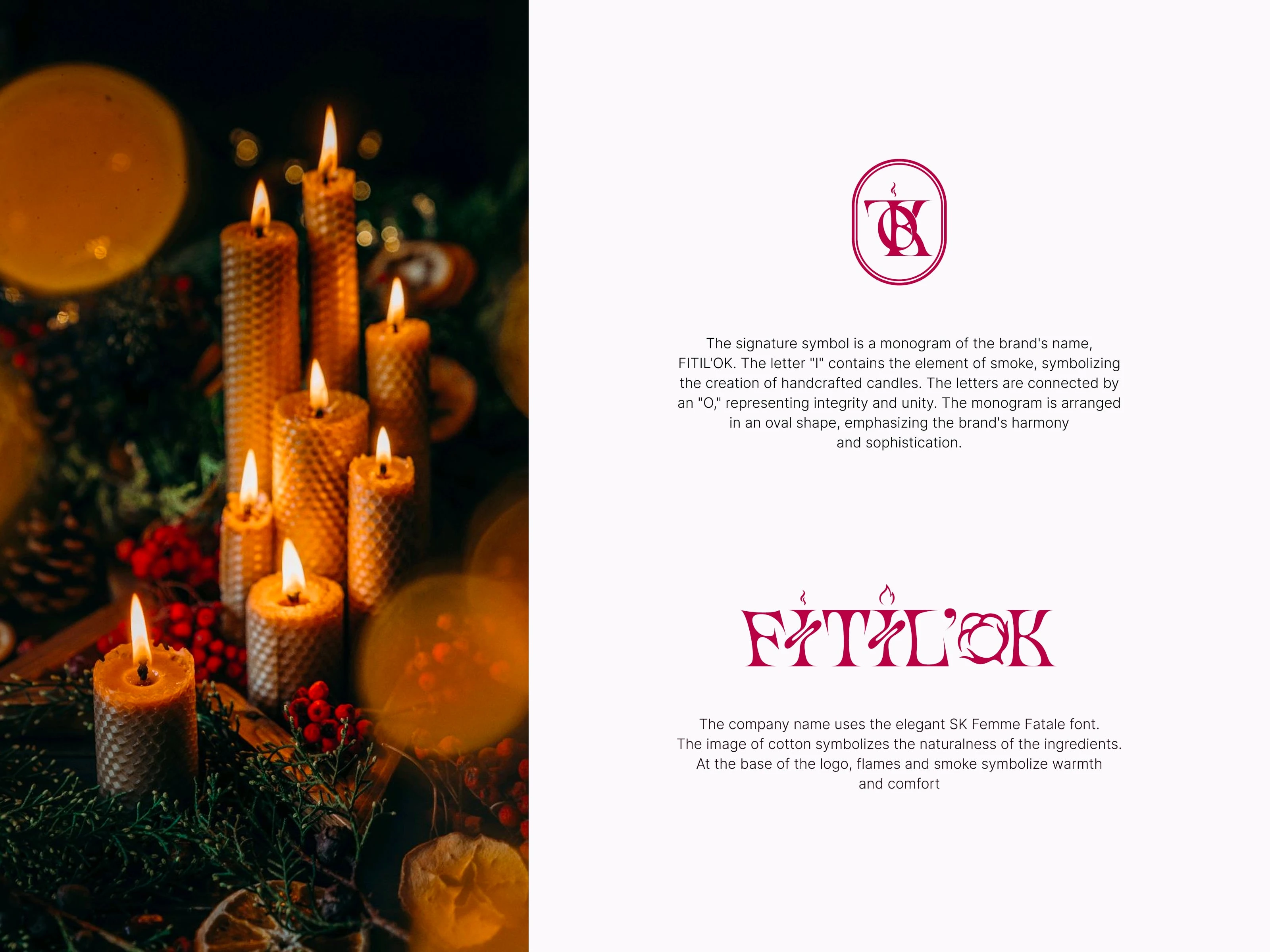 The client, FITIL'OK, is a hand-poured candle brand focused on natural ingredients, coziness, and complex, luxurious aromas. The goal was to develop a distinct visual identity to elevate the brand on the handmade market, attract a new audience, and visually translate the values of natural quality and sophistication.
