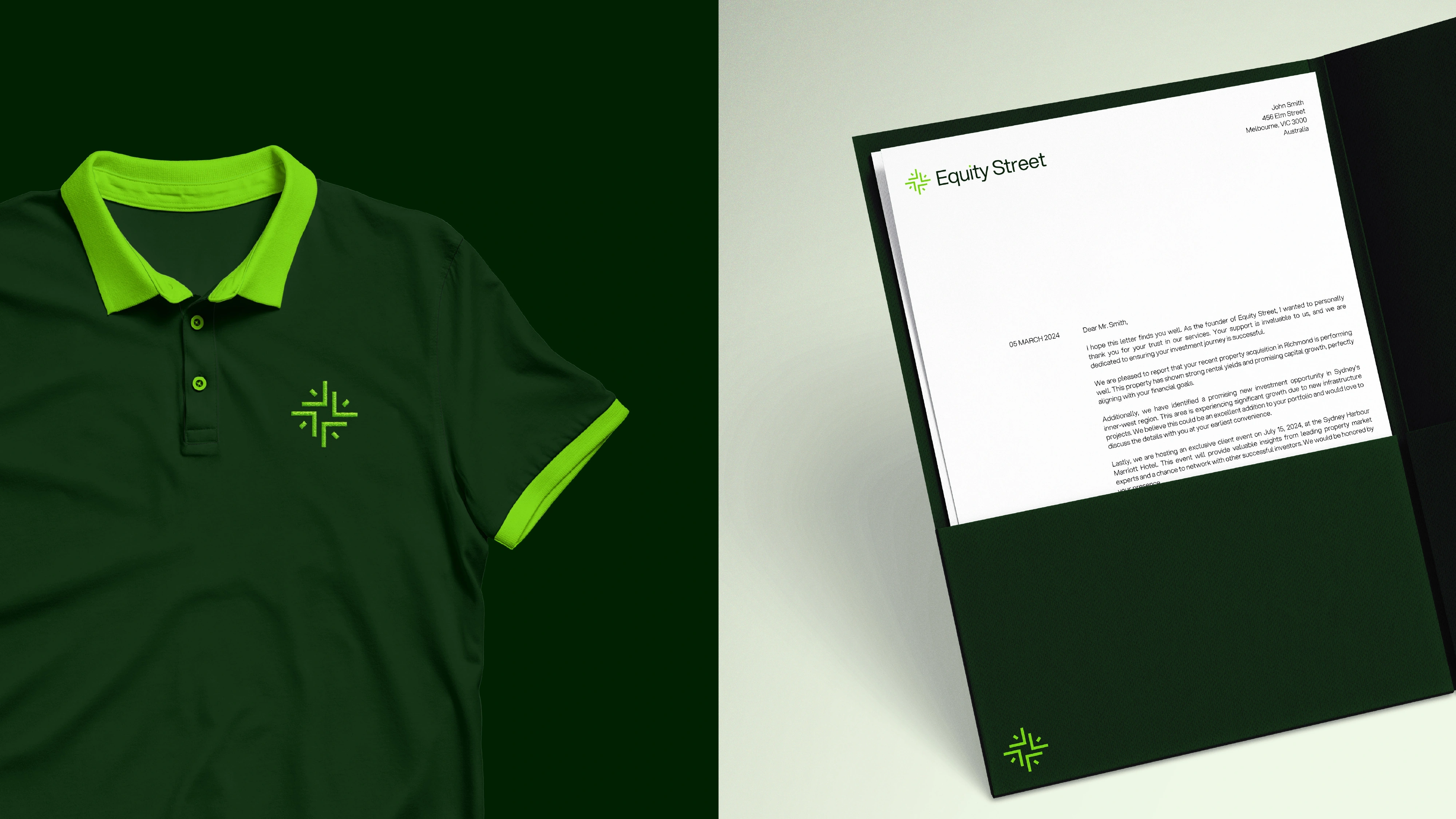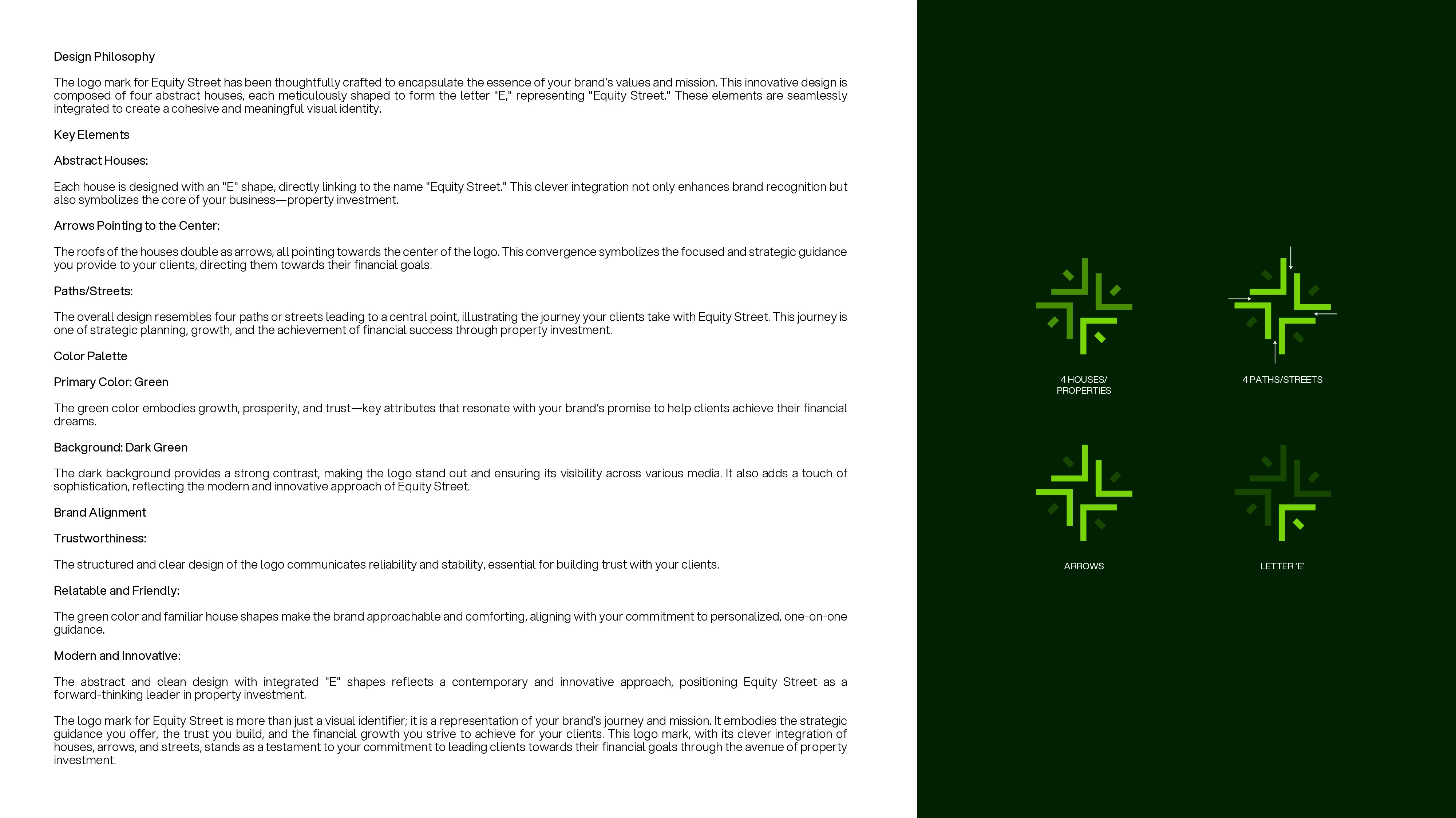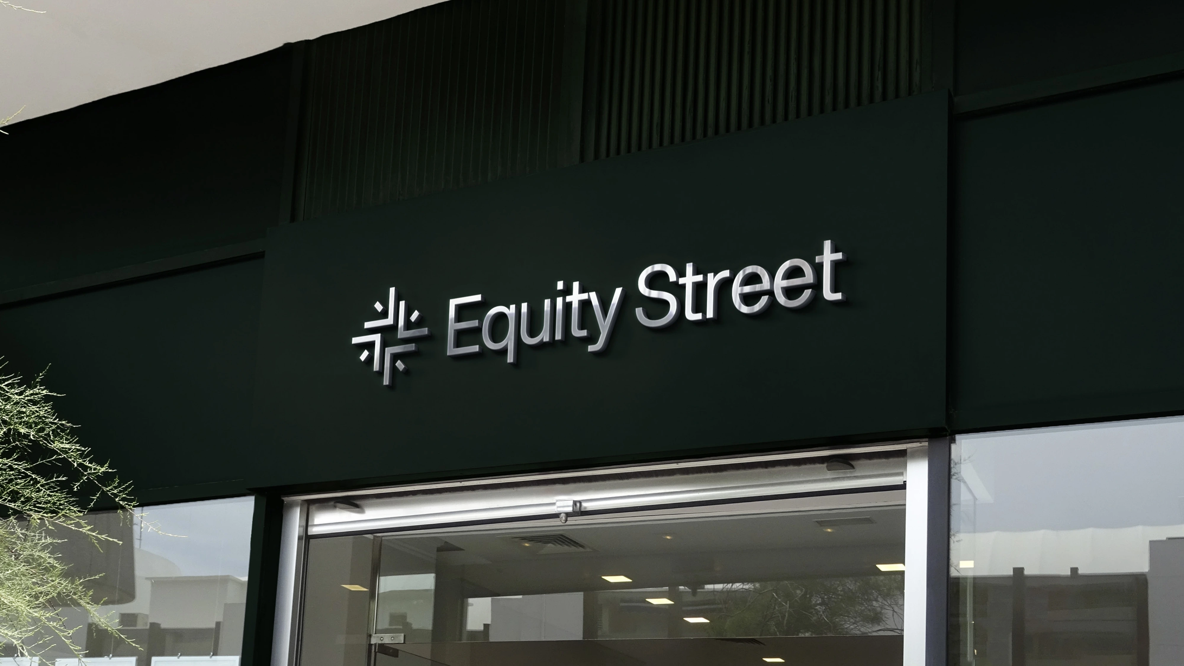 Designed Equity Street’s brand identity using an abstract E built from houses and paths, symbolizing guidance, trust, and growth in property investment.