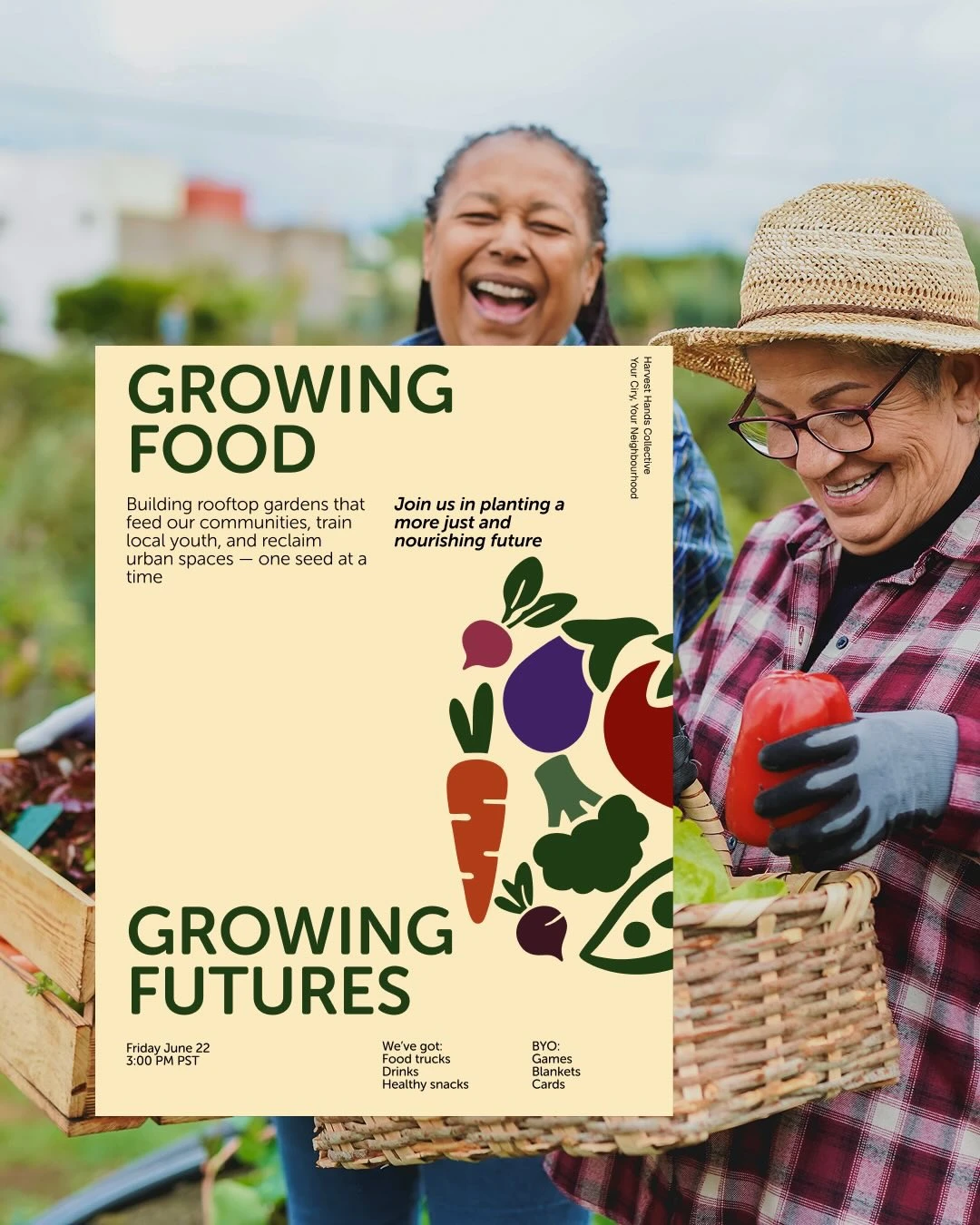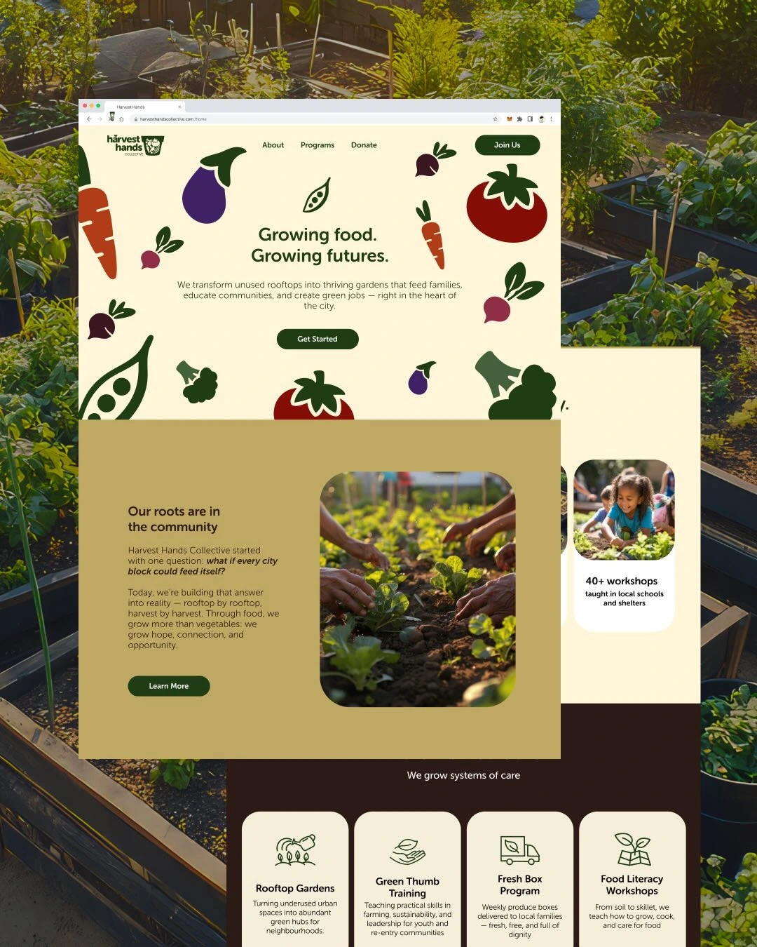 Harvest Hands Collective is a community-focused initiative that empowers individuals through urban farming, food education, and access to fresh produce, all while fostering sustainability. The brand identity was designed to reflect these values, blending earthy tones and organic shapes with modern elements to create a logo that symbolizes growth, community, and sustainability.
