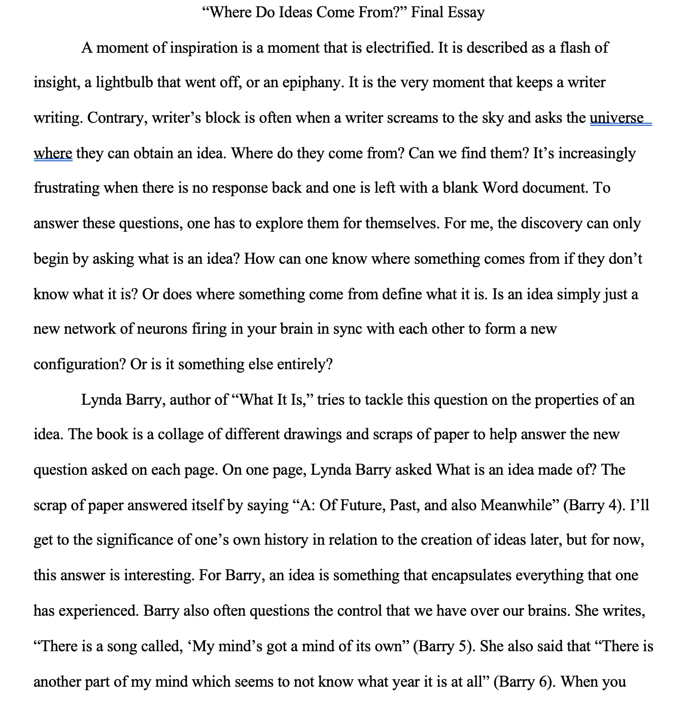 This is the final essay I wrote for a class I took on writing. My professor asked if she could keep it to use to teach future students of the class.