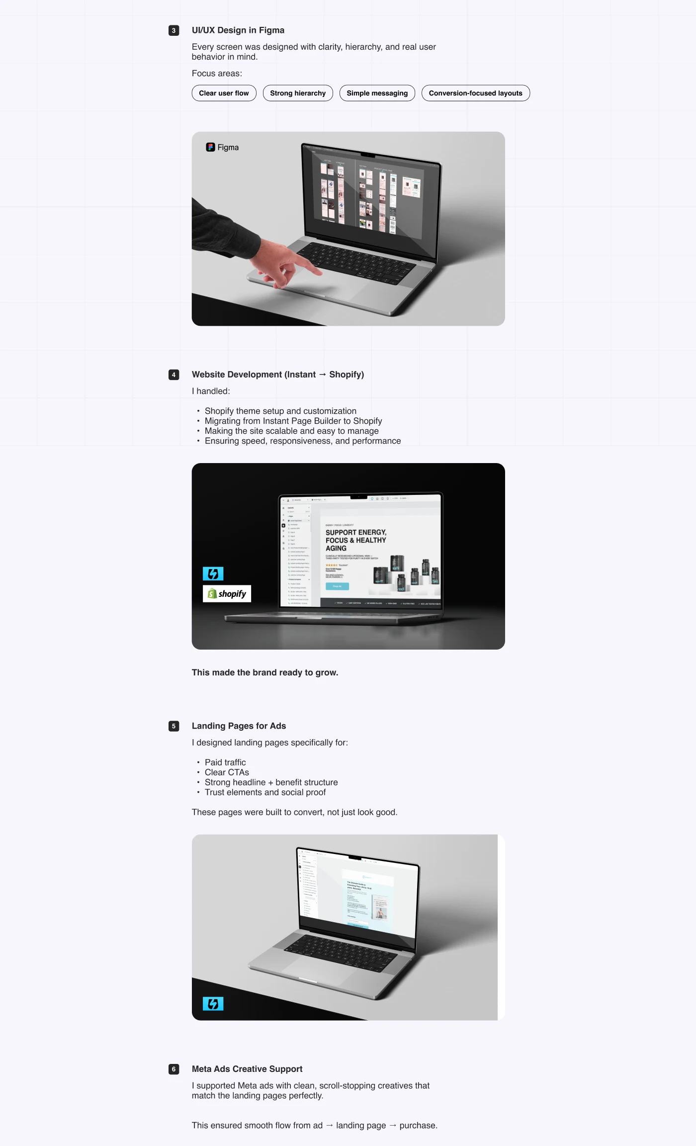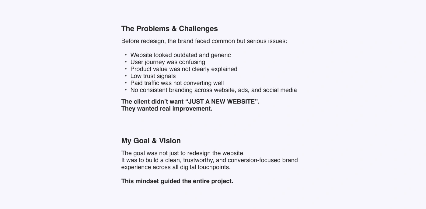 The project turned the website into a conversion-focused experience with better user flow, stronger brand trust, clear messaging, and mobile-optimized pages.