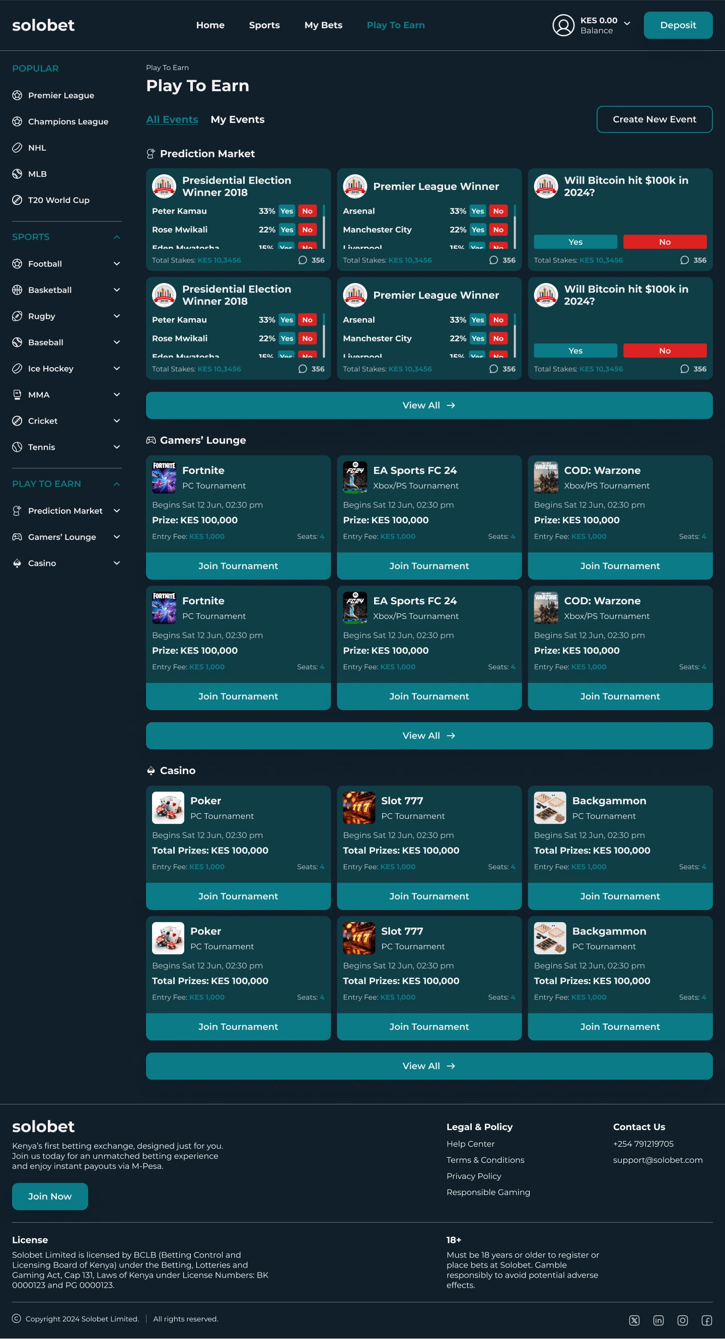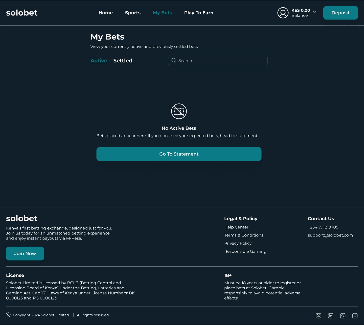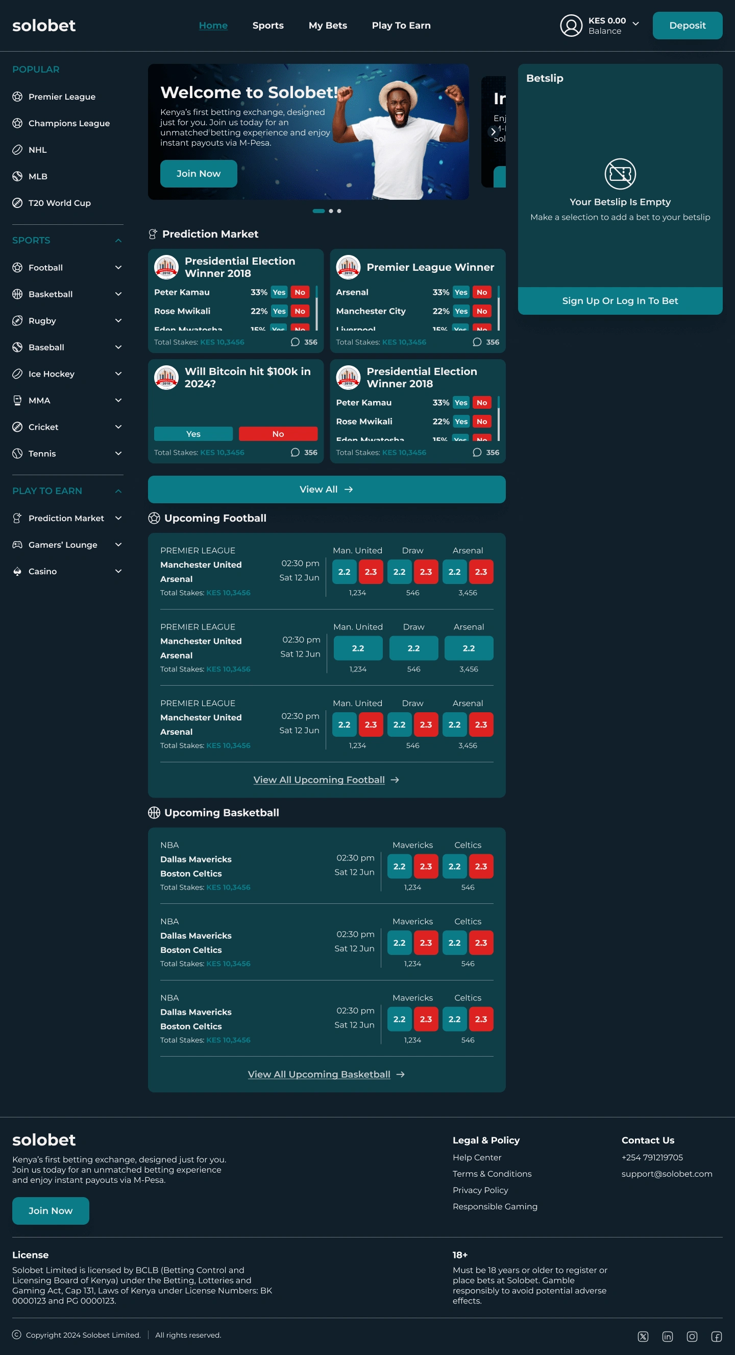 SoloBet is a decentralized peer-to-peer betting platform designed to deliver a seamless, intuitive, and transparent betting experience for users in Kenya and across Africa. Traditional betting platforms often suffer from poor user experiences, high fees, and opaque odds controlled by bookmakers. The project's goal was to design a user-first platform that enhances trust, reduces friction, and ensures fairness through blockchain technology.