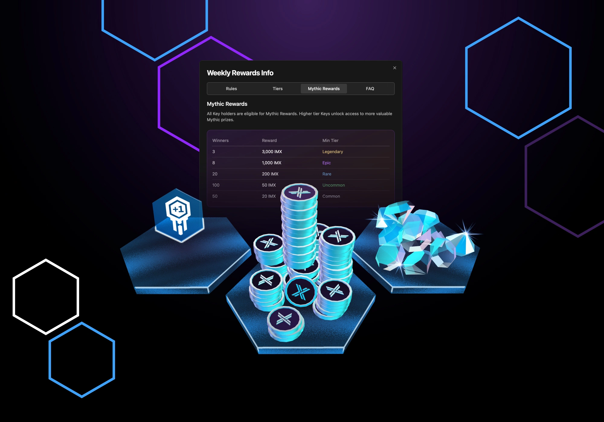 I led the 3D modelling, texturing, and asset animation, while implementing a system of variables that spoke directly to Immutable’s backend. This allowed the experience to dynamically render unique rewards (Gems, IMX tokens, Level Up keys) based on individual player stats.