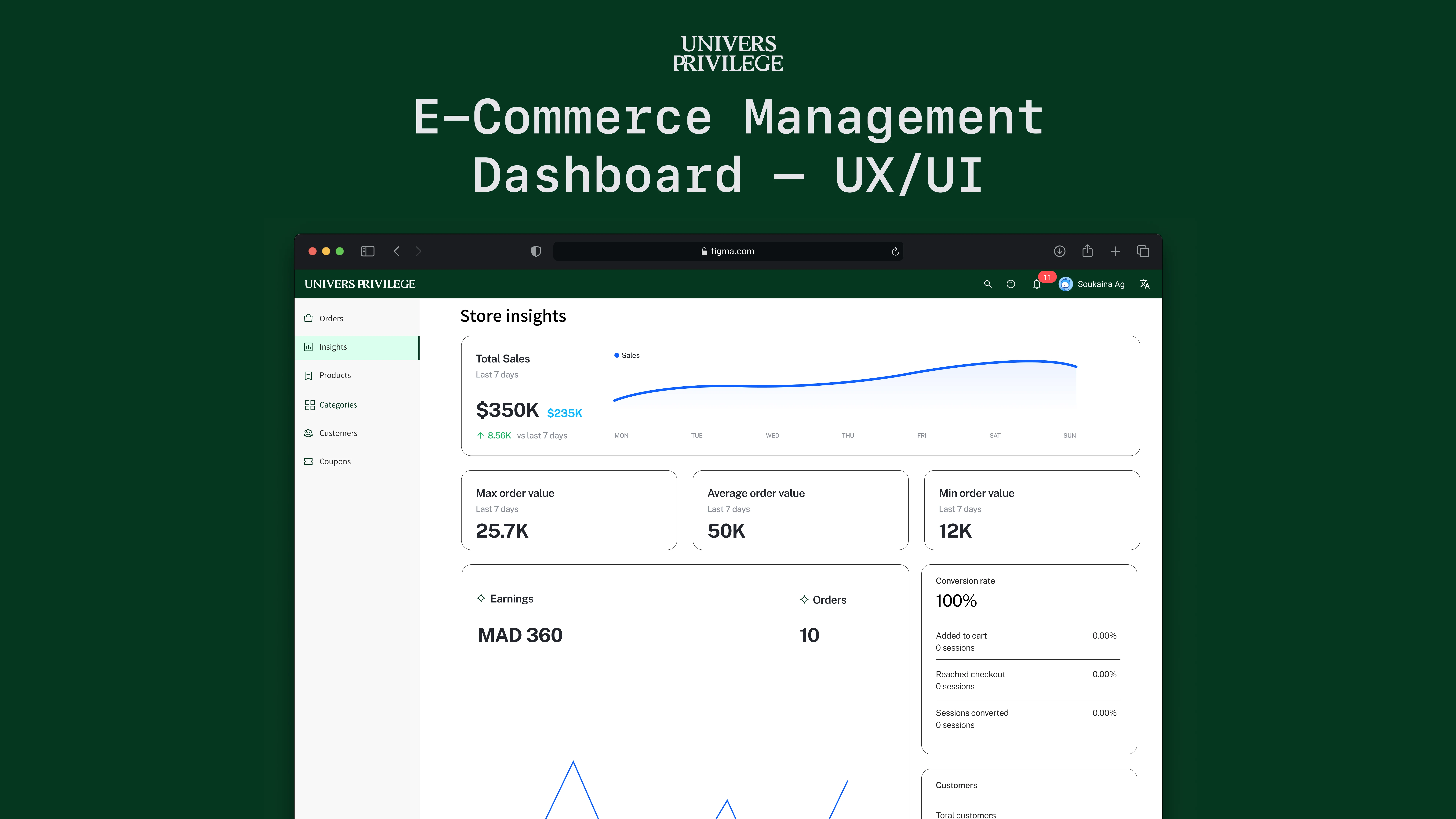 Figma-designed dashboard for e-commerce admins with intuitive navigation, cohesive visuals, and data-driven tools to streamline store management.
