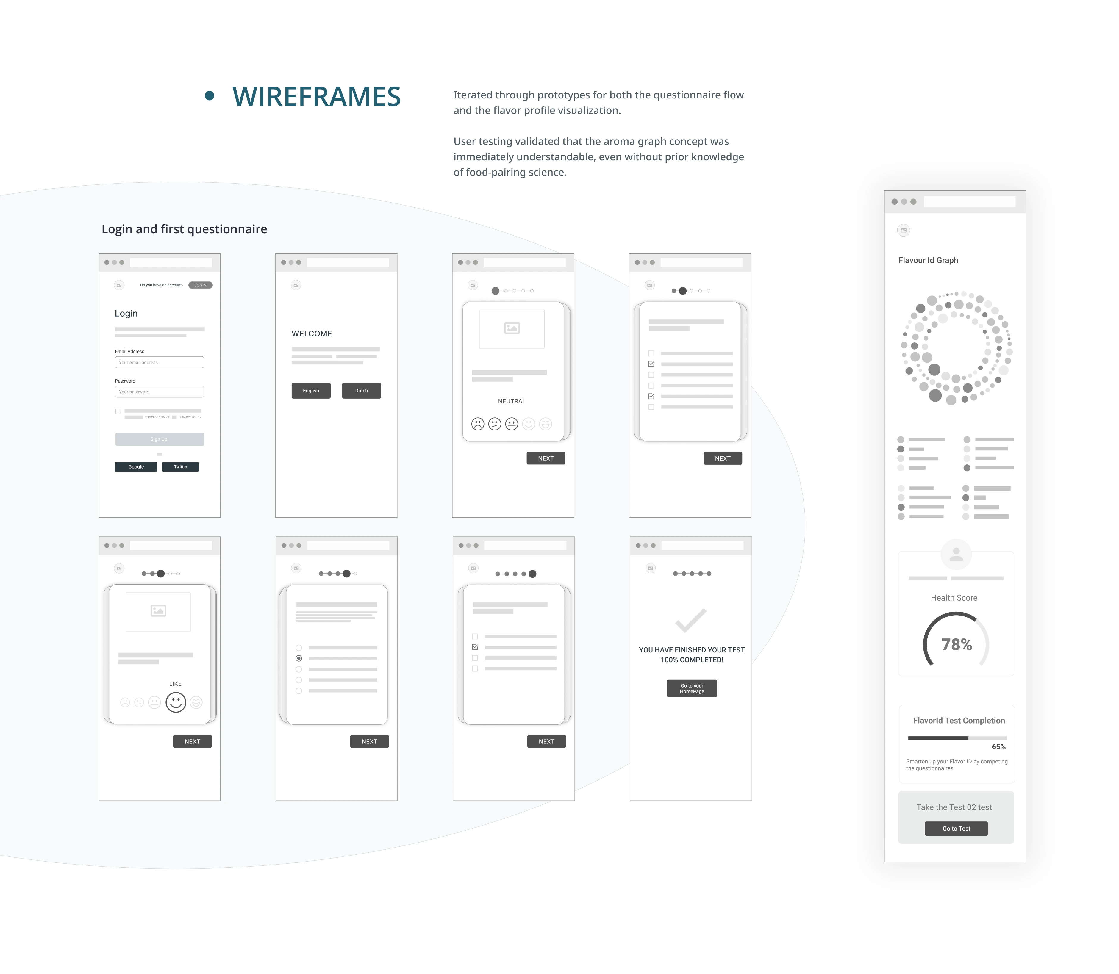 Defined a visual flavor fingerprint, uniquely representing each user's taste. Key features included an intuitive questionnaire, a personalized flavor fingerprint, ongoing profile refinement, and 3rd-party integration. The minimalist interface allowed users to explore their preferences.