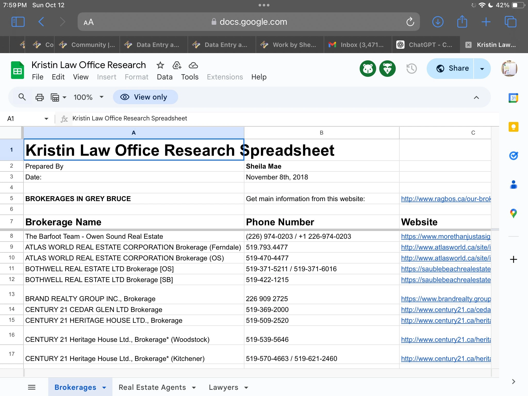 Conducted web research and data entry for Kristin Law Office, compiling accurate legal data and details into an organized research spreadsheet.