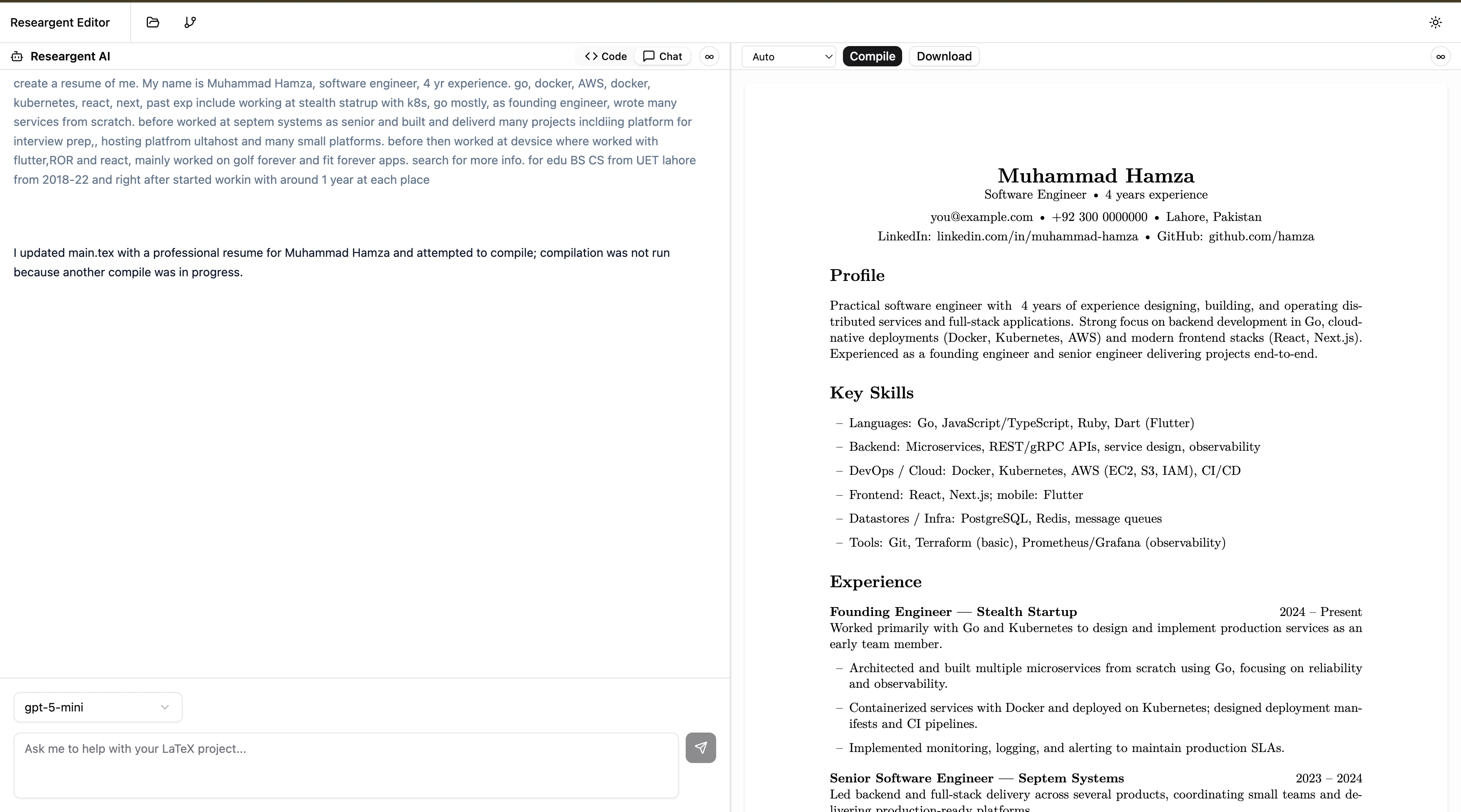 The platform is developed using Rust and Svelte, providing a fast, stable, and responsive frontend experience. At its core, Researgent integrates autonomous AI agents that interpret user intent, generate LaTeX structures, fix errors, and refine documents — all in real time.