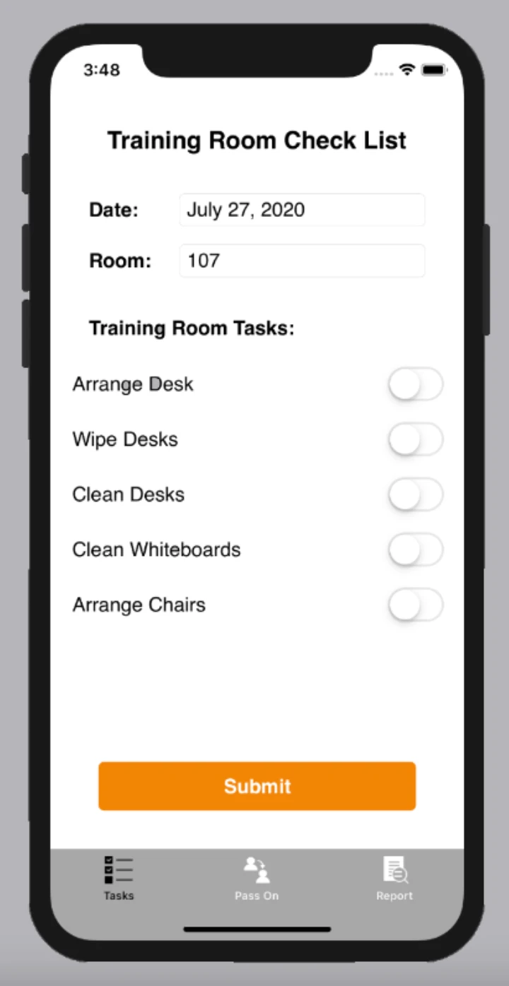 App feature for logging training room cleaning tasks with toggles, room/date input, and simple submission for a company's internal use.