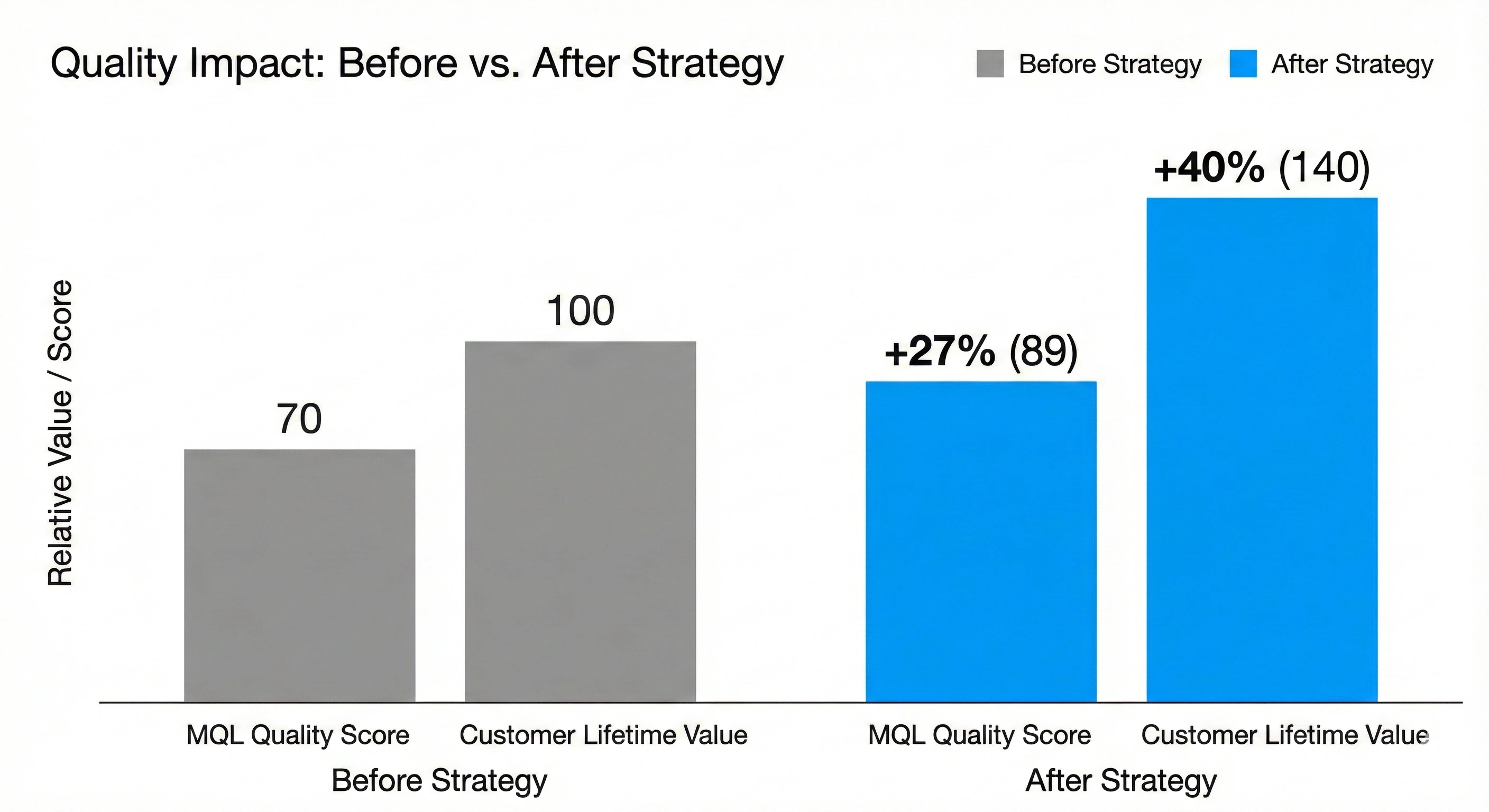 Long-Term Value: The strategic focus on quality over quantity improved overall MQL quality by 27% and boosted Customer Lifetime Value (CLTV) by 40%.