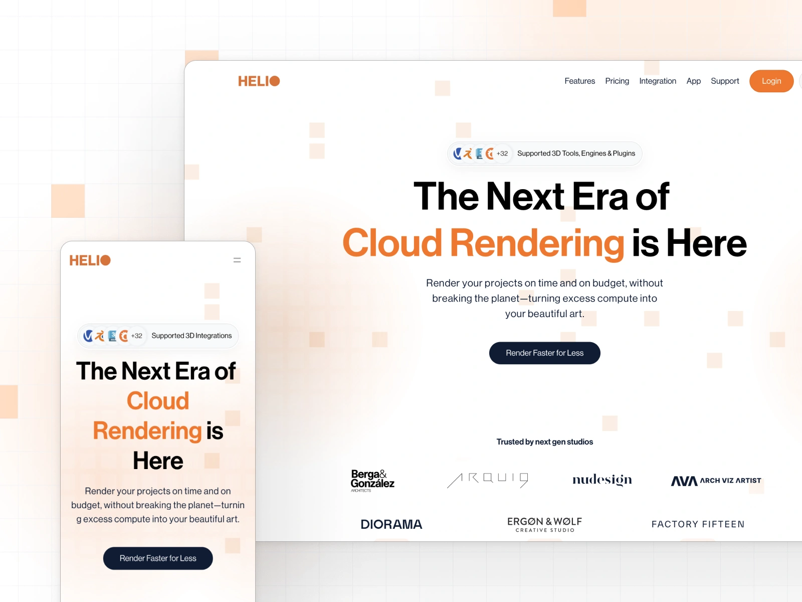 We brought Helio’s seamless integrations and streamlined workflows to life with animations that clearly illustrate how the platform fits into existing pipelines, helping 3D studios quickly see the benefits. The design also highlights Helio’s commitment to sustainable rendering through clean visuals and subtle animations that emphasize their environmental impact.