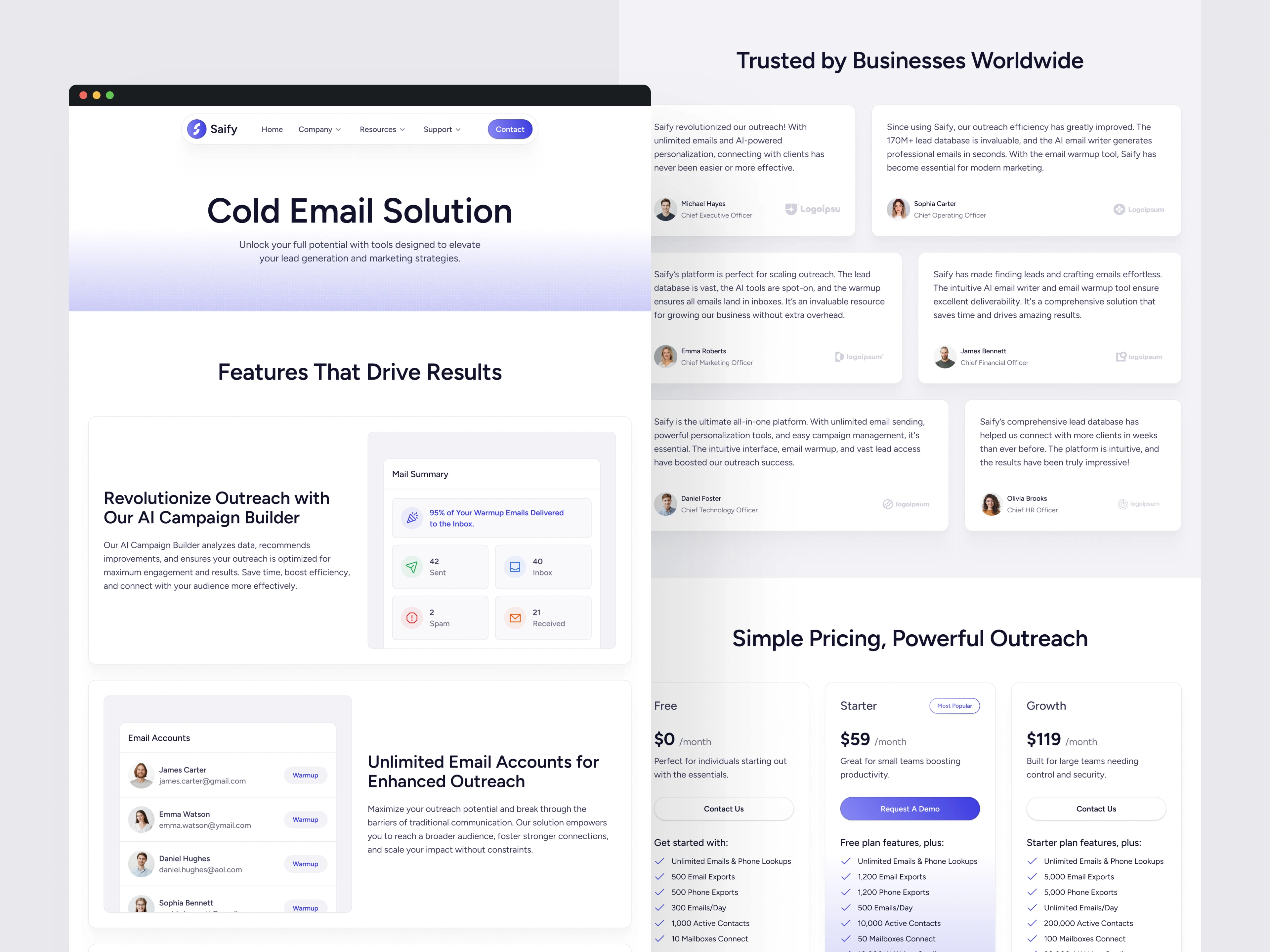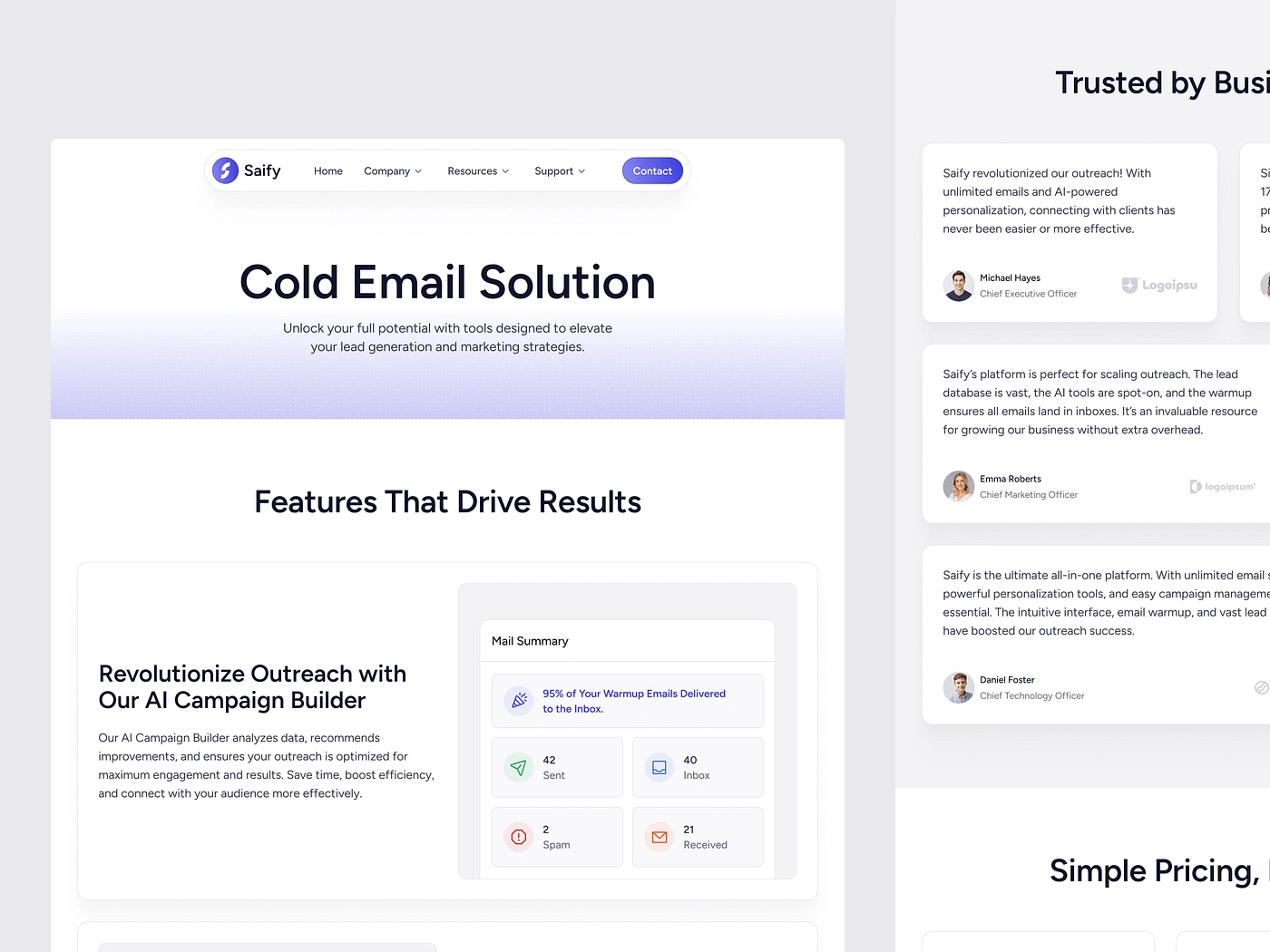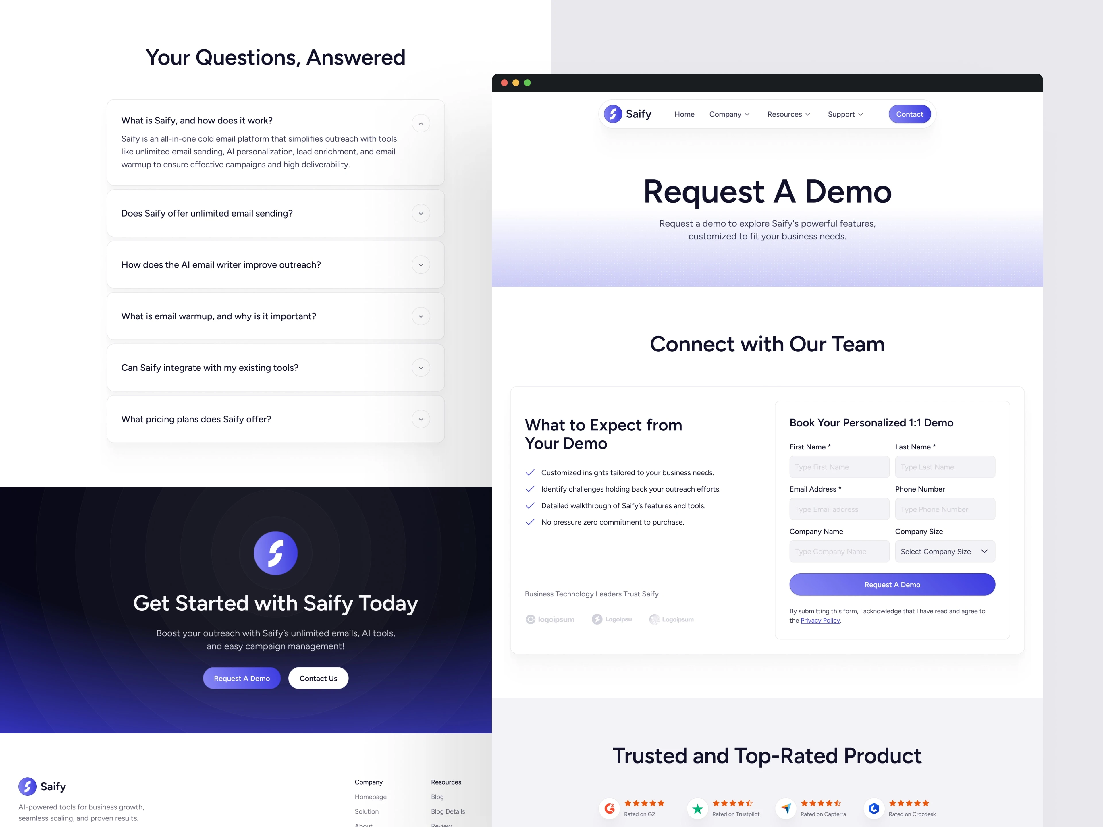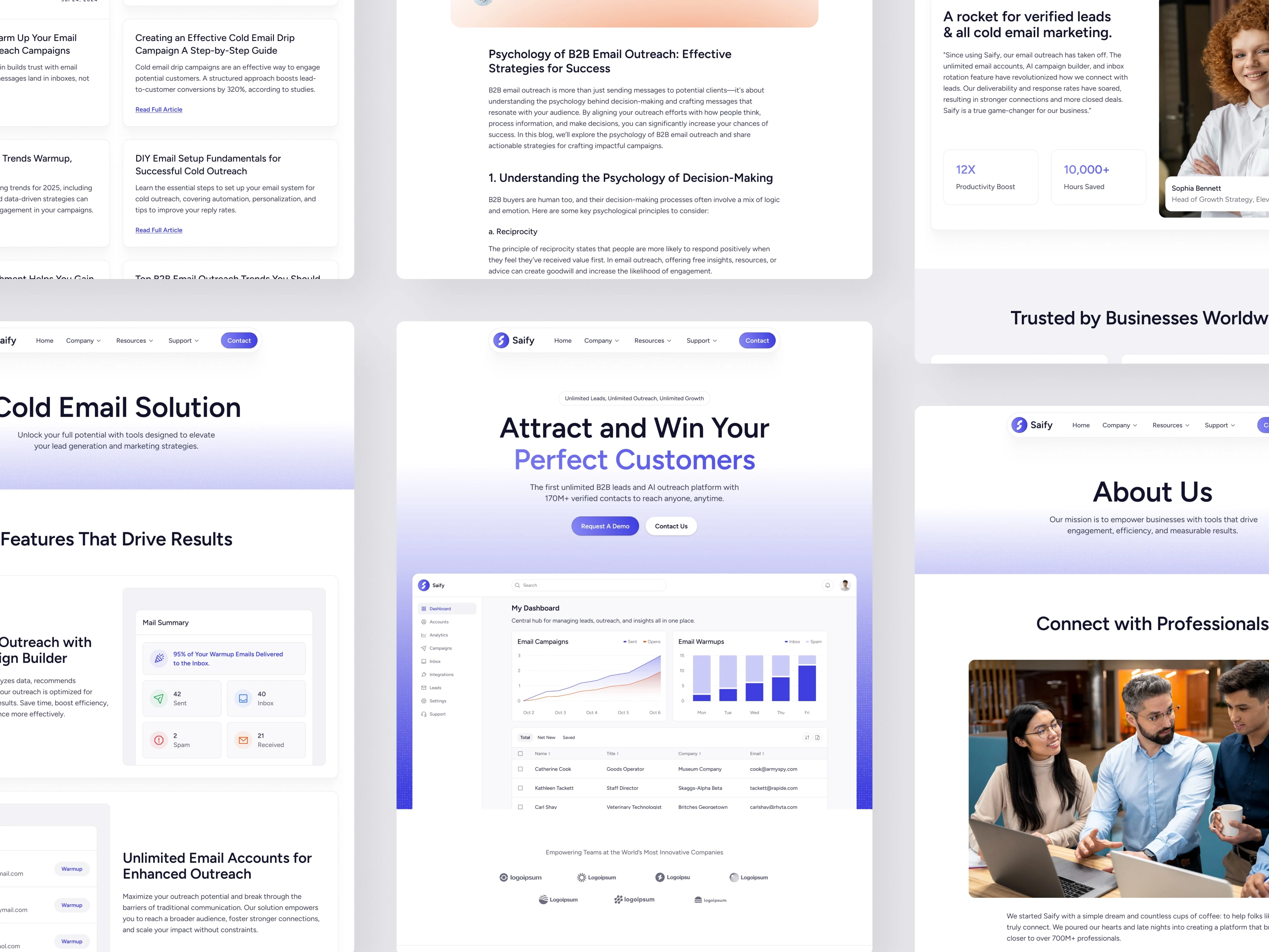 Saify delivers a conversion-optimized template ecosystem built specifically for email marketing SaaS credibility. First, a Comprehensive SaaS Architecture with 14 essential pages including Home, Solution, About Us, Pricing, Blog, Blog Single (CMS-enabled), Reviews, FAQ, Careers, Request Demo, Contact, Privacy Policy, Terms & Conditions, and 404—covering every touchpoint in the SaaS buyer journey.