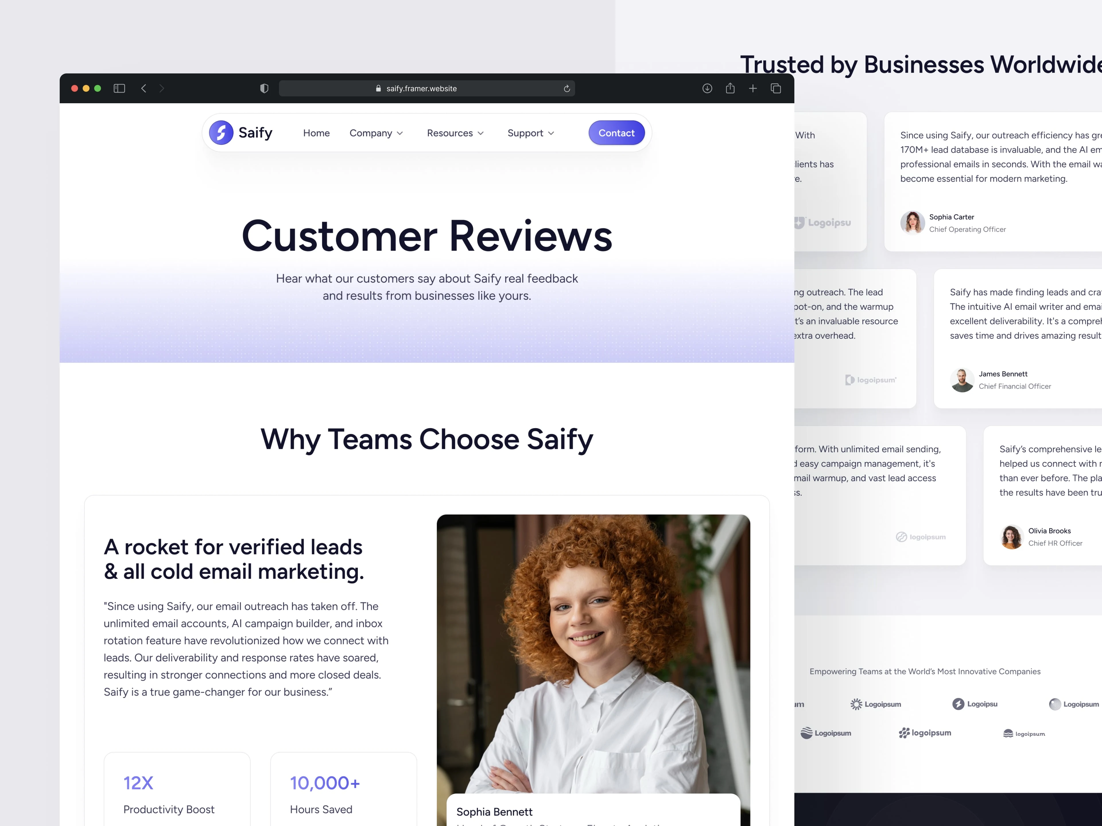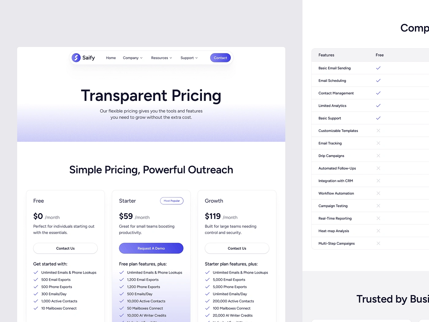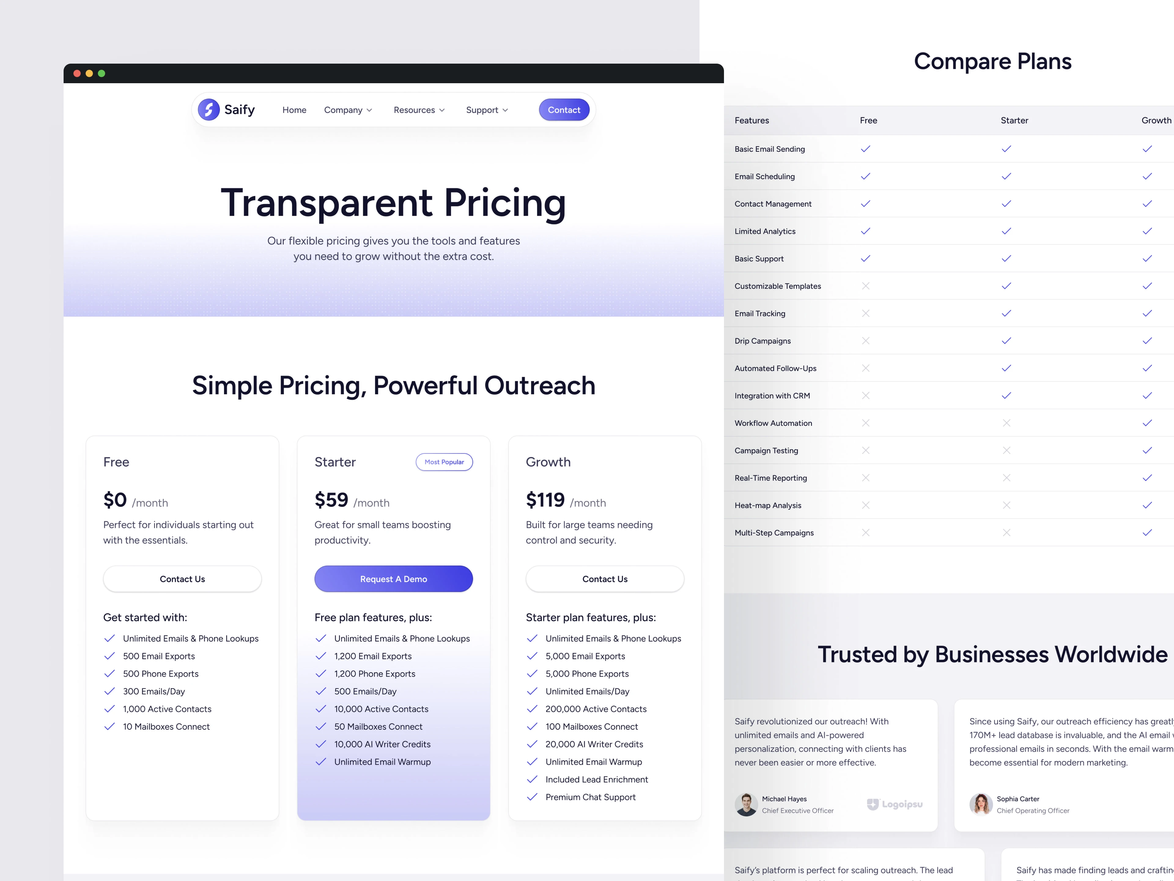 Saify delivers a conversion-optimized template ecosystem built specifically for email marketing SaaS credibility. First, a Comprehensive SaaS Architecture with 14 essential pages including Home, Solution, About Us, Pricing, Blog, Blog Single (CMS-enabled), Reviews, FAQ, Careers, Request Demo, Contact, Privacy Policy, Terms & Conditions, and 404—covering every touchpoint in the SaaS buyer journey.