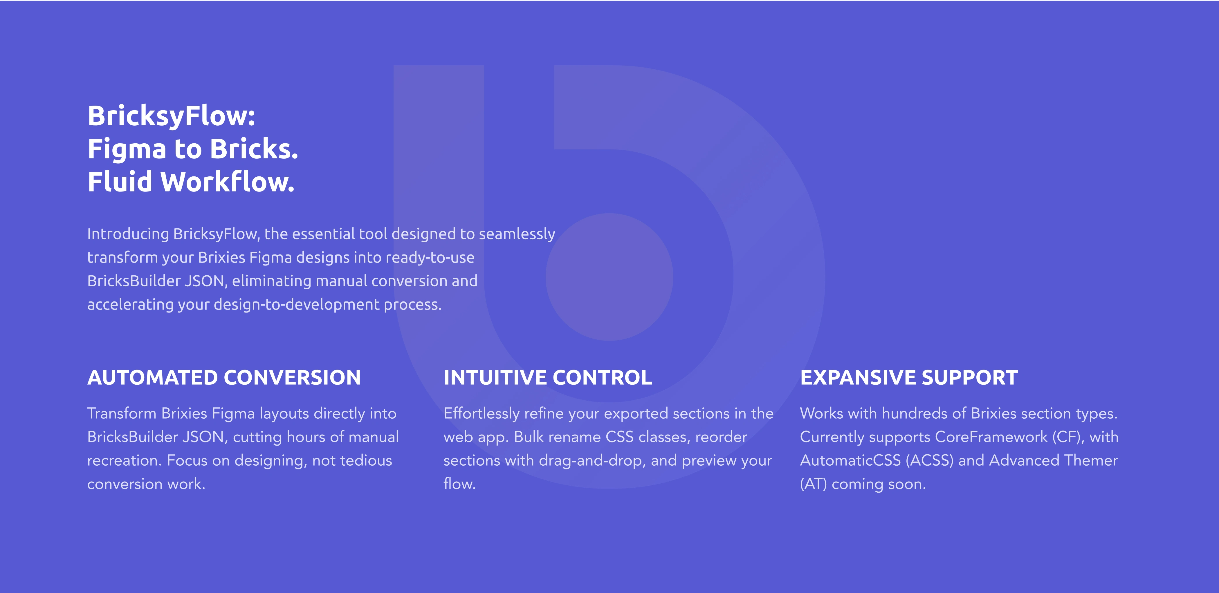 BricksyFlow turns your Figma designs into BricksBuilder JSON instantly. Save hours with automated exports, bulk CSS renaming, and a faster workflow.