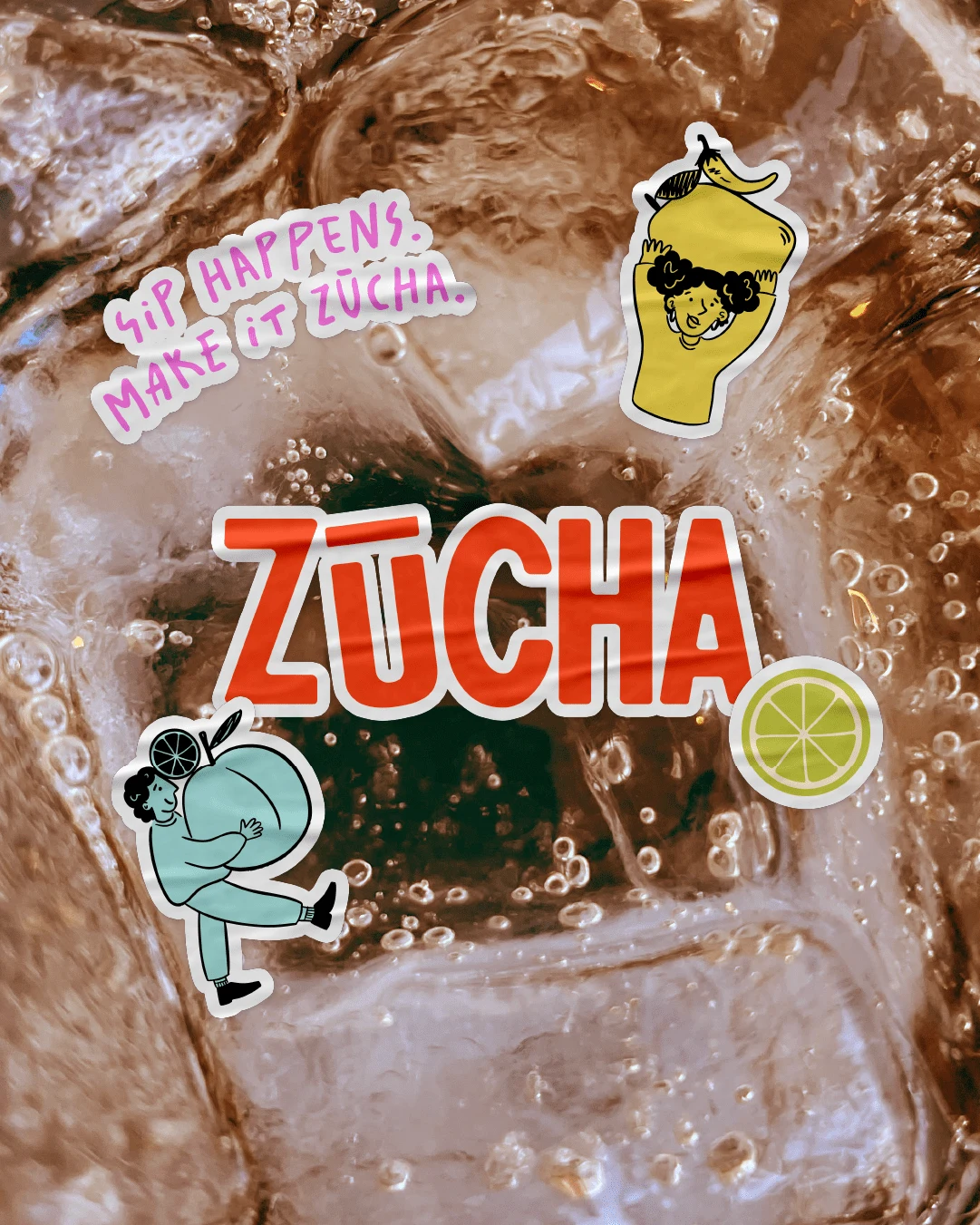 We created a vibrant, energetic identity built around playful character illustrations that capture the personality of each flavour. Bold colours, expressive typography, and a distinctive can and bottle design work together to make Zūcha instantly recognisable on the shelf.