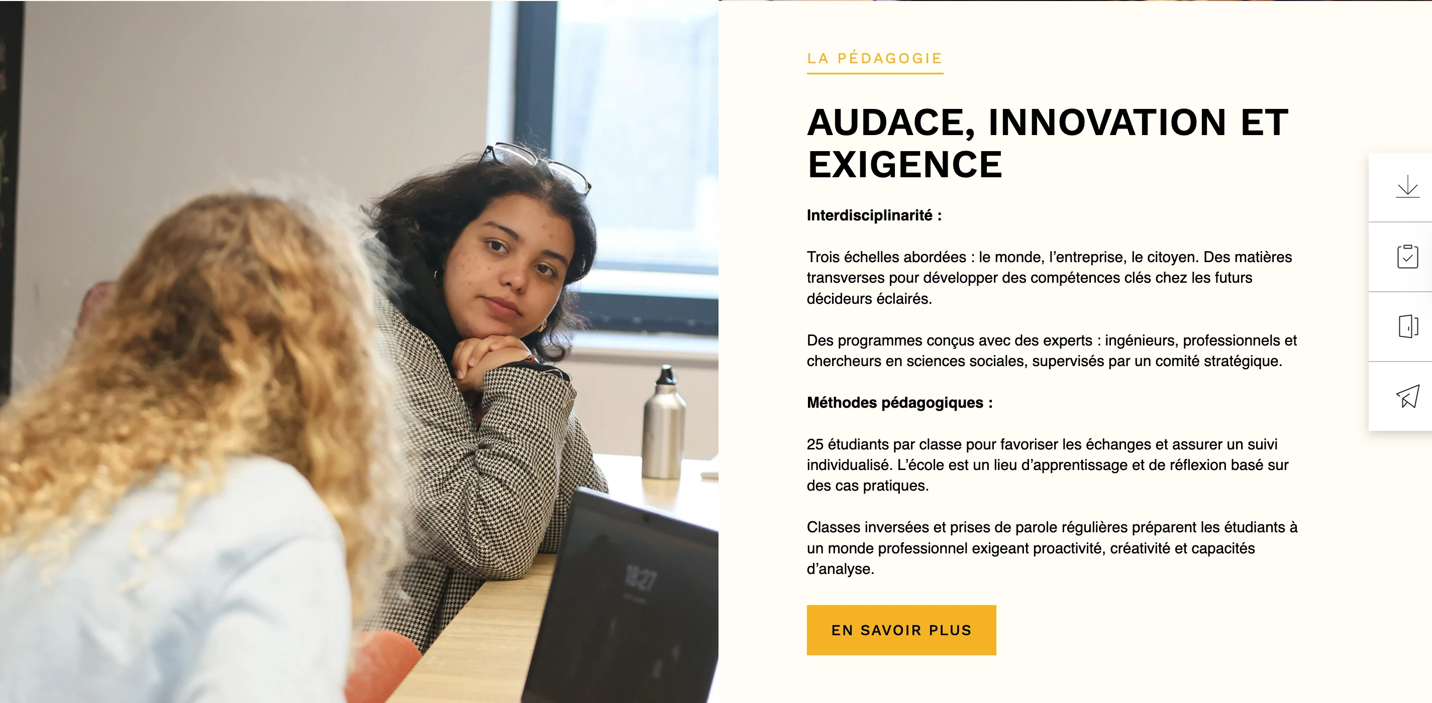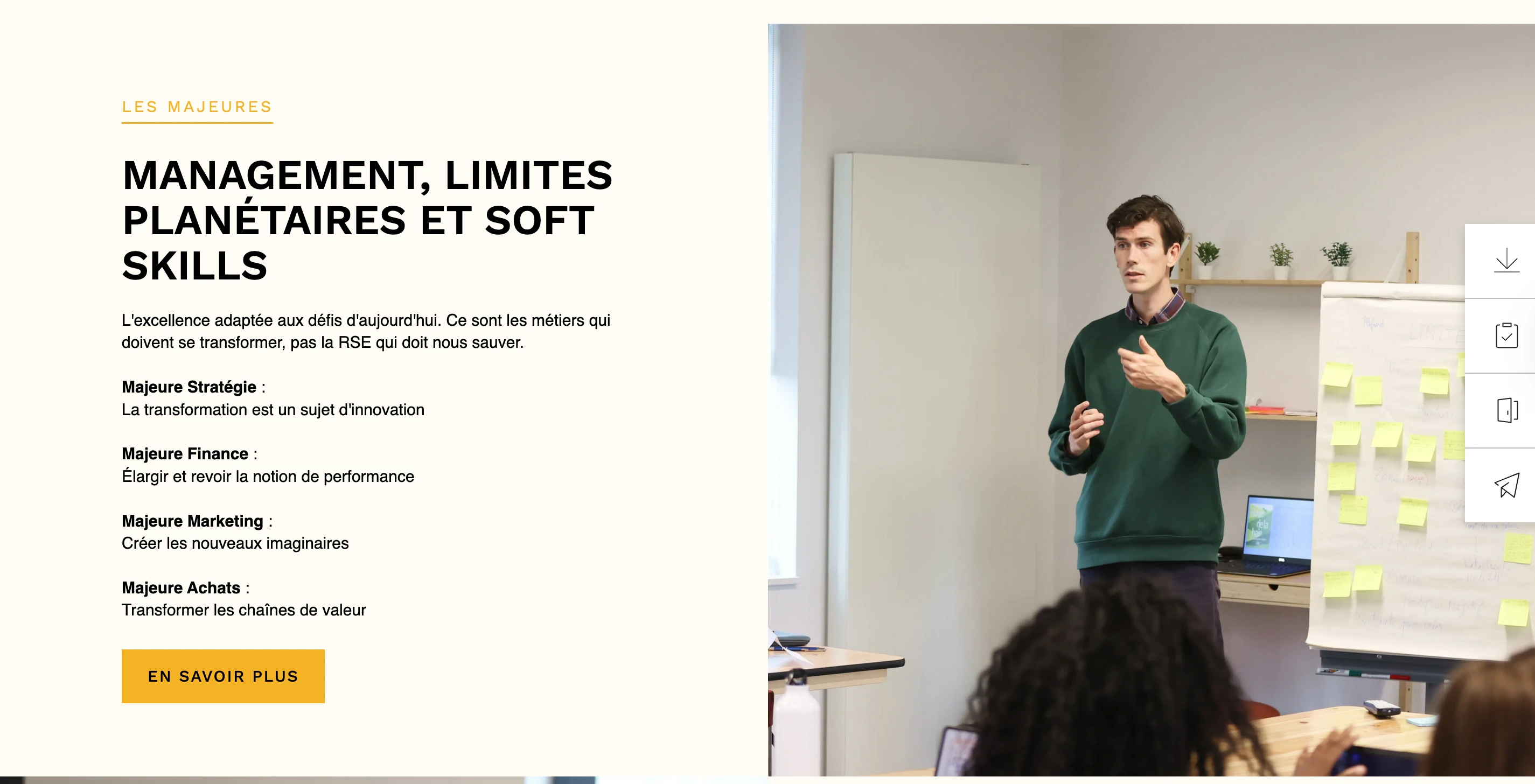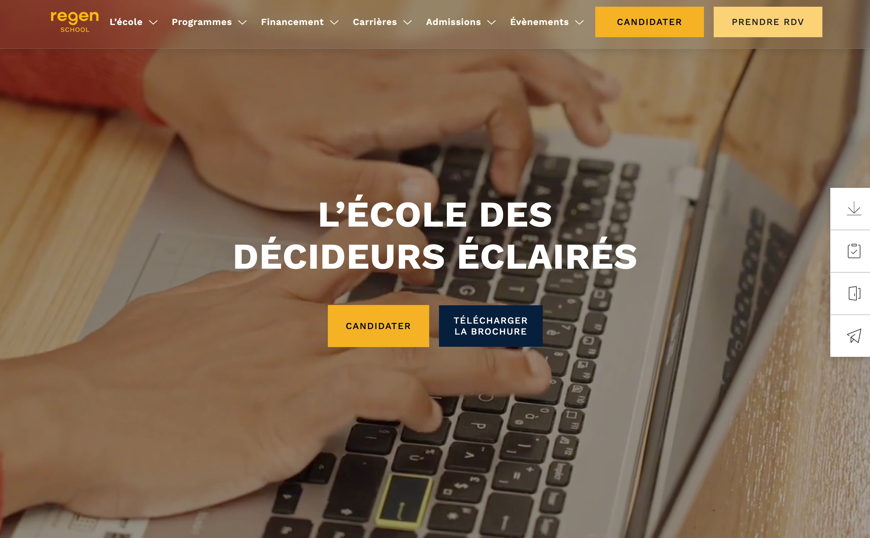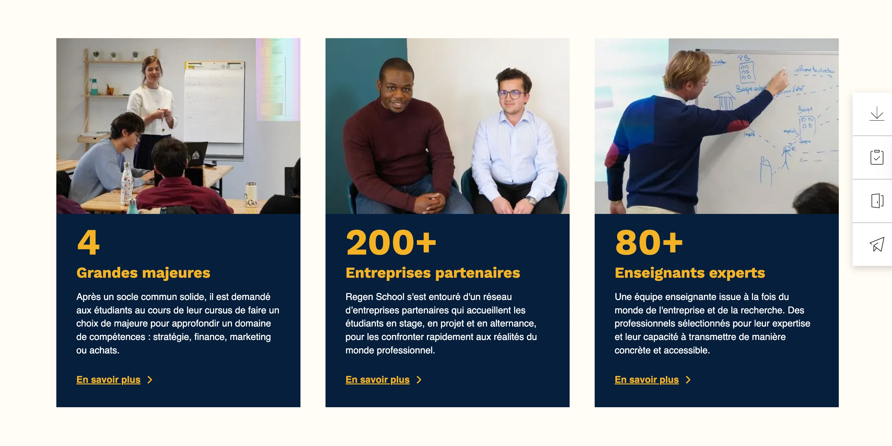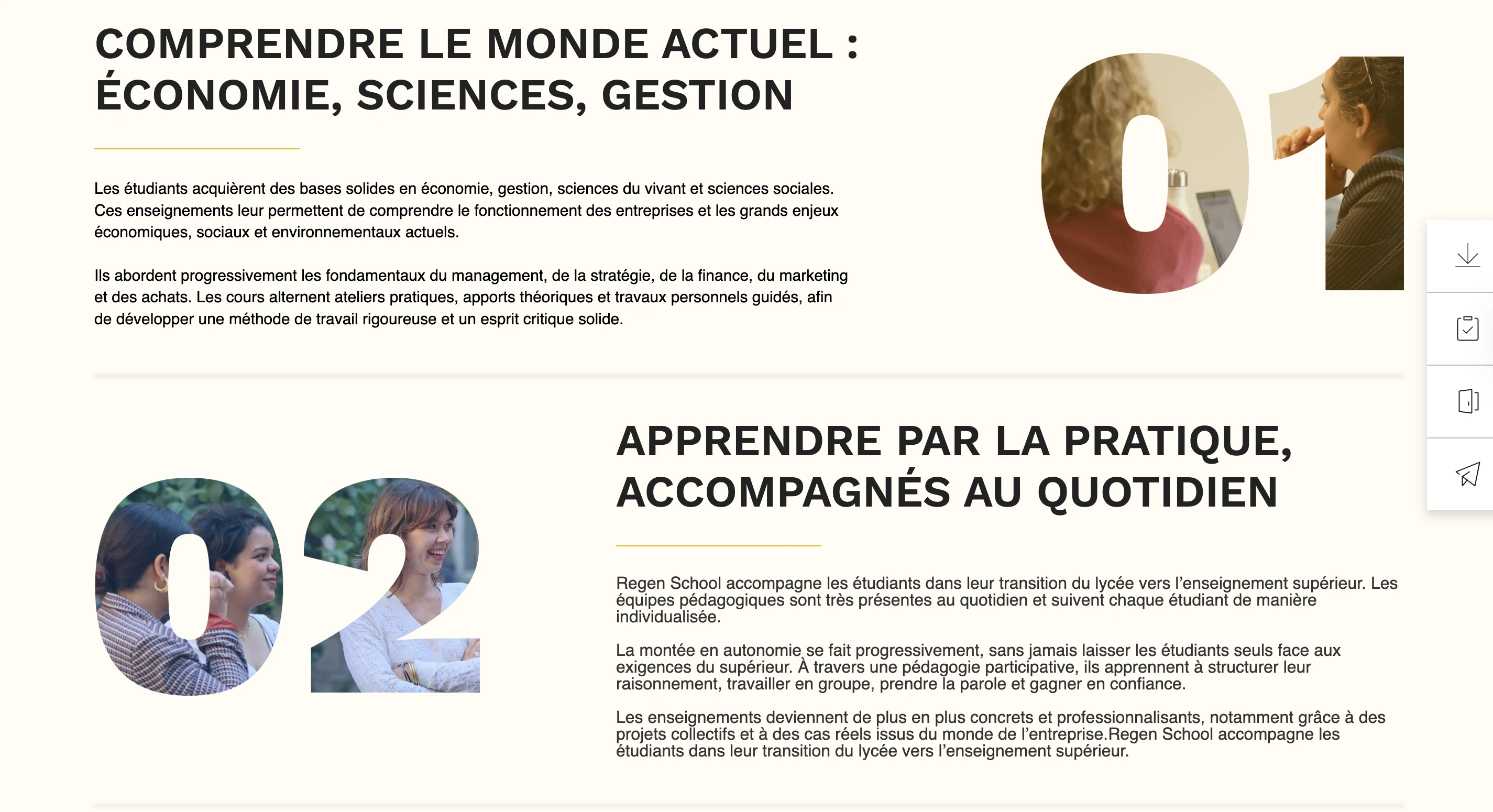 Before any design work began, I led a strategic phase to define Regen School's digital positioning. This involved understanding their unique value proposition, training "activistes en entreprise" across four key majors (Strategy, Finance, Marketing, Purchasing), and translating it into a compelling digital narrative. The strategy established clear user journeys from discovery to application.