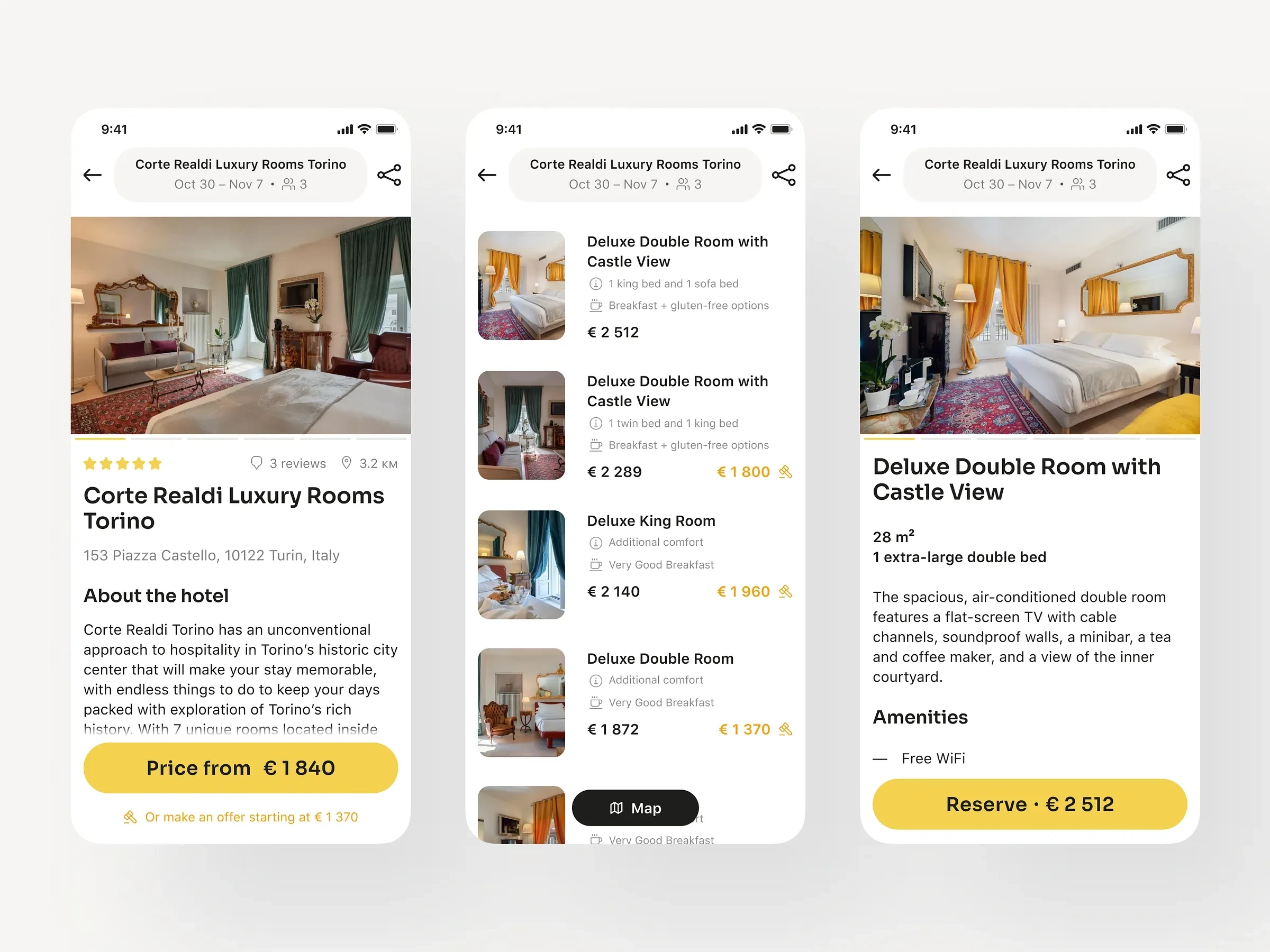 Developed high-fidelity mobile screens, including search, listing, map view, and booking details.